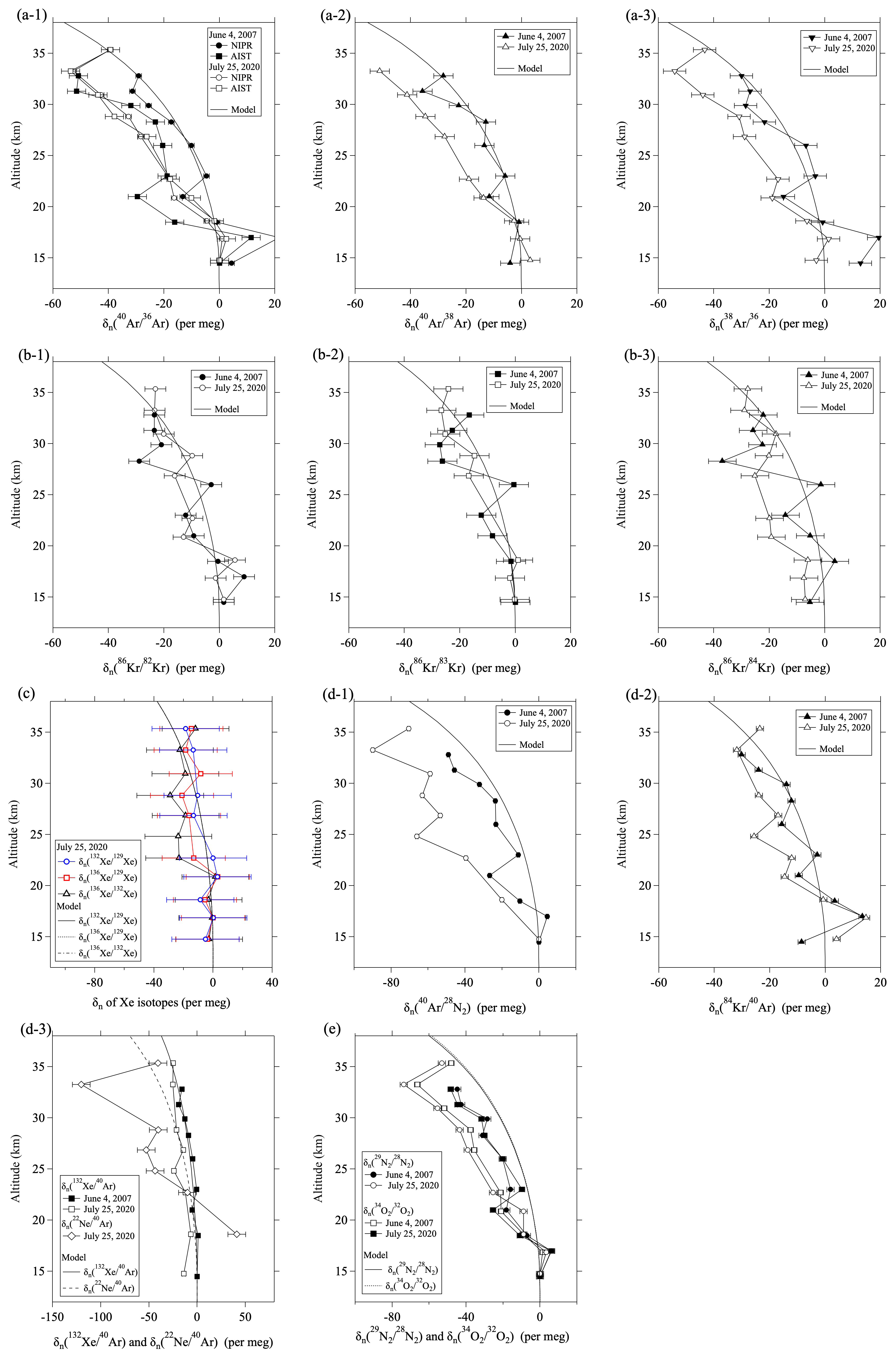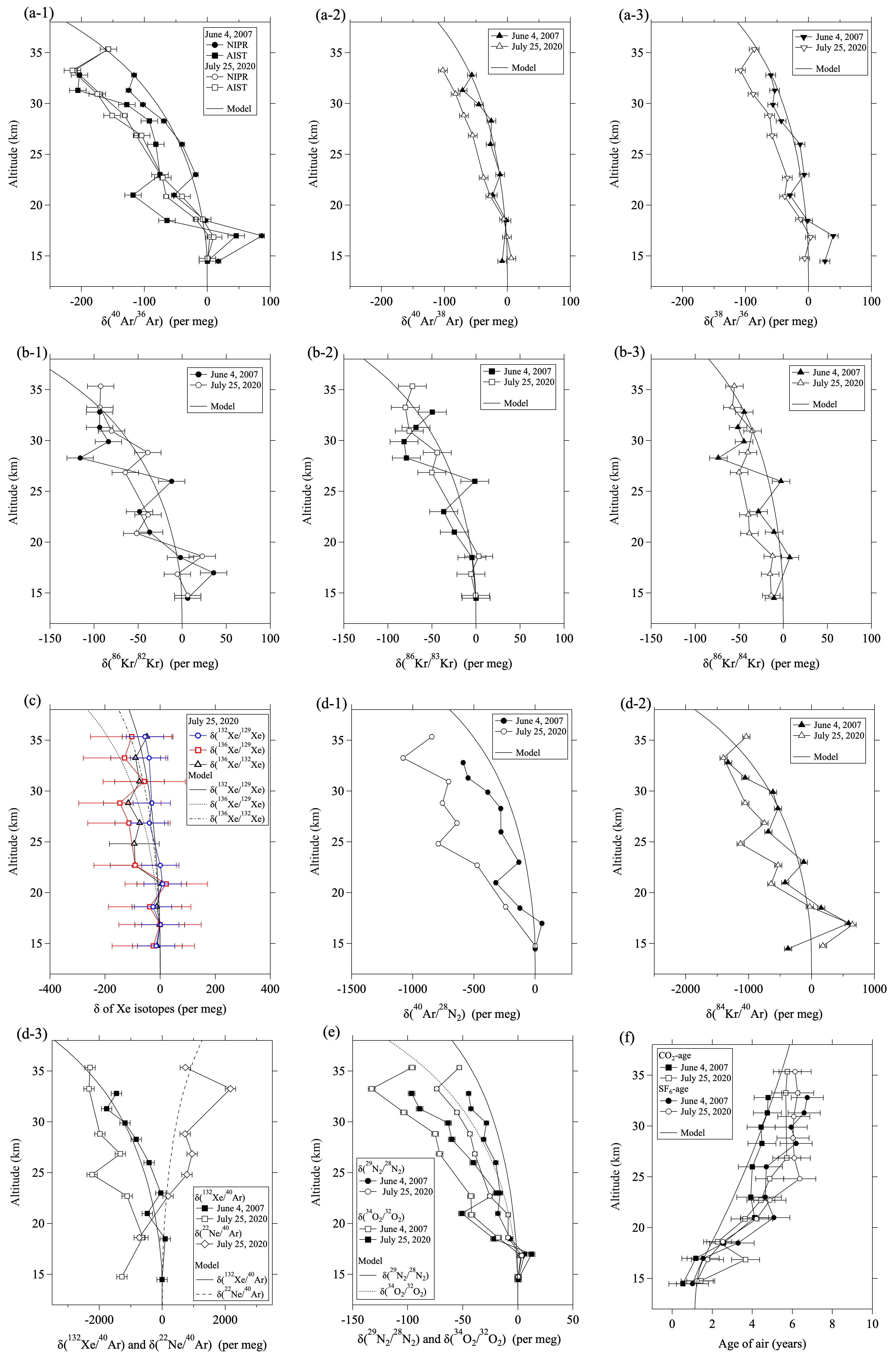Figure 2 shows the vertical profiles of the isotopic and elemental ratios of the noble gases, the δ(29N2/28N2) and δ(34O2/32O2), and the CO2- and SF6-ages observed in the stratosphere over Japan on 4 June 2007 and 25 July 2020. Balloon observation data are summarized in Tables S1 and S2 in the Supplement. It should be noted that the isotopic and elemental ratios of noble gases measured at the NIPR were expressed as the values relative to the ground surface air at Tachikawa, as described in Sect. 2.2. However, the δ(29N2/28N2), δ(34O2/32O2), δ(40Ar/28N2), and δ(40Ar/36Ar) measured at AIST were expressed relative to the values observed in the lowest layer of the balloon observations. Although there are very few observations of the isotopic and elemental ratios of atmospheric major components in the upper troposphere, aircraft observations have reported that there is no significant vertical gradient of δ(29N2/28N2) and δ(34O2/32O2) from the surface to near the tropopause (Ishidoya et al., 2008a). On the other hand, Bent (2014) observed δ(40Ar/28N2) in air samples obtained by the HIAPER Pole-to-Pole Observations (HIPPO) project and reported a large vertical gradient in troposphere. However, such vertical gradient could not be explained by a 1-D atmospheric diffusion model, and it was unclear whether it is either natural or artificial. As will be discussed later, our results of 2-D model also show very small differences between the surface and the upper troposphere. Because the air samples at the lowest layer were collected below the tropopause in our balloon observations, the differences of the isotopic and elemental ratios between the ground surface and tropopause should be negligibly small. It is clearly apparent in this figure that the isotopic and elemental ratios decreased with increasing altitude. The exception was the δ(22Ne/40Ar) ratio, which increased with increasing altitude because the difference of the masses of 22Ne and 40Ar was negative (-18kgkmol-1) for this elemental ratio. Previous studies have reported that δ(29N2/28N2), δ(34O2/32O2), δ(40Ar/36Ar), and δ(40Ar/28N2) decrease with increasing altitude because of gravitational separation (e.g., Ishidoya et al., 2013). Similar vertical profiles have also been observed for other isotopic and elemental ratios of noble gases in the stratosphere. Gravitational separation in the stratosphere, as revealed by observations of isotopic and elemental ratios of major atmospheric components, indicated that the larger the difference of mass numbers, the greater the separation (Ishidoya et al., 2013). The isotopic ratios of Ar, Kr, and Xe as well as the elemental ratios of δ(84Kr/40Ar) and δ(132Xe/40Ar) observed in this study showed similar dependencies on mass number differences in the vertical profiles. For example, the mass number differences of the Kr isotopic ratios – δ(86Kr/82Kr), δ(86Kr/83Kr), and δ(86Kr/84Kr) – were 4, 3, and 2 kg kmol−1, respectively, and the observed decreases with altitude were roughly proportional to these values. Because the uncertainties in the analysis of Xe isotopic ratios – δ(132Xe/129Xe), δ(136Xe/129Xe), and δ(136Xe/132Xe) – were much larger compared to their vertical changes (Fig. 2c), their vertical gradients were not very significant. However, the larger the mass number difference, the larger the decreasing with altitude, and a mass-dependent relationship similar to that observed for Ar and Kr isotopic ratios was barely observed. The mass number differences of the elemental ratios δ(22Ne/40Ar), δ(40Ar/28N2), δ(84Kr/40Ar), and δ(132Xe/40Ar) were larger than those of the isotopic ratios, and the magnitudes of fractionation in the mid-stratosphere were therefore significantly large. Among the elemental ratios, δ(132Xe/40Ar) had the largest mass number difference (92 kg kmol−1), and the fractionation was about −2000 per meg at altitudes above 30 km. In contrast, the absolute value of the mass number difference for δ(22Ne/40Ar) was only 18 kg kmol−1, which is much smaller than that of δ(84Kr/40Ar) or δ(132Xe/40Ar), but the fractionation was quite large, although the sign of the slope was positive.