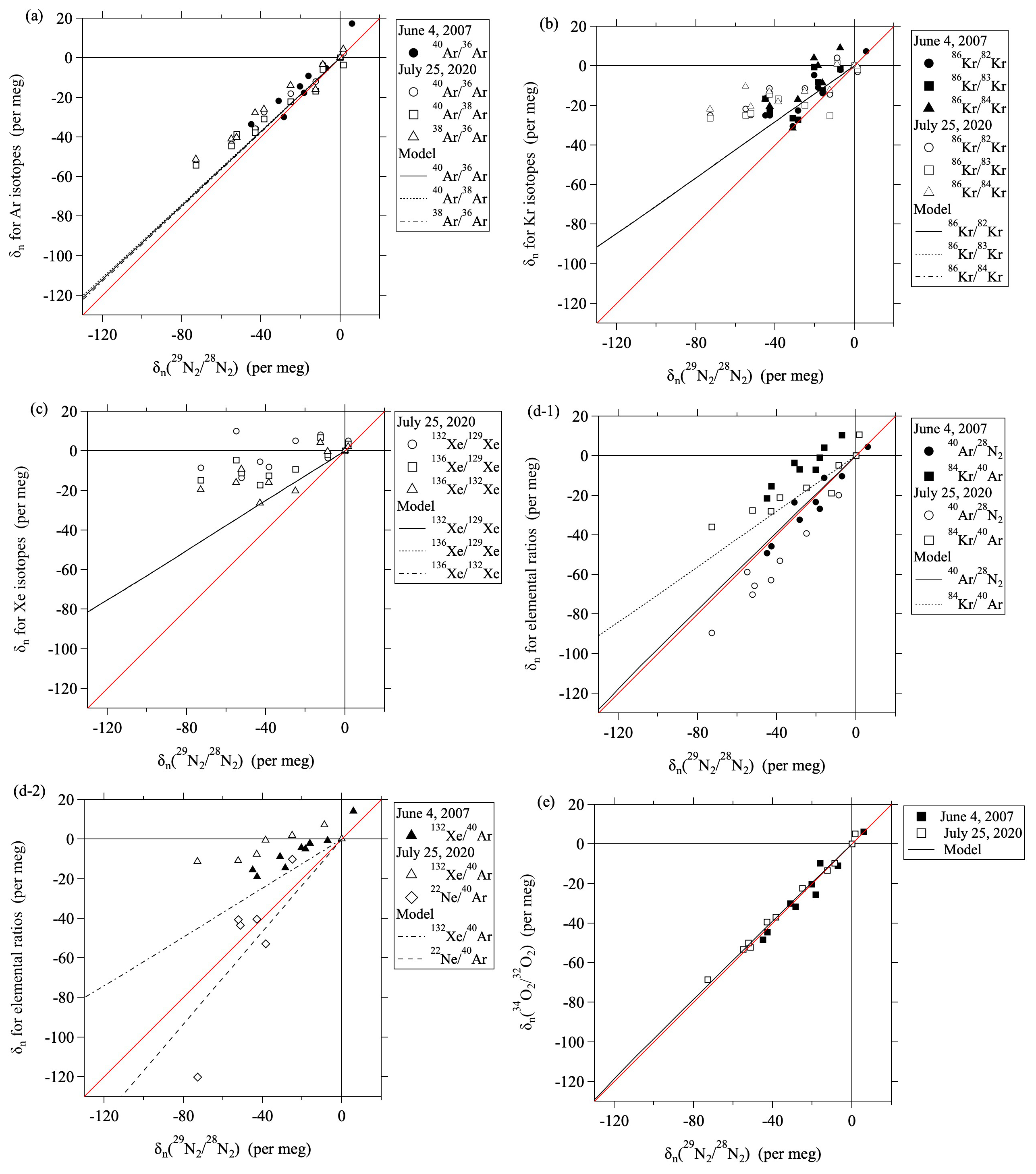 These results led us to an investigation of the effects of mass number differences. A previous study of the major atmospheric components has shown that the values normalized by mass number differences (i.e., δ(29N2/28N2), δ(34O2/32O2)/2, δ(40Ar/36Ar)/4, and δ(40Ar/28N2)/12) show almost the same degree of fractionation (Ishidoya et al., 2013). The implication is that the separations of these components are almost directly proportional to their mass number differences. In order to investigate the mass dependencies for noble gases, we defined the value normalized by the mass number difference, δn(X/Y), as follows: