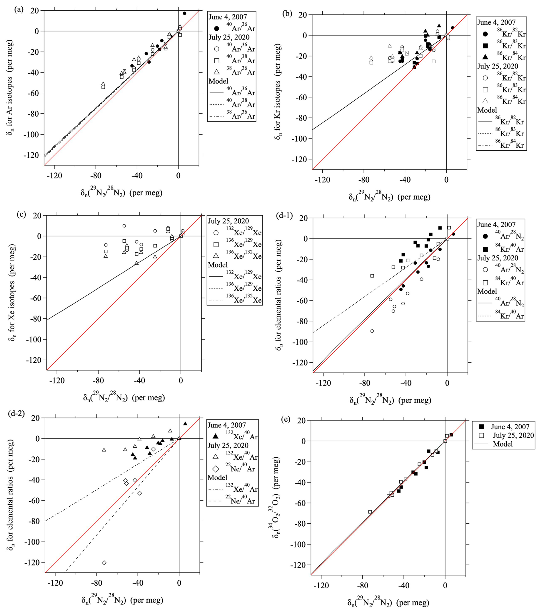 Figure 4Plots of δn(X/Y) versus δn(29N2/28N2). Black lines are linear least-squares fits to the data. Results of model simulations are shown by black lines. The mass-dependent relationships (y=x) are shown by red lines.