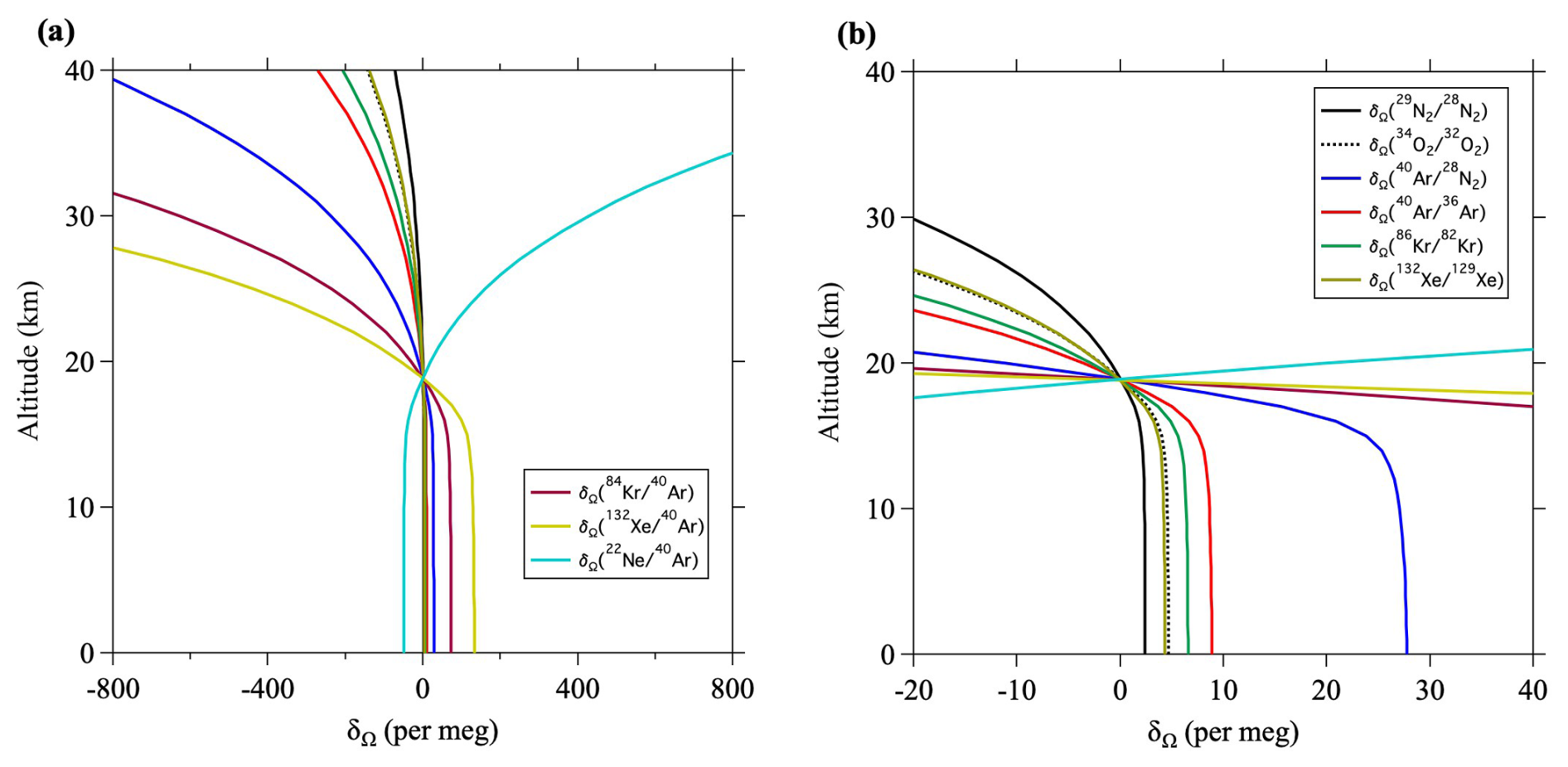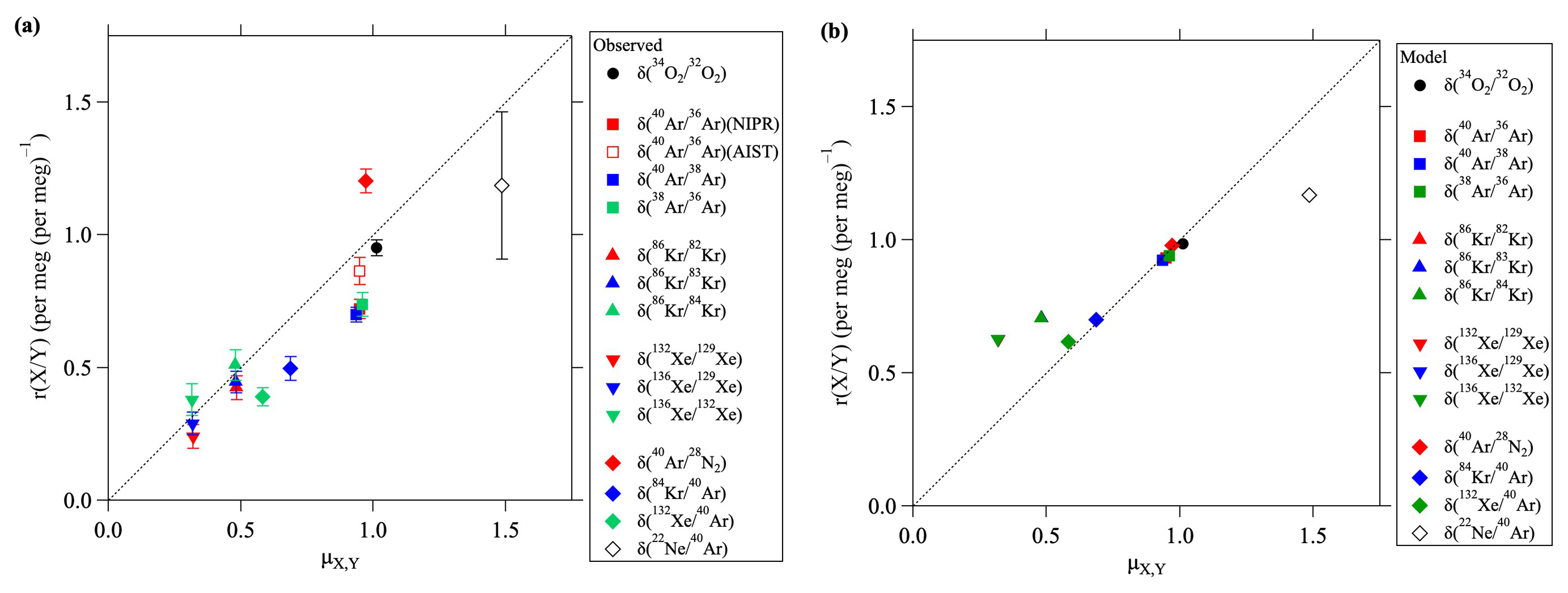 As shown in Fig. 5a, the relationship between r(X/Y) and μX,Y in some cases is nonlinear. The elemental ratios and the isotopic ratios of Ar tend to have smaller r(X/Y) values than those predicted from a linear relationship between r(X/Y) and μX,Y. The reason for the nonlinearity is unclear at this time, but one of the possible reasons is an effect of thermal diffusion. The effects of thermal diffusion in the stratosphere have not been studied and are not well understood for noble gases. It is presently considered difficult to clearly quantify the contribution of fractionation due to thermal diffusion in the stratosphere.