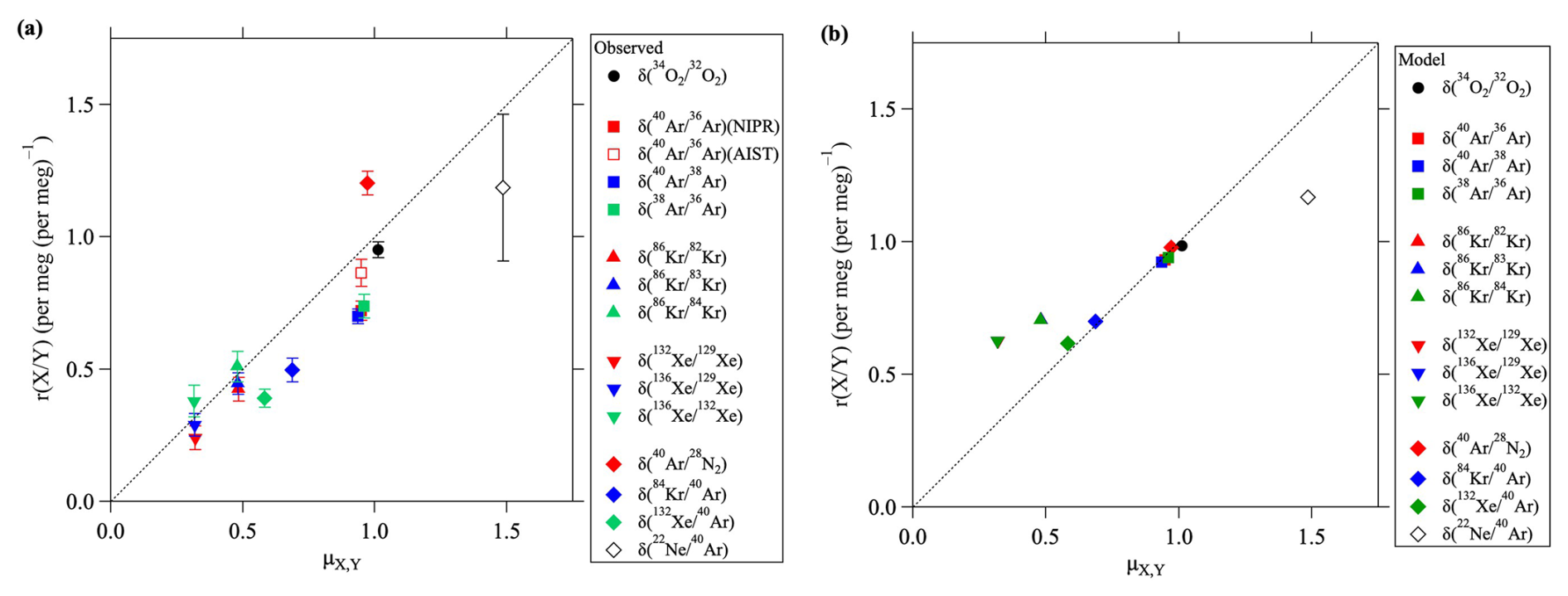 This diffusivity factor equals the ratio DX,Y/D29N2,28N2, which is independent of temperature and pressure. Table 1 shows the values of mX,Y and μX,Y. Figure 5a shows the correlation between μX,Y and the observed r(X/Y). It is apparent from this figure that r(X/Y) is roughly proportional to μX,Y. The implication is that the kinetic fractionations of noble gases in the stratosphere can be explained by the differences of their molecular diffusivities.