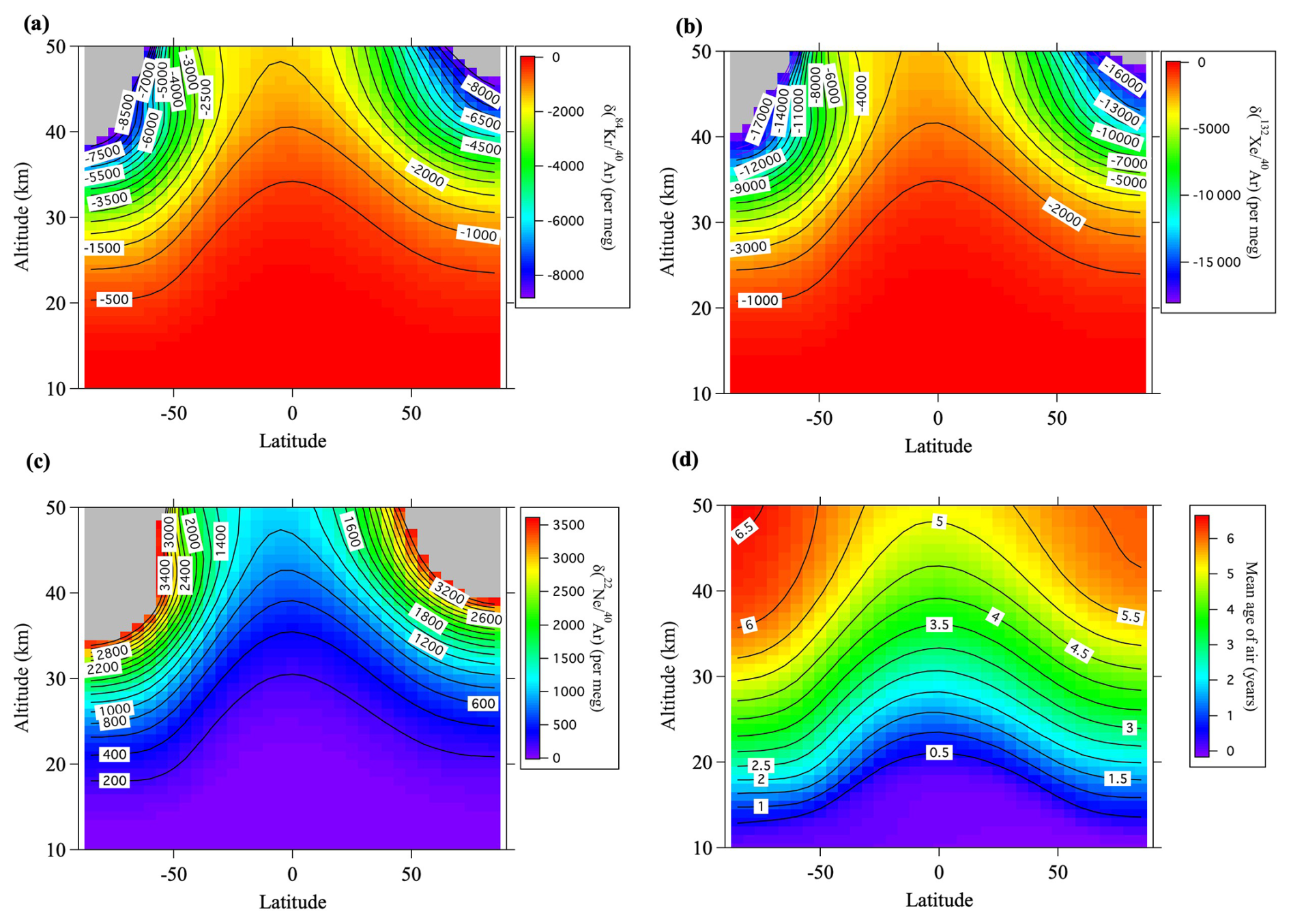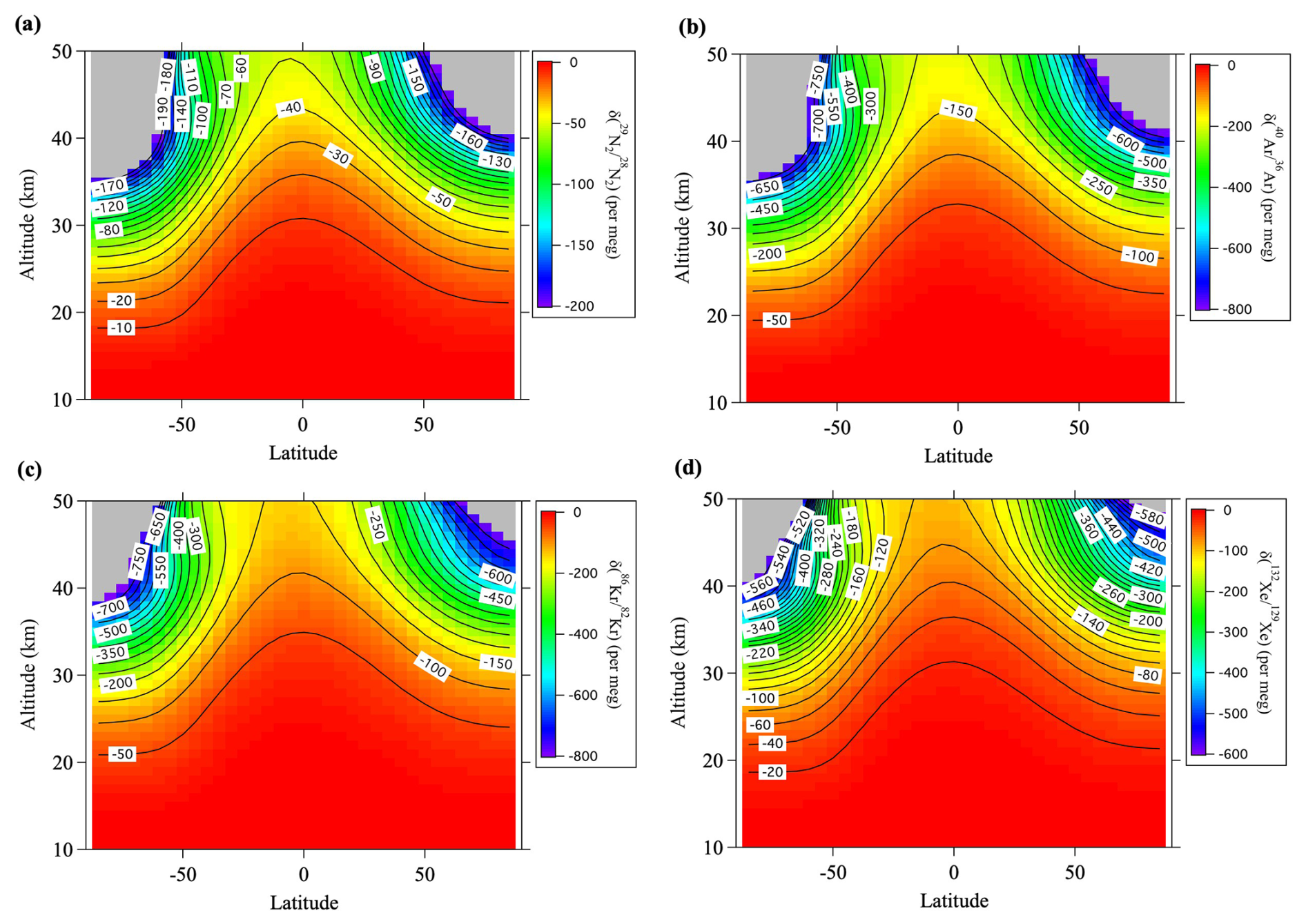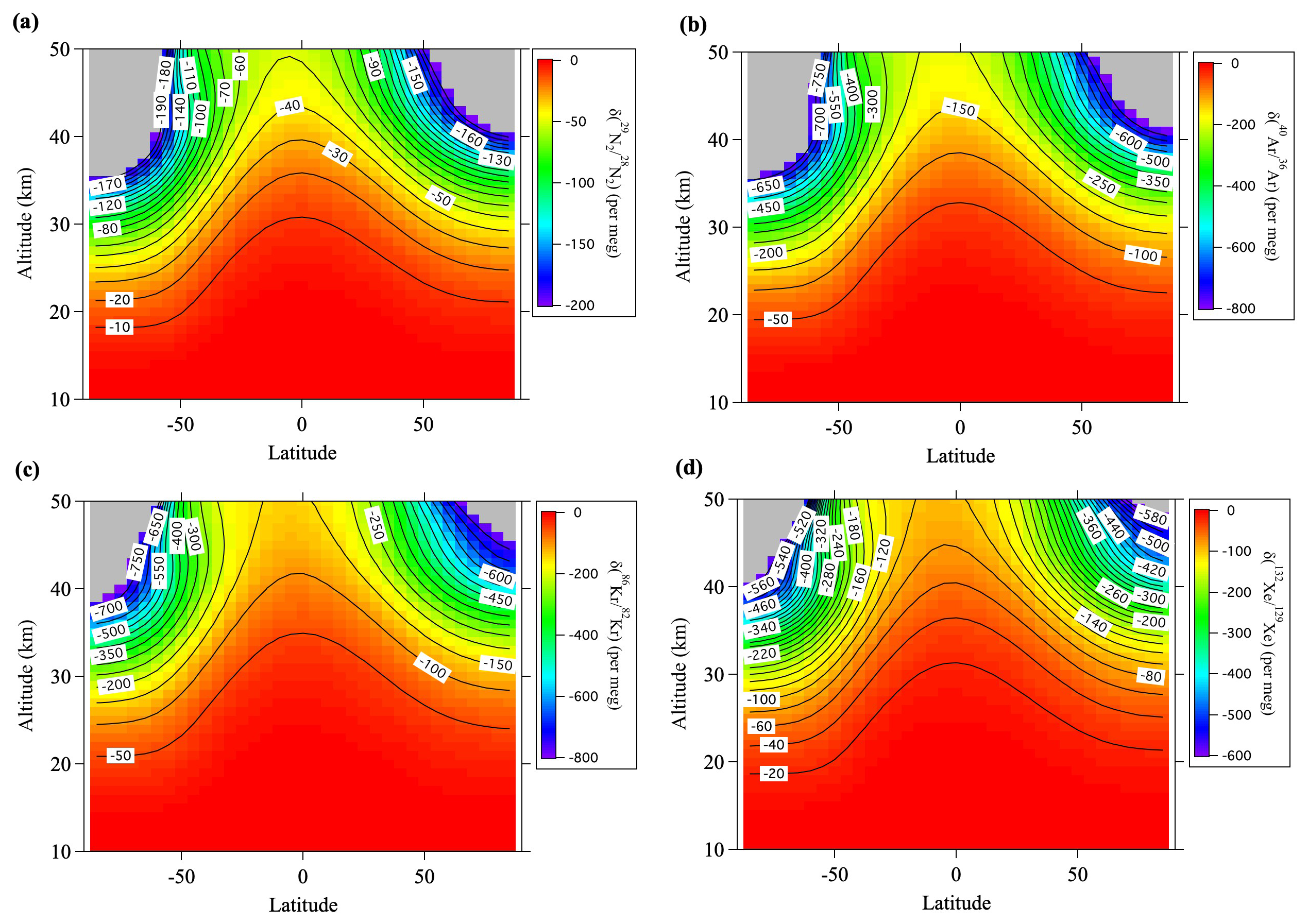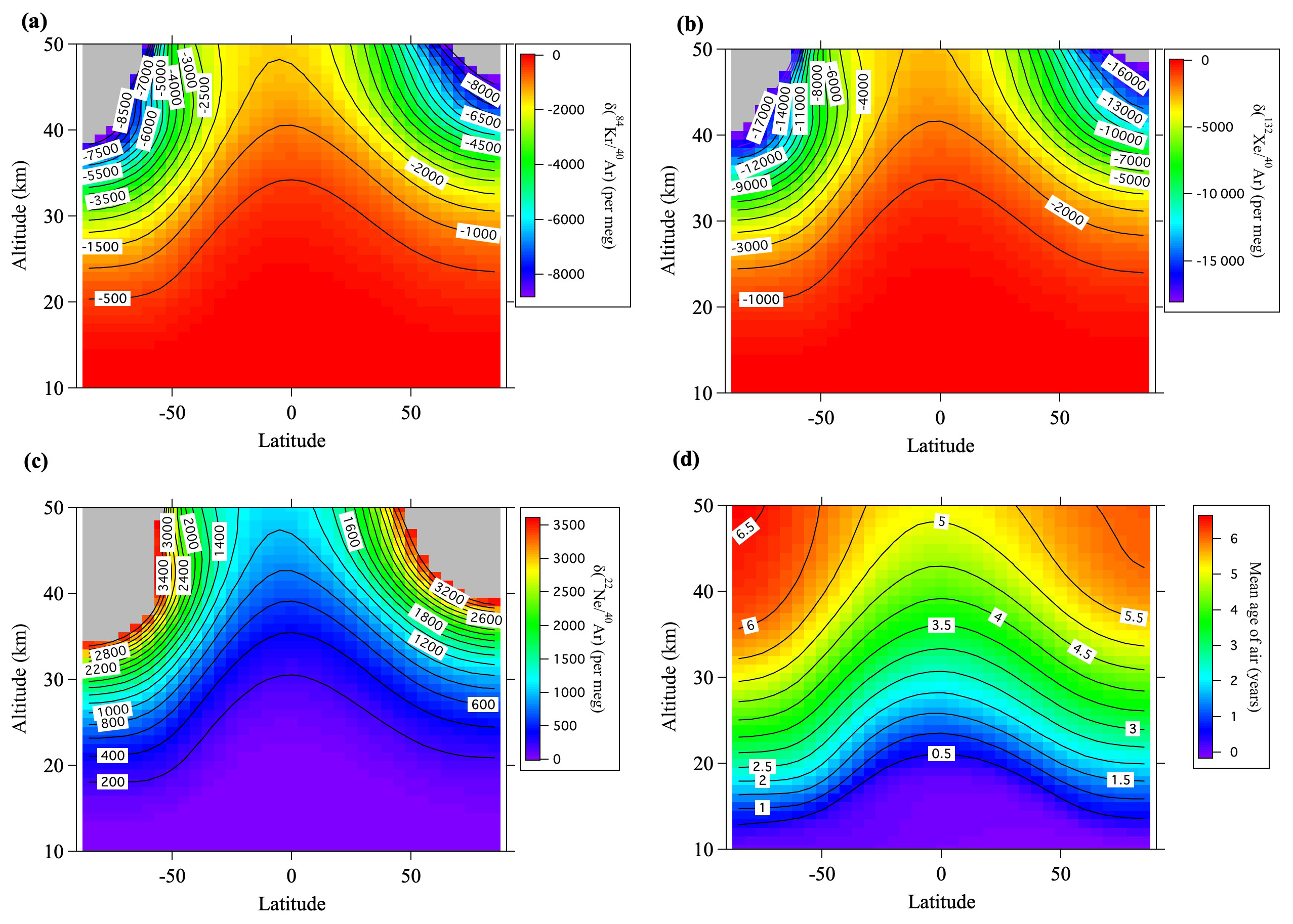 Figure 7Average meridional distributions in June and July for (a) δ(29N2/28N2), (b) δ(40Ar/36Ar), (c) δ(86Kr/82Kr), and (d) δ(132Xe/129Xe), simulated using the updated SOCRATES model. Values lower than the lowest color contours are shown in gray.