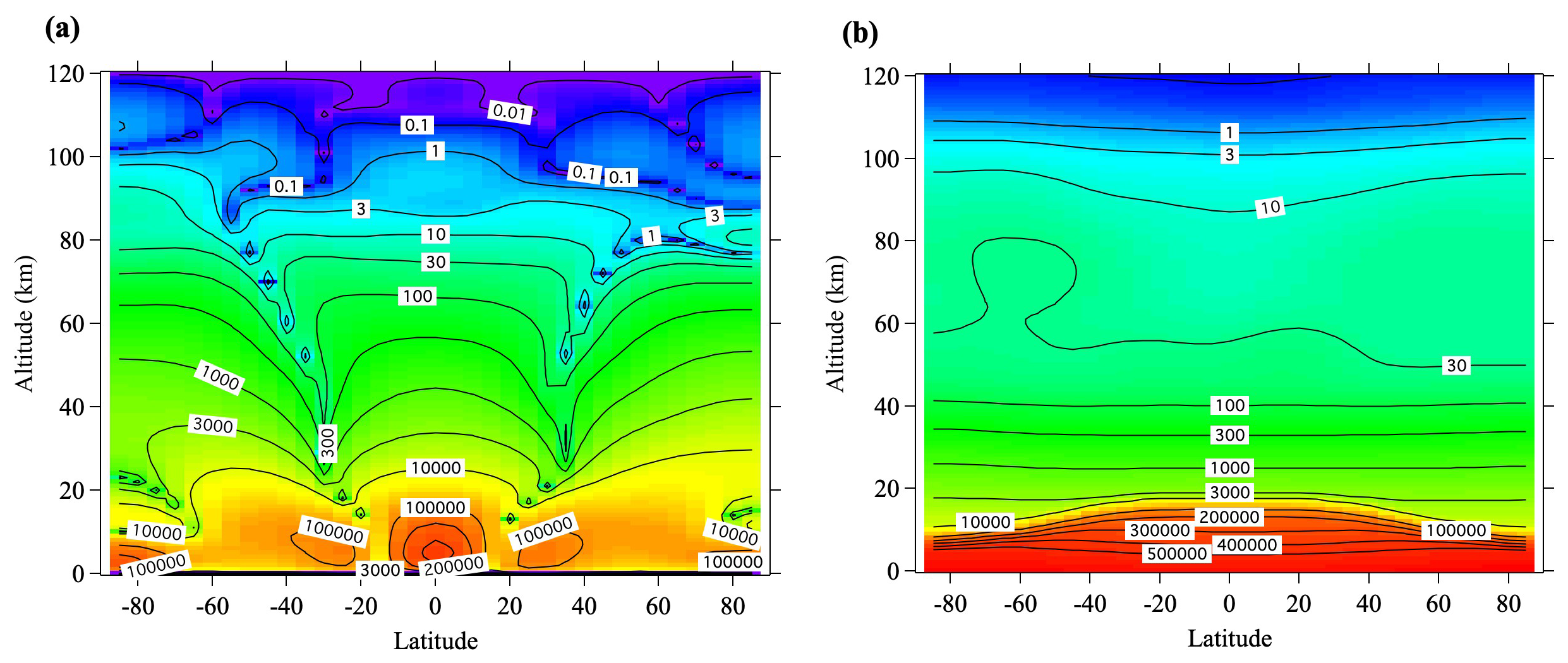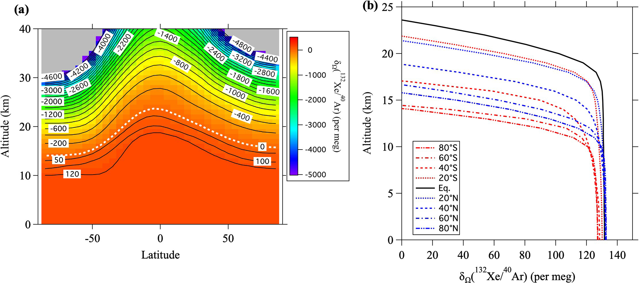 We hypothesized that the vertical profiles of noble gases revealed in this study reflected the effects of not only gravitational separation but also kinetic fractionation due to differences of molecular diffusivities, as described above. To verify this hypothesis, we performed numerical simulations using a two-dimensional model of the middle atmosphere (SOCRATES) developed by the National Center for Atmospheric Research (Huang et al., 1998; Park et al., 1999; Khosravi et al., 2002). This model has previously been used to reproduce the gravitational separation of the atmospheric major components (Ishidoya et al., 2013; Sugawara et al., 2018). Only a brief description of the method is therefore given here. To reproduce fractionations of stratospheric noble gases, the flux associated with molecular diffusion must be calculated. The vertical component of the flux due to molecular diffusion for molecular species X is given by