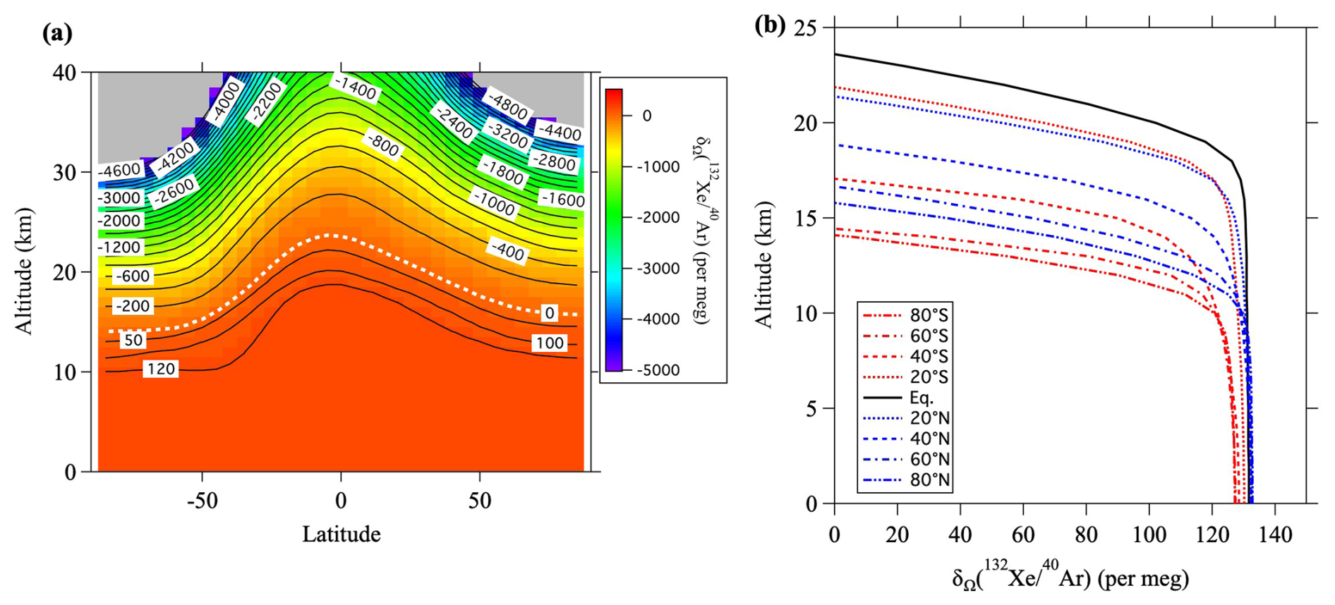 In this regard, there is a discrepancy between the observed and modeled ψ(X/Y) values. For example, the observed ψ(132Xe/40Ar) was -0.61±0.03permeg(permeg)-1, as shown in Table 1, whereas the simulated ψ(132Xe/40Ar) was approximately -0.38permeg(permeg)-1. Regardless of the scenarios, there was almost no change in the overestimation of ψ(X/Y) values. Model results showed that ψ(132Xe/40Ar) dropped to around -0.6permeg(permeg)-1 at an altitude of approximately 100 km where the molecular and eddy diffusions were competitive, but it was significantly overestimated in the stratosphere. This overestimation of ψ(X/Y) for noble gases in the model could be traced to the overestimation of r(X/Y) and was evident in the isotopic and elemental ratios of Ar, Kr, and Xe, as seen in Fig. 5b. The cause of this overestimation is currently unclear. One of the possible causes would be an effect of thermal diffusion on the observed data, as described before, an effect that was neglected in our model. However, we could not find clear evidence of fractionations due to thermal diffusion in the stratosphere. Another possible cause could have been an unrealistic eddy diffusion coefficient in the model. Although an enhancement of Kzz could lead to depressions of ψ(X/Y), as described above, the age of air would simultaneously decrease. The result would be another contradiction. These results implied that our sensitivity test using arbitrary changes of transport processes could not fully reproduce realistic ψ(X/Y) values. To resolve this problem, it will be necessary to carry out simulations with other models. In particular, simulations of the gravitational separations and kinetic fractionations, in addition to the mean age of air, using modern climate models will help to validate model dynamics. Model simulations that take thermal diffusion into account will also be needed in a future study.