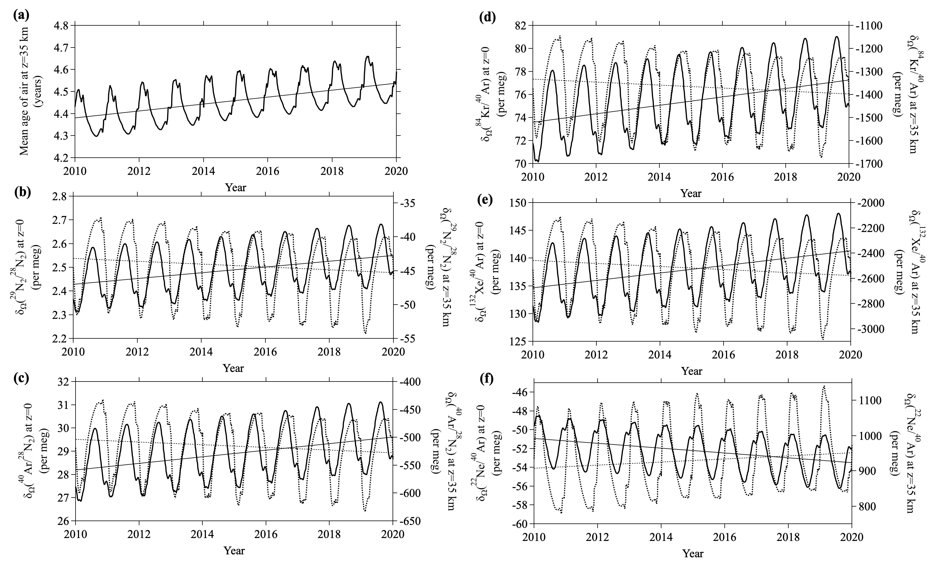 Figure 2Vertical profiles of the isotopic ratios for (a1–3) Ar, (b1–3) Kr, and (c) Xe; (d1–3) elemental ratios; (e) isotopic ratios of N2 and O2; and (f) age of air. Results of model simulations are shown by the various dotted and solid lines.