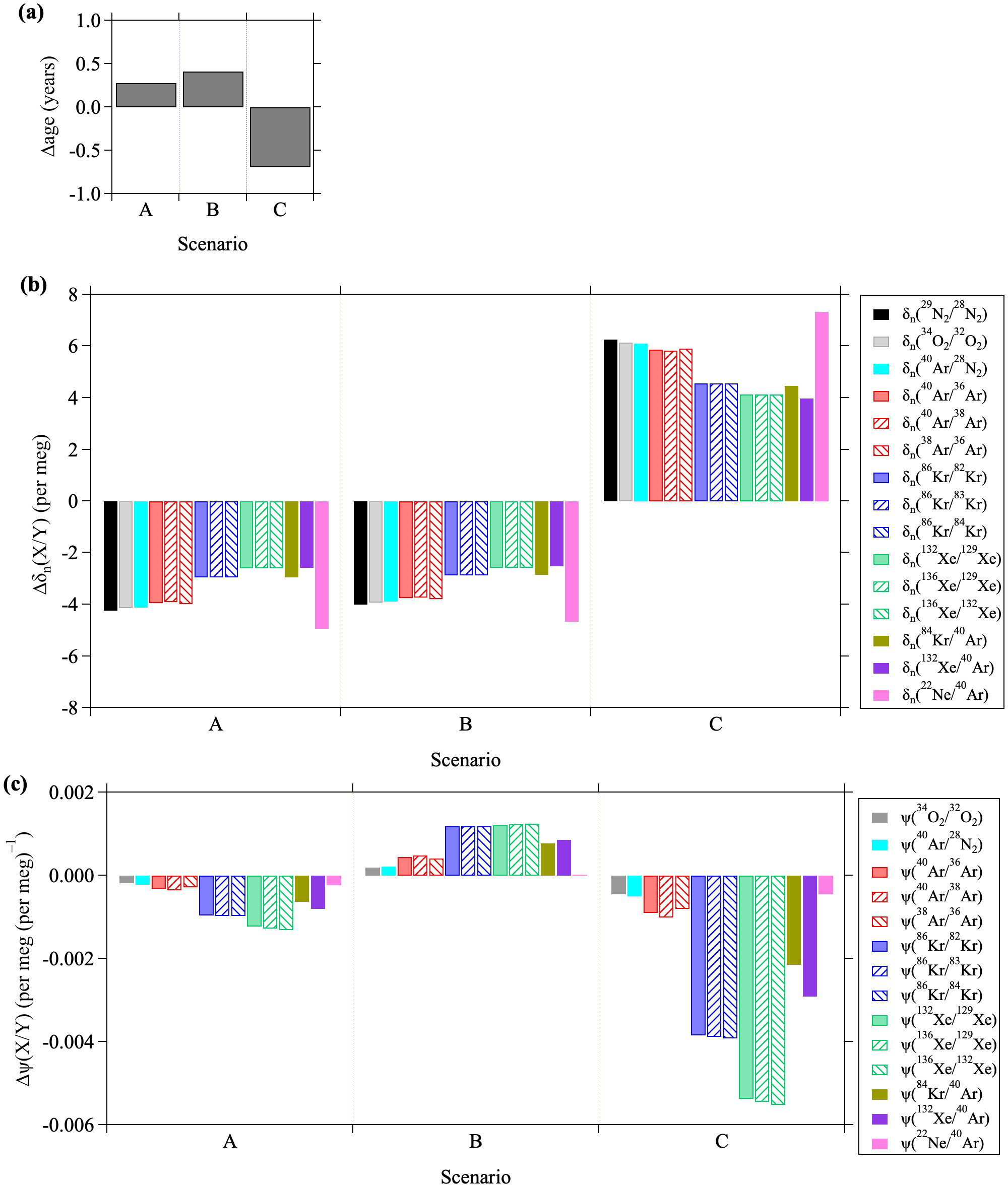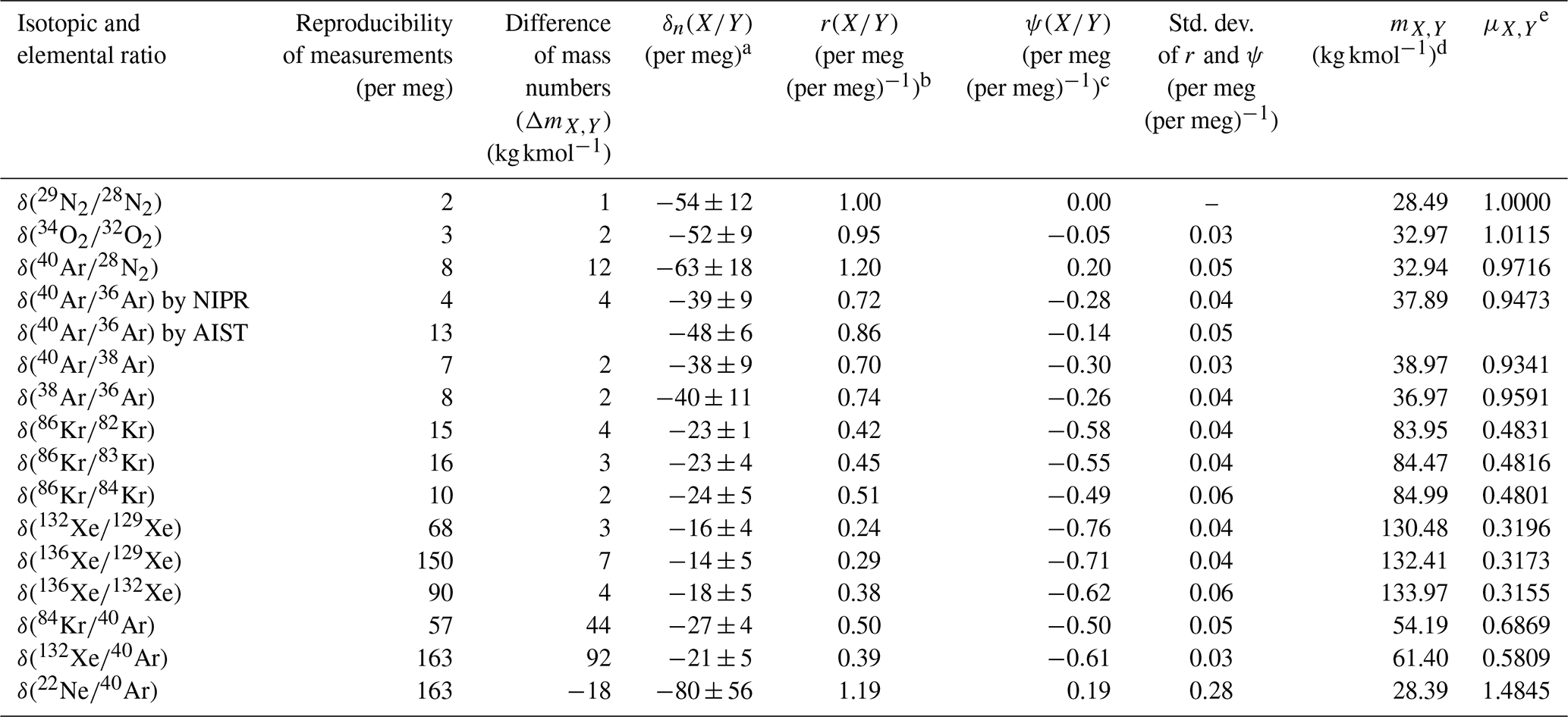 The value of r(X/Y) is the ratio of δn(X/Y) relative to δn(29N2/28N2). If the variation of δ(X/Y) were due to only gravitational separation, then r(X/Y) and ψ(X/Y) would be expected to equal 1 and zero, respectively. Figure 4 shows the relationship between δn(X/Y) and δn(29N2/28N2). The values of r(X/Y) were determined by fitting a linear function to the relationship between the two values. Values of ψ(X/Y) are quantities that generalize the concept of excess-86Kr (86KrXS15) used in the ice core analysis by Buizert et al. (2023) to all other isotopic and elemental ratios. For the heavy noble gases, the process of air mixing due to eddy diffusion produces gravitational disequilibrium, and the values of ψ(X/Y) are always negative. Table 1 summarizes the values of r(X/Y) and ψ(X/Y). The values of r(X/Y) were roughly close to 1.0 for the δ(34O2/32O2), δ(40Ar/28N2), and Ar isotopic ratios, but they were clearly smaller than 1.0 for the heavy noble gases. For example, if we compare δ(40Ar/36Ar), δ(86Kr/82Kr), and δ(136Xe/132Xe), which all have mass number differences of 4 kg kmol−1, the heavier the noble gas, the lower r(X/Y). As shown in Table 1, the r(X/Y) values decreased significantly in the order Ar, Kr, and Xe; the lowest values were 0.24–0.38 per meg (per meg)−1 for the Xe isotopic ratios. These facts suggested that the kinetic fractionations are not all the same and depend on the element.