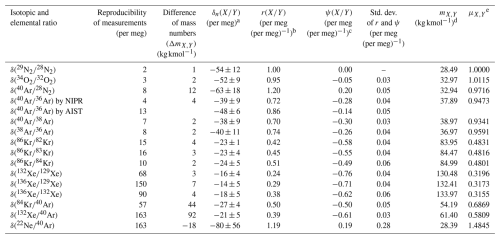 Table 1 summarizes the isotopic and elemental ratios measured in this study. Isotopic and elemental ratios of noble gases – δ(40Ar/36Ar), δ(40Ar/38Ar), δ(38Ar/36Ar), δ(86Kr/82Kr), δ(86Kr/83Kr), δ(86Kr/84Kr), δ(132Xe/129Xe), δ(136Xe/129Xe), δ(136Xe/132Xe), δ(84Kr/40Ar), δ(132Xe/40Ar), and δ(22Ne/40Ar) – were measured at the National Institute of Polar Research (NIPR; Tachikawa, Japan). For example, the isotopic ratio of 40Ar and 36Ar was defined as