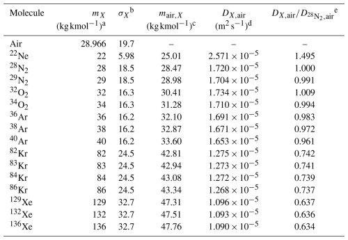 a Mass number of molecule. b Diffusion volume parameter (Reid et al., 1987). c Harmonic mean of mass numbers between the respective molecule and air. d Diffusivity of molecule X in air given by Eq. (12). These values are examples at 1000 hPa and 273 K. e The ratio of molecular diffusivities relative to D28N2,air. Note that these values are independent of temperature and pressure.