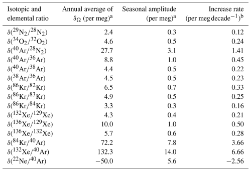 Noble gases are extremely stable in the atmosphere, but they can be exchanged between the atmosphere and ocean because their solubilities in seawater change with seawater temperature variations. Because the temperature dependence of solubility is unique to each noble gas, the air–sea flux of noble gases due to changes in seawater temperature changes the elemental ratios of noble gases in the atmosphere (e.g. Keeling et al., 2004). Using this principle, the global mean ocean temperature (MOT) over the past several hundred thousand years has been reconstructed from δ(Kr/N2), δ(Xe/N2) and δ(Xe/Kr) of bubble air trapped in ice cores (e.g., Bereiter et al., 2018b; Shackleton et al., 2020; Haeberli et al., 2021). Ishidoya et al. (2021) reported the long-term variations of δ(Ar/N2) observed at ground stations in 2012–2020 and discussed the contributions of secular changes in global ocean heat content (OHC) and BDC. They concluded that the effect of the BDC change on δ(Ar/N2) at the ground surface cannot be ignored.
