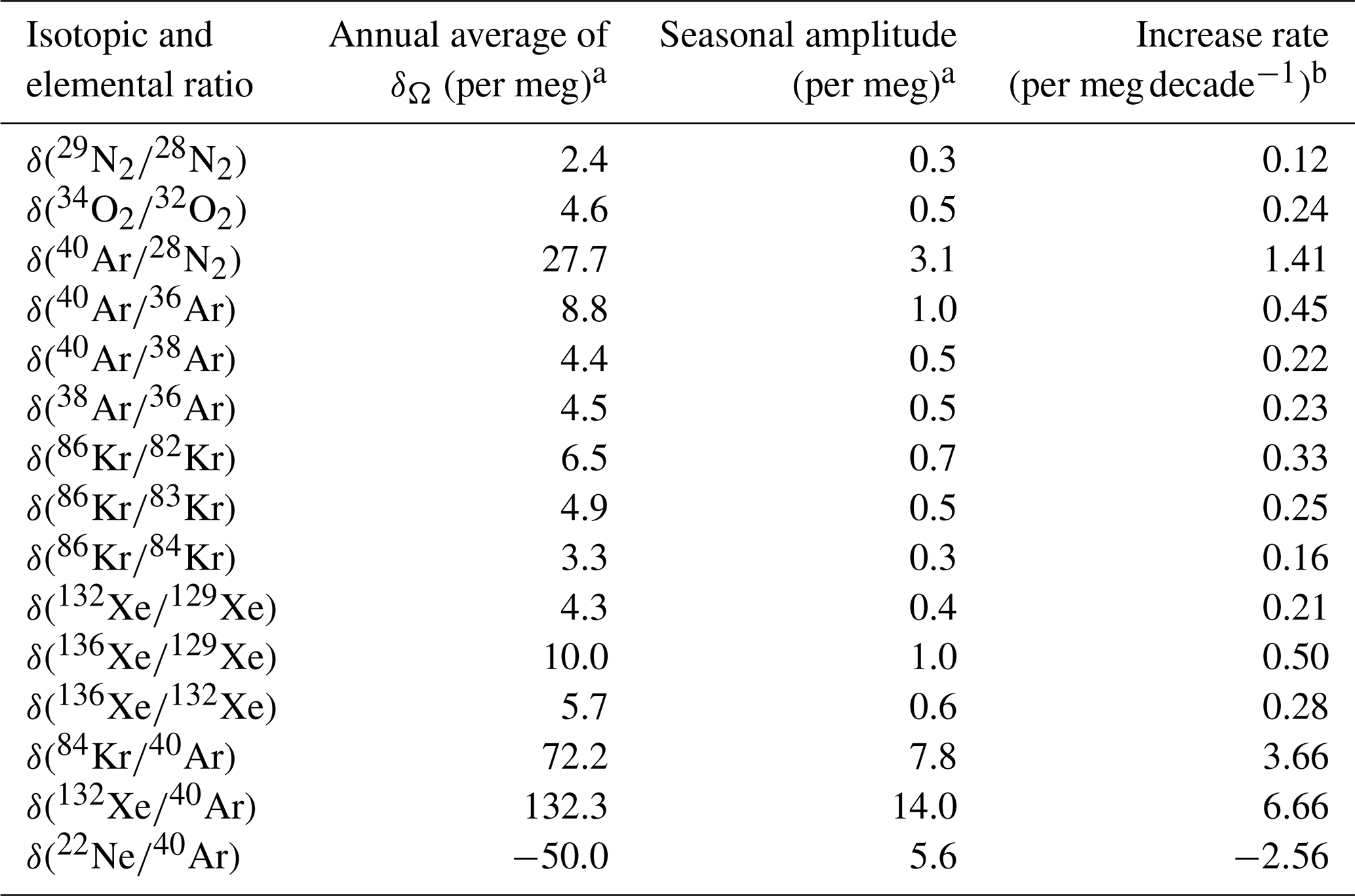 Because the other elemental ratios were defined similarly, their notations are omitted here. These δ values are usually expressed in per meg (1 per meg is 0.001 ‰). For air samples collected in 2007, we measured δ(40Ar/36Ar), δ(40Ar/38Ar), δ(38Ar/36Ar), δ(86Kr/82Kr), δ(86Kr/83Kr), δ(86Kr/84Kr), δ(84Kr/40Ar), and δ(132Xe/40Ar). For air samples collected in 2020, we also measured δ(132Xe/129Xe), δ(136Xe/129Xe), δ(136Xe/132Xe), and δ(22Ne/40Ar). Because the analytical method for the noble gases has been described elsewhere (Severinghaus et al., 2003; Severinghaus and Battle, 2006; Kawamura et al., 2013; Bereiter et al., 2018a; Oyabu et al., 2025), only a brief description is presented here.