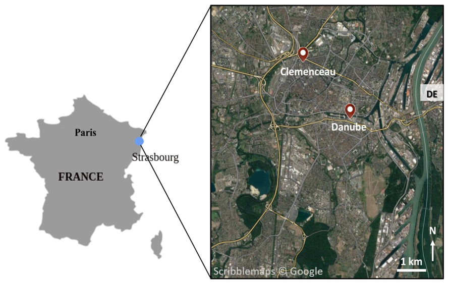 A detailed description of the two sites (background and roadside) investigated here can be found in Chatain et al. (2021). Briefly, both sites correspond to fixed stations operated by the ATMO Grand Est AASQA (http://www.atmo-grandest.eu, last access: 17 November 2025). The first one (called Danube) corresponds to an urban background station located southwest of the city center of Strasbourg (Fig. 1). This station was installed at the center of a recently built eco-district between a small canal (Bassin Dusuzeau) and the Rhine Avenue. The second site (called Clemenceau) corresponds to an urban roadside station located at the corner of an intersection between two major roads in the north of the city center of Strasbourg.