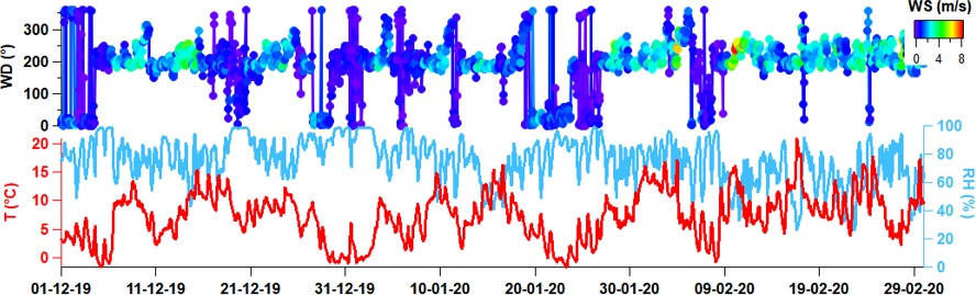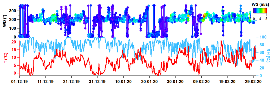 Meteorological parameters have been measured at a background site located a few kilometers northwest of the study sites. Temperature (T) and relative humidity (RH) were measured by dedicated probes (HMP Vaisala model) and wind data (speed, WS; and direction, WD) by a wind vane (TAVID Chauvin Arnoux model). As presented in Fig. 2, the investigated period was dominated by south-western and relatively warm (5–10 °C) air masses, except during relatively short colder periods (e.g., around New Year and 22 January) with northern winds.