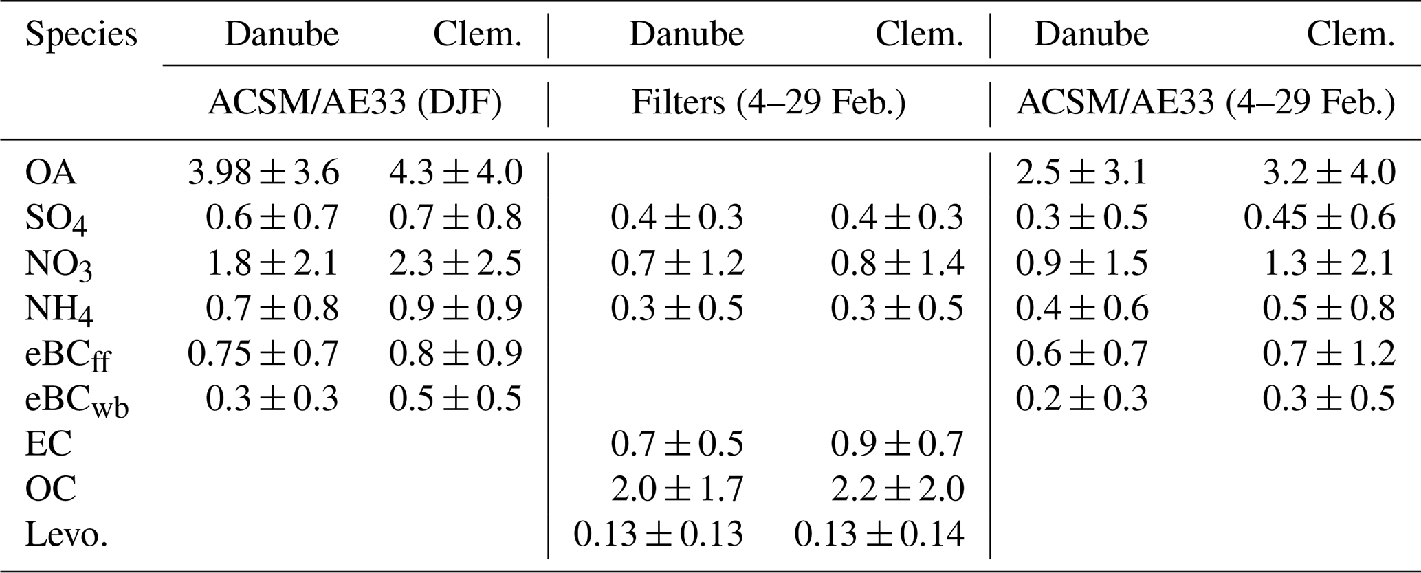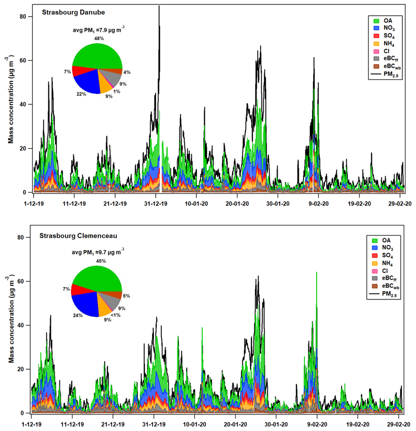 Figure 3 displays the mass concentrations of PM1 species and the average contribution of eBC, NR-PM1 species, and PM2.5 during winter 2019/2020 at the Danube and Clemenceau sites. OA dominates the average PM1 chemical composition with 48 % and 45 % at the urban background and traffic sites, respectively, as already observed in previous studies in winter at the national scale in the Paris region (44 %), Lille (37 %) and Dunkirk (34 %) (Chebaicheb et al., 2024, 2023; Favez et al., 2021; Zhang et al., 2021; Petit et al., 2014). Secondary inorganic species (NO3, SO4, and NH4) also contribute significantly, accounting for around 40 % of PM1 total mass, mainly from NO3 (22 %–24 %). These observations are consistent with the regional formation of ammonium nitrate (NH4NO3; AN), which is greater than ammonium sulfate ((NH4)2SO4; AS). NH3, considered as mainly emitted by agricultural activities, is expected to react preferentially with sulfur compounds (mainly sulfuric acid (H2SO4) formed from sulfur dioxide (SO2)). However, regional SO2 concentrations have been extremely low since the late 2010s (below 1 µg m−3 since 2016 at regional background sites). Therefore, AS is mainly derived from long-range transport in urban areas, and the remaining NH3 is available to react with NOx present, notably to form AN locally. However, the balance of AN formation also depends on meteorological conditions (low temperatures, high relative humidity, high pressure), leading to higher AN concentrations in winter/early spring when these meteorological conditions are met simultaneously with higher local NH3 emissions. Previous studies conducted in this part of Europe, e.g., in Greater Paris (Zhang et al., 2019; Petit et al., 2014) or in the Lille metropolitan area (Chebaicheb et al., 2023) also highlighted the high contribution of organics and nitrate in PM1 particles, as well as the high impact of transboundary pollution advection from Eastern Europe in northern France for particulate matter (Waked et al., 2018; Potier et al., 2019).