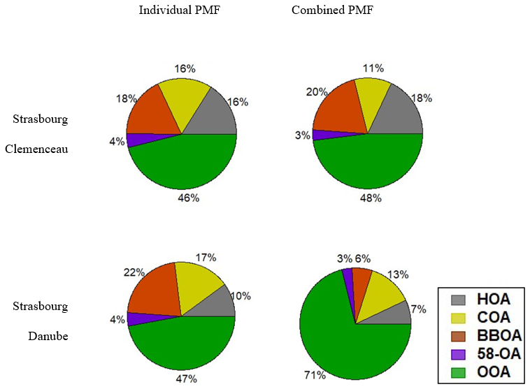 The combined PMF identified two OOA factors, named OOA1 and OOA2 (Sect. S2, Fig. S11). Because the two factors are correlated, we summed them together to obtain a single OOA factor (Fig. S13). At the Clemenceau site, the contribution of the OOA factor (48 %) is similar to the one obtained from the individual PMF, with a mass concentration of 2.8 µg m−3. At the Danube site, the contribution of the OOA factor strongly increased from 47 % for the individual PMF to 71 % for the combined one (Fig. 4), reaching a mass concentration of 2.6 µg m−3, close to that of the Clemenceau site. These combined PMF results provided further insight into this factor and demonstrated its regional origin. In Clemenceau, we observed a balance between primary and secondary OA factors, while for Danube, the combined PMF results indicated an average OOA contribution of about 70 % of the total OA.