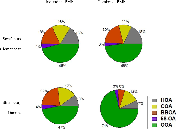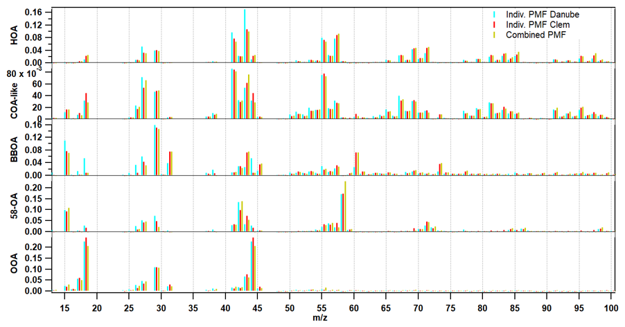 The COA-like factor showed the expected peaks at lunch and dinner time for Clemenceau, but also a diel cycle relatively similar to BBOA (with no significant midday increase) for Danube, illustrating the difficulty in attributing a pure cooking origin to this factor. Interestingly, the results of the combined PMF analysis may improve the apportionment of these cooking emissions, reducing the COA-to-HOA ratio at night – especially for Clemenceau – compared to individual PMF outputs (Fig. S14). However, such a combined PMF analysis may not be suitable to improve the consistency of other OA factors, probably due to instrumental specificities leading to differences in the OA mass spectra obtained by the two instruments. More specifically, the OA profiles obtained by the combined PMF method exhibit a greater similarity to the profiles obtained by the individual PMF analysis at Clemenceau than to those obtained by the individual PMF analysis at Danube. As a result, there is a reduced contribution of 43 (associated with HOA) and 44 (associated with BBOA) at Danube when applying the combined PMF approach as opposed to the individual PMF analyses. This discrepancy leads to an underestimation of these factors (HOA and BBOA) and an overestimation of OOA at the Danube site when using the combined PMF method.