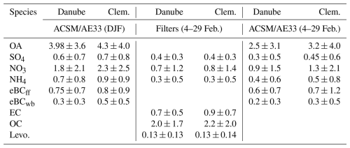 The average mass concentrations of NR-PM1 species and eBC presented in Table 1 showed only slight differences between the two sites, with overall higher levels at the Clemenceau site. This could be attributed to the proximity of primary exhaust and non-exhaust emissions from road traffic as well as more intense condensation and coagulation processes. It should also be noted that the environment of the Clemenceau station is more urbanized (city center) compared to the Danube site, which may also partly explain these observations. OA is associated with the highest concentrations at both sites – with values of 3.98 and 4.3 µg m−3 at the Danube and Clemenceau sites, respectively – reinforcing the interest in the apportionment of its main sources. The second main compound at both sites was nitrate, with concentrations about 20 % higher at Clemenceau compared to Danube. The differences in sulfate and eBCff concentrations are about 15 % on average (with the highest concentrations still observed at Clemenceau). Complementarily, results from offline analyses performed on filters collected in February 2020 indicate slightly higher concentrations for Clemenceau (Table 1). Surprisingly, however, filter-based levoglucosan analyses indicate similar concentration levels at both sites while eBCwb appears to be about 40 % higher at Clemenceau, and the comparison of OA mass spectra averaged over the study period also indicates significantly higher signals for the highest 's, including common wood-burning tracers (see Fig. S3), at Clemenceau.
