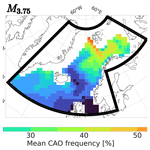 To produce a climatology of CAO clouds, both CAOnet and the MERRA-2 M index were used. Similar to Papritz and Spengler (2017), an extended winter stretching from November through April was used for the climatological analysis. For each grid point, a relative frequency of occurrence (RFO) was calculated, representing the fraction of days with CAO coverage relative to the number of days MODIS had coverage for that grid point. For MERRA-2, two M index thresholds of 0 and 3.75 K called M0 and M3.75 were used, where the latter threshold was selected based on the model evaluation as described in Sect. 2.1.7.