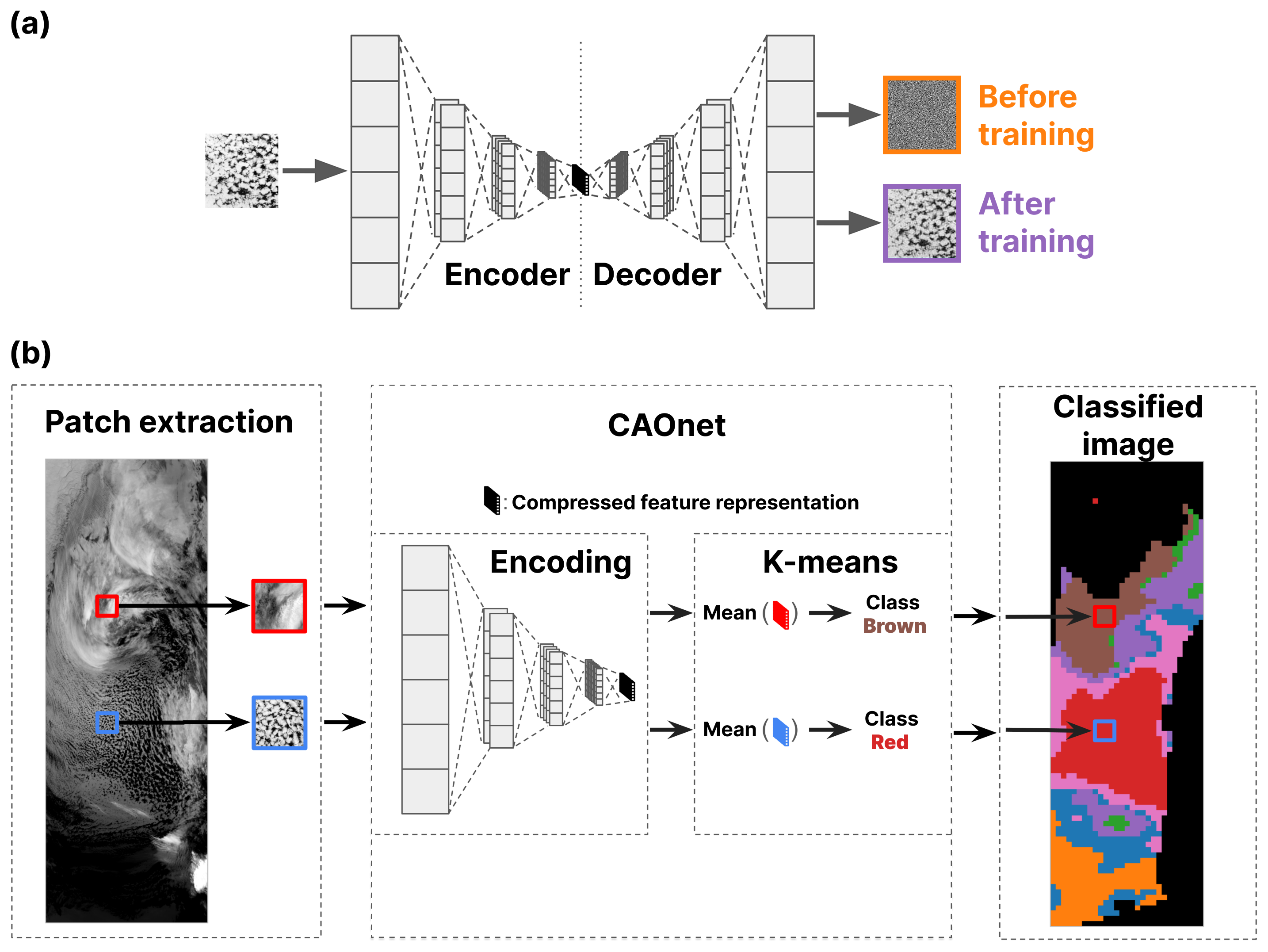 Figure 1A visualization of a typical CAO and how it is processed by the unsupervised classification model. In panel (a) an image patch is fed through the autoencoder which before training produces noise (orange). The trained autoencoder has optimized its trainable parameters leading to an accurate reproduced image patch (purple). In panel (b), a classification example is shown, utilizing the encoder of the trained autoencoder. Two patches (marked in red and blue) are followed from extraction to encoding, K-means clustering and a final classified image. The blue patch containing typical CAO cellular cloud formation is classified as red, while the high clouds in the red patch are classified as brown. In this example, K-means clustering with seven clusters was used, with the red and pink cluster evaluated to most closely align with CAO clouds. Black regions of the classified image denote land, sea ice or regions outside of the study domain.