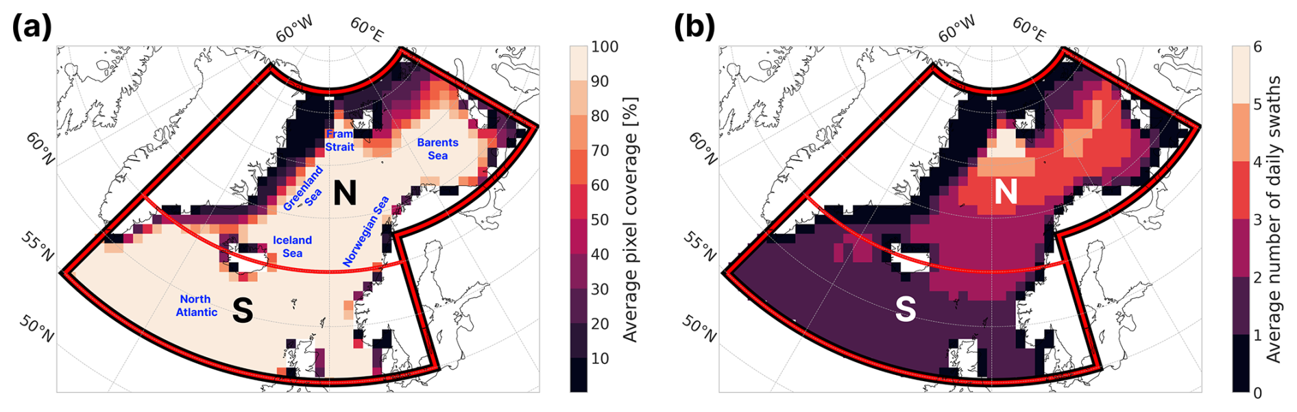 Figure 2Average daily grid point coverage (a) and number of MODIS swaths (b). Low coverage can be found in coastal areas where patches typically contain less than 95 % open ocean. S and N define a southern and northern subregion for subsequent analysis. Names of the focus regions for this study are marked in blue.