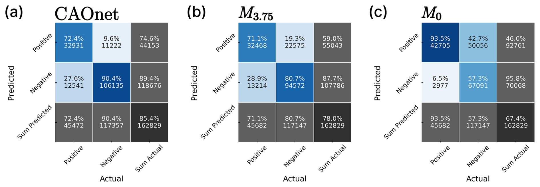 Figure 3Confusion matrices for CAOnet (a), MERRA-2 with M>3.75 K (b), and MERRA-2 with M>0 K (c). The y-axis represents predicted classes by the models, while the x-axis represents the labeled classes. Positive corresponds to classified CAO, while negative means no CAO was classified. For each colored box, the lower number corresponds to number of classified patches, while the upper percentage corresponds to the rate of that predicted class relative to the actual class. The lower gray row shows the recall and true negative rate (upper) and number of patches labeled as that actual class (lower). The rightmost gray column shows the precision for positive and negative prediction (upper) and number of patches corresponding to that predicted class (lower). Finally the lower right corner in dark gray shows the total accuracy (upper) and total number of patches classified (lower).