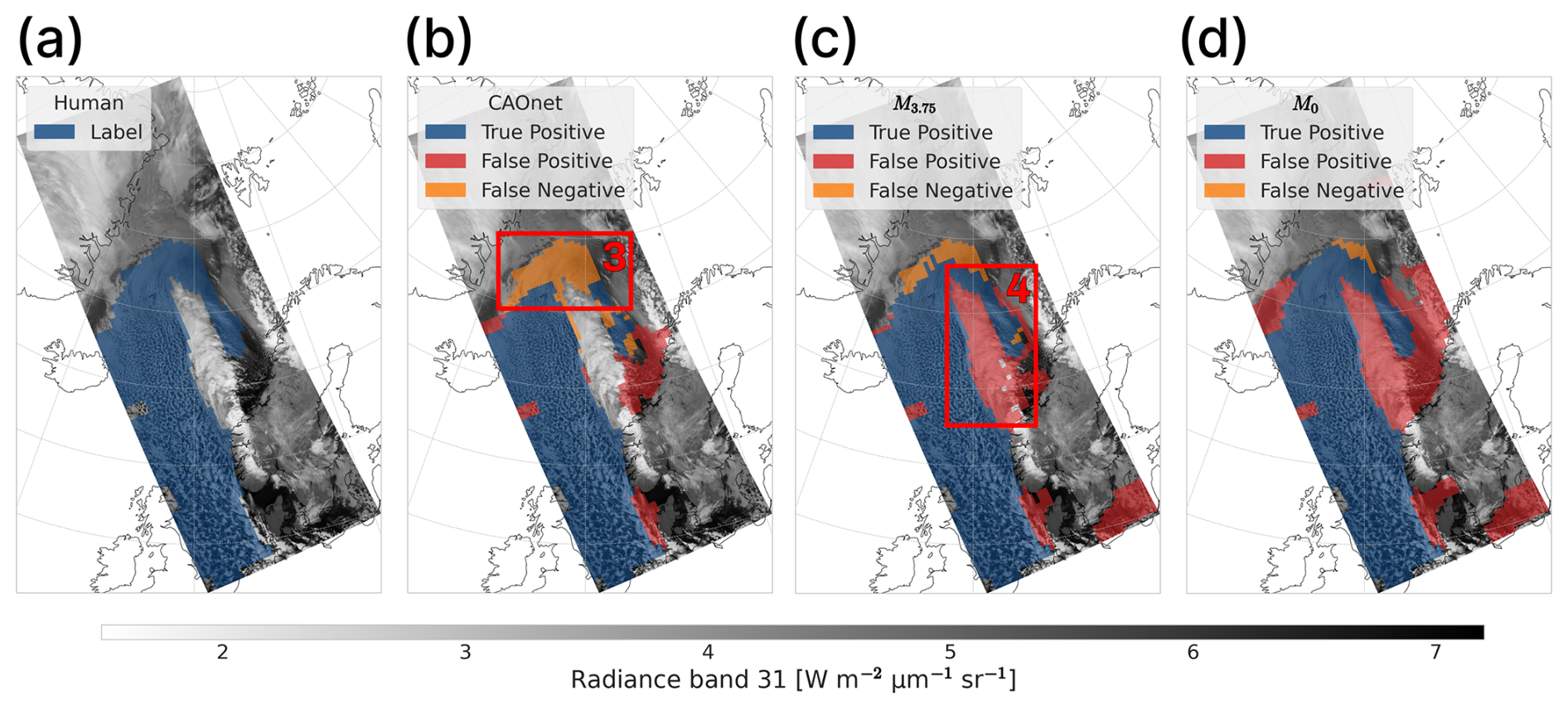Figure 5A CAO west of Norway 21 November 2008 21:00 UTC labeled by a Human (a), CAOnet (b) and MERRA-2 using a M index threshold of 3.75 (c) and 0 K (d). Region 3 shows a typical example of CAOnet struggling in capturing initial closed cell development, while region 4 shows an example of the M index classifying a high cloud as a CAO.