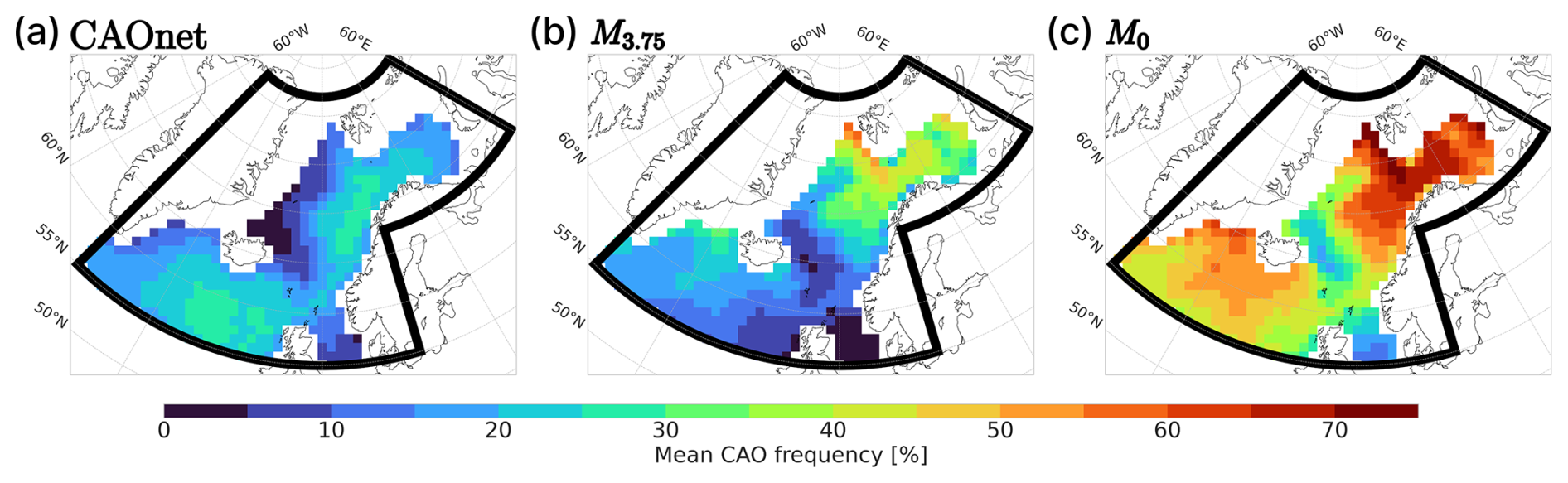The Fram Strait is a region known for CAOs due to frequent instability in the MBL as indicated by the M index (Papritz and Spengler, 2017; Dahlke et al., 2022). However, this region shows relatively low RFO for CAOnet in Fig. 6a. This discrepancy may be attributed to earlier studies employing the M index which suggests instability without necessarily indicating cloud formation. It could also result from high clouds obscuring the CAO clouds below or from CAOnet failing to capture the initial development of closed cell clouds, as shown in Fig. 5. In contrast, M3.75 and M0 aligns with expectations, showing maxima in the RFO over the Fram Strait (Fig. 6b and c). This maximum also extends towards the Norwegian coast, giving higher RFO in this region than CAOnet.