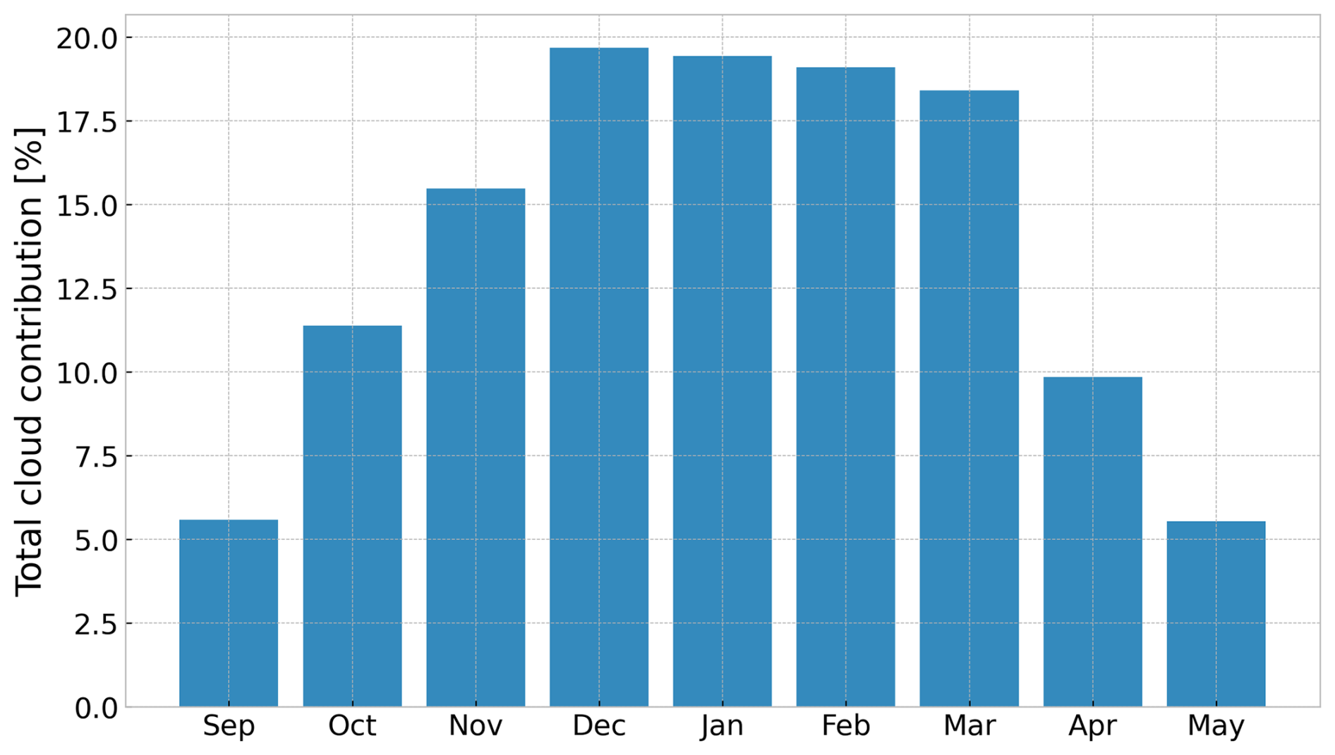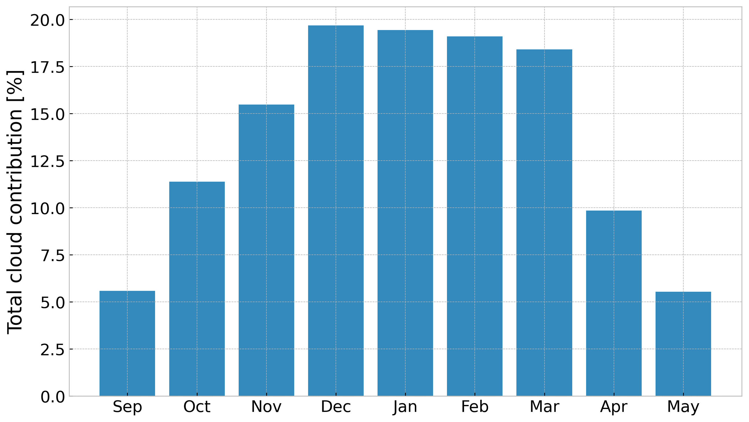 To further underline the importance of CAO clouds, their contribution to total cloud cover was investigated. To estimate this, a monthly climatology of the total cloud cover during their presence was calculated using MERRA-2 reanalysis data. As the CAOnet database has a daily temporal resolution, the 24 h MERRA-2 dataset was averaged to provide daily mean cloud coverages for every CAOnet grid point.