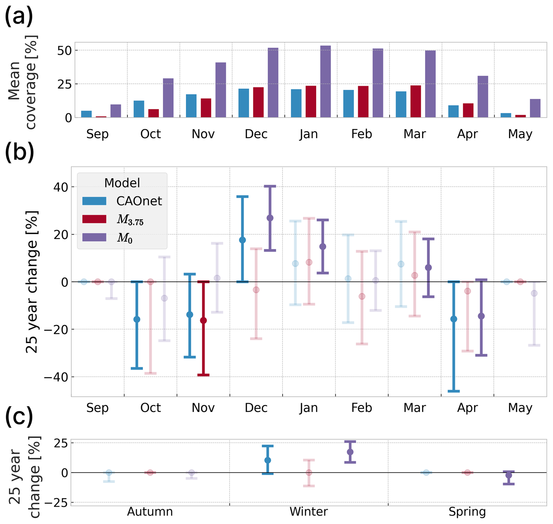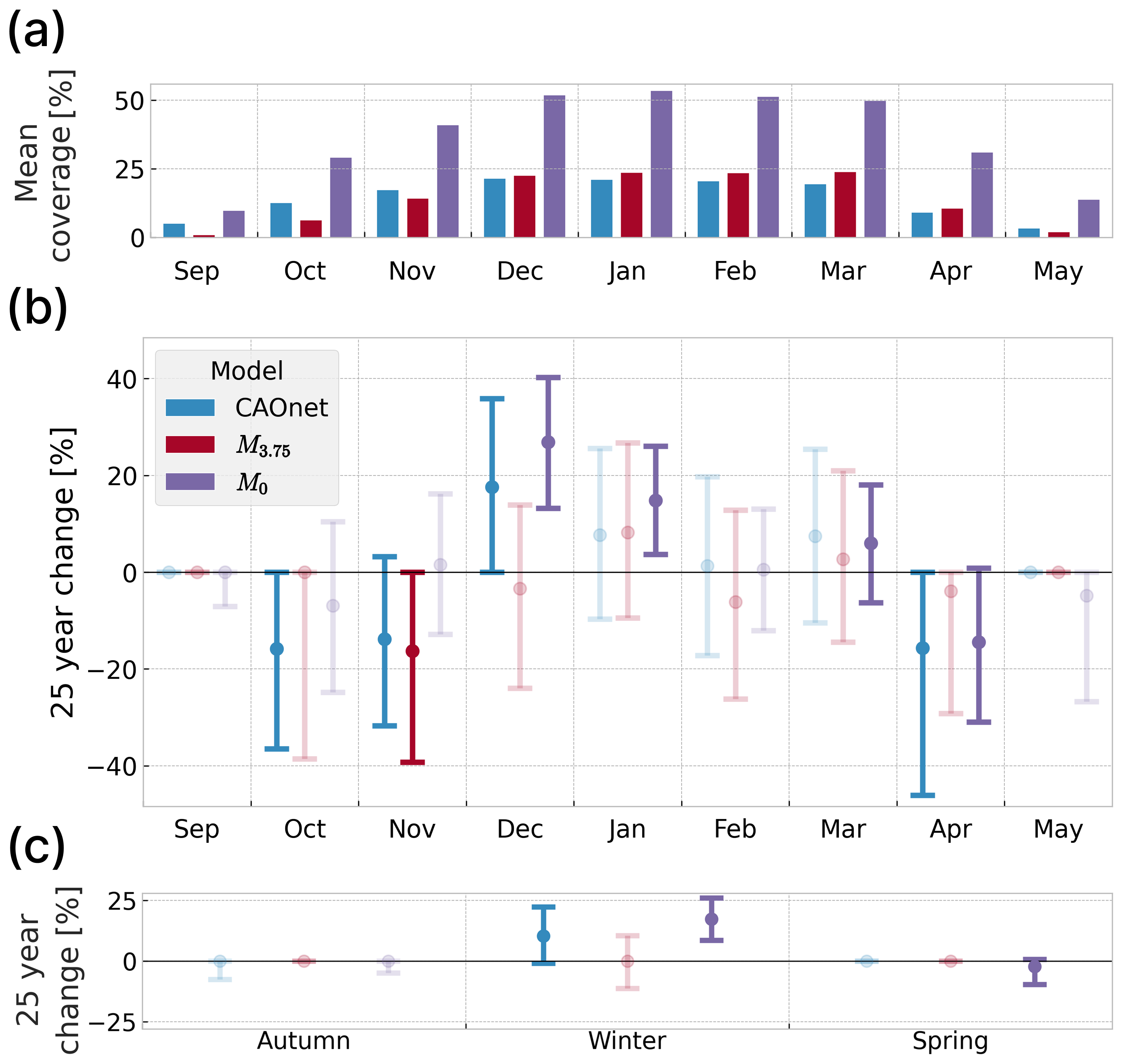 To investigate how CAO clouds are responding to a warming Arctic, trends in their coverage are analyzed. Figure 8b shows trends in CAO cloud coverage for September–May as a 25-year relative change for CAOnet and the M index calculated using MERRA-2. CAOnet suggests a seasonal trend in which the shoulder months of the CAO season (October, November and April) show a significant relative decrease in cloud coverage of nearly 20 %, in contrast to the winter season and December that show increases of approximately 10 % and almost 20 % respectively. While the winter increase is not significant on a month-by-month basis, except for December, the nearly 10 % total winter season trend in Fig. 8c is significant. As the winter also contains the highest CAO coverage (see Fig. 8a), this relative trend has a great impact on the total area covered by CAO clouds.
