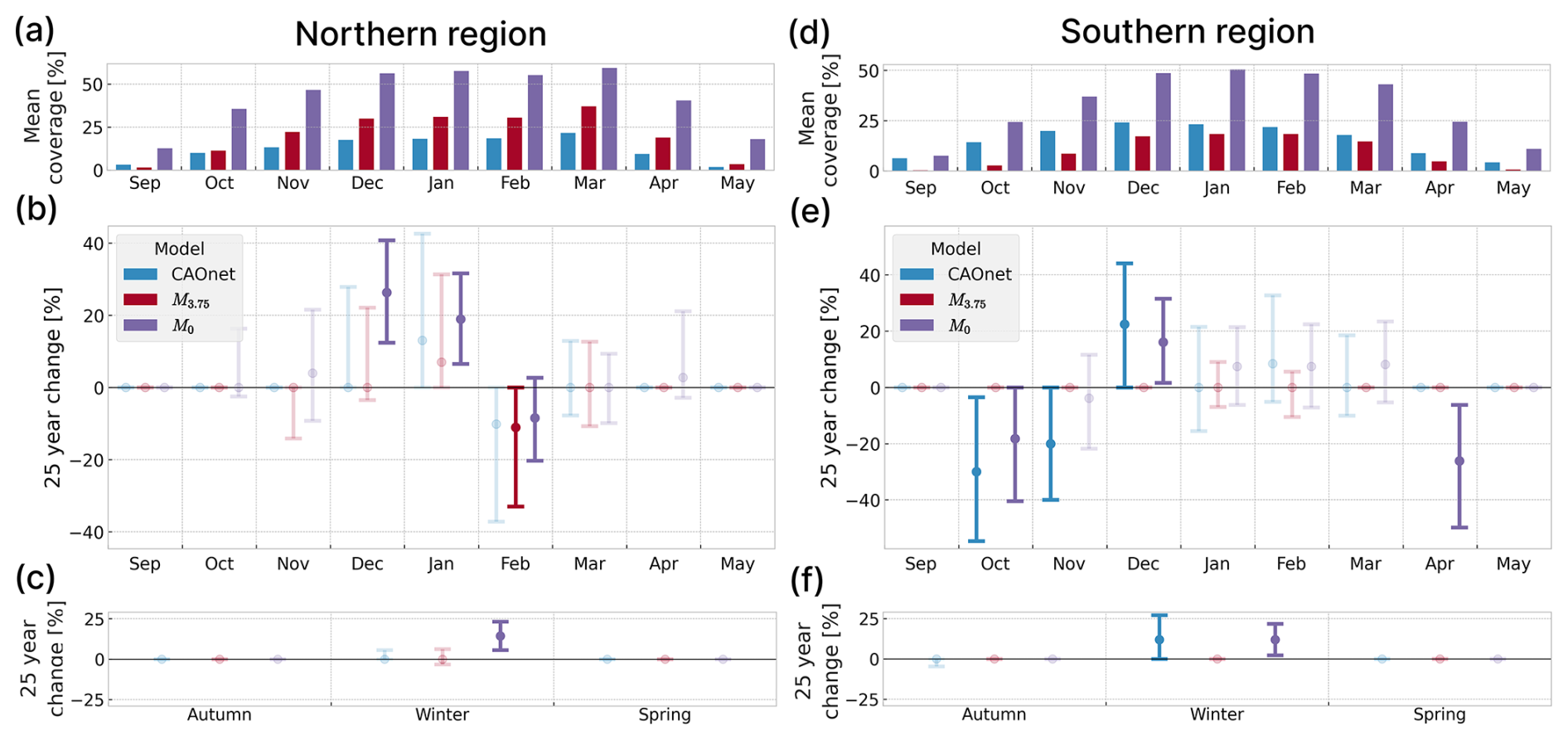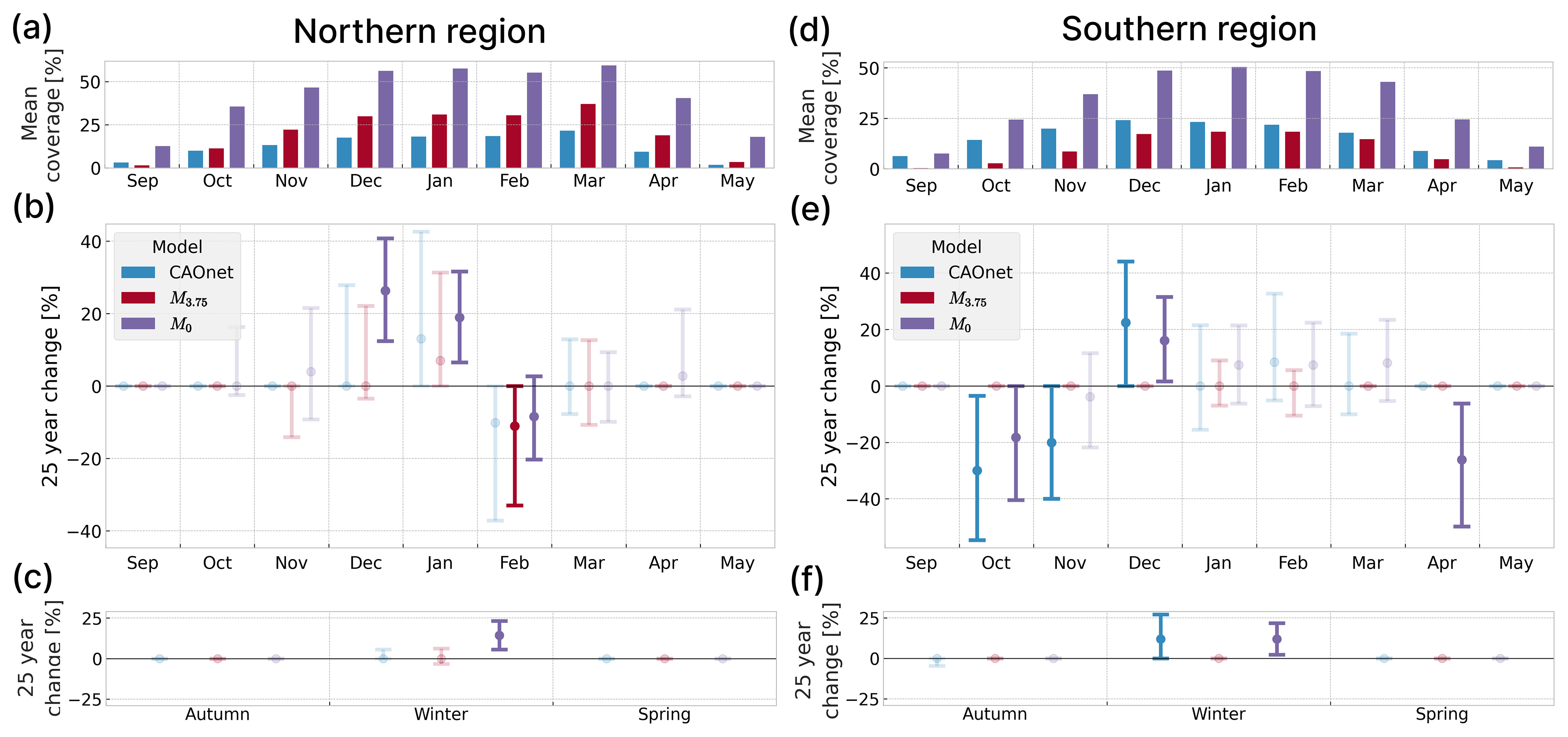 Figure 9 shows the trends and CAO cloud coverage for the northern (panels a–c) and southern regions (panels d–f). Similar to the whole domain in Fig. 8, the highest CAO coverage occurs in both regions during winter. However, there is a shift in maximum coverage towards late winter and spring in the northern region (a) for both the M index and CAOnet, while in the southern region CAOnet shows a shift towards early winter and autumn (d). In the North, the M index generally suggests more CAO coverage than CAOnet, whereas CAOnet suggests higher coverage than the M index in the South. This aligns with the climatology presented in Fig. 6, where the M index shows higher occurrences than CAOnet in the north and lower in the south.
