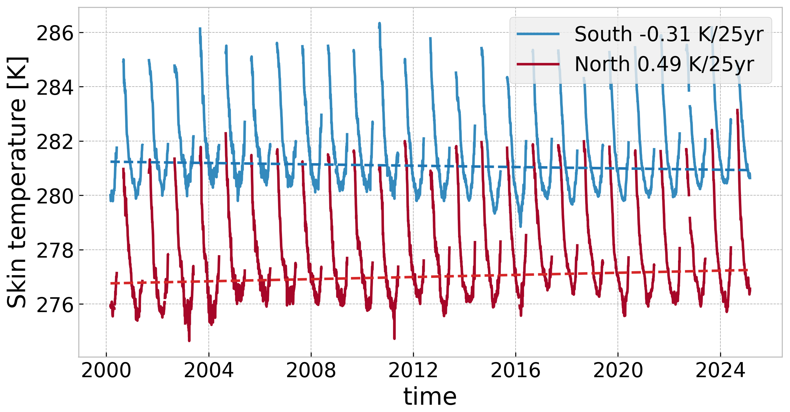 To better understand changes in the radiative impact of CAO clouds, it is important to study both seasonal and latitudinal trends. As the North Atlantic ocean stretching to the Arctic maintains fairly stable temperatures throughout the year (Fig. A2), the outgoing longwave radiation from the ocean surface remains close to constant. However, the incoming solar radiation may vary greatly, particularly in the winter season across the domain between 55 and 80° N. This latitudinal dependency motivates a separate trend analysis for the southern and northern part of the domain (see Fig. 2).