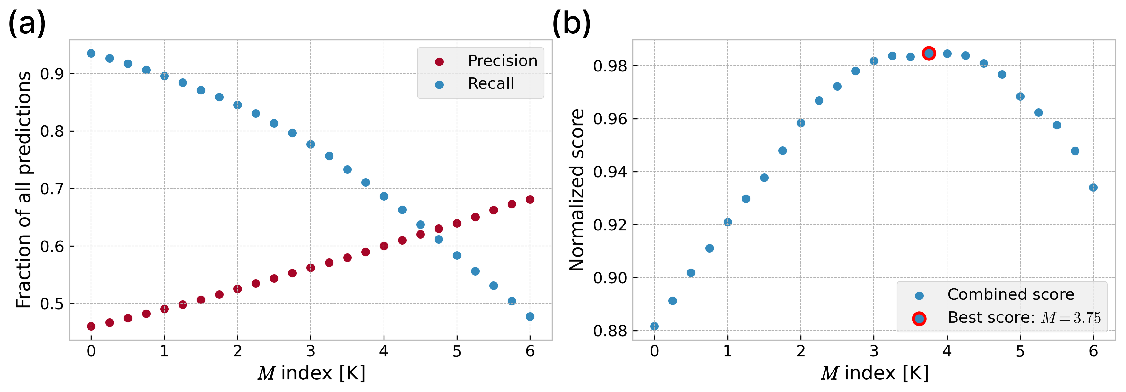 Finally, a combination of the Fβ and MCC score can be calculated for a final evaluation score. By normalizing Fβ and MCC over all models to be evaluated, the MCC and Fβ scores equally contribute to the combined score (s) given as: