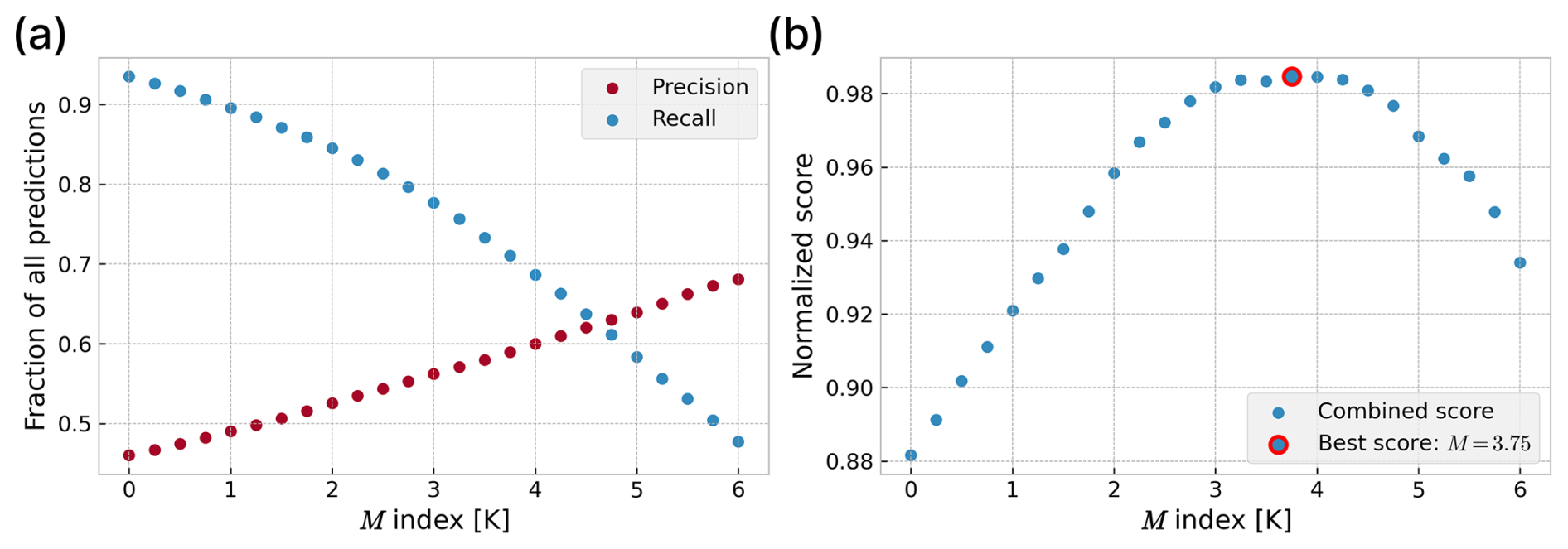 Here, β is a parameter which denotes the relative importance of recall compared to precision. Although the F1 score with β=1 is typically used, a final β of , valuing precision 1.75 times more than recall was chosen. This reflects a willingness to miss some true positives in order to reduce the number of false positives. It is expected that the model will be able to accurately classify clear CAO cases, and by prioritizing precision over recall, the risk of false positives biasing the data is minimized even if it results in oversight of less typical CAO cloud structures.