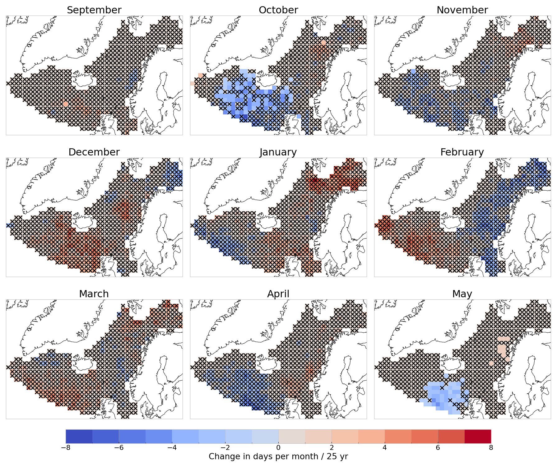 The resulting significant trends indicate a decreasing occurrence of CAO clouds in the southern region for both October and May over the past 25 years. This aligns with the cloud coverage trends for October shown in Fig. 8, and further supports the observed trend seasonality, suggesting a shortening of the CAO season.