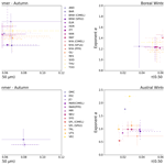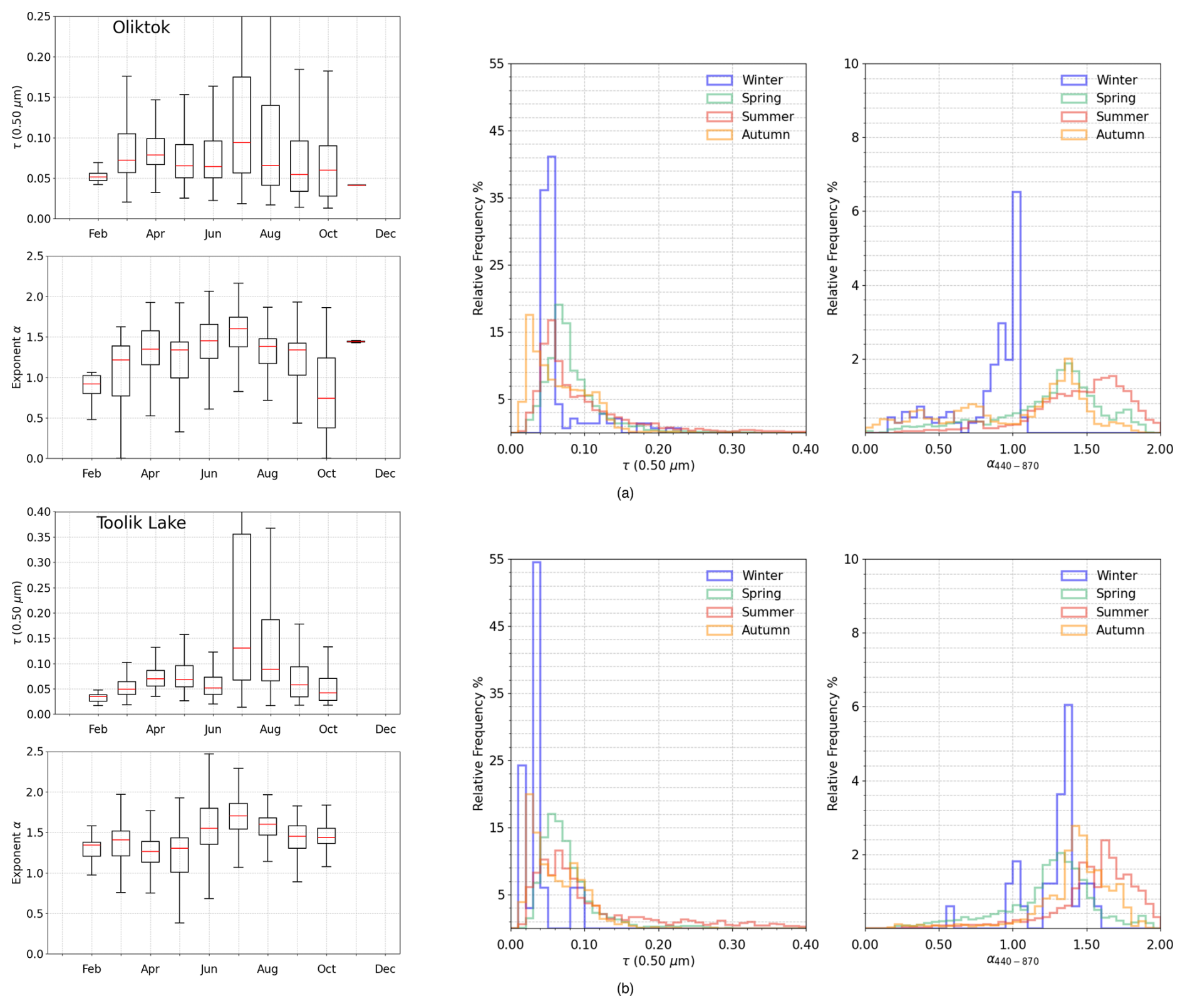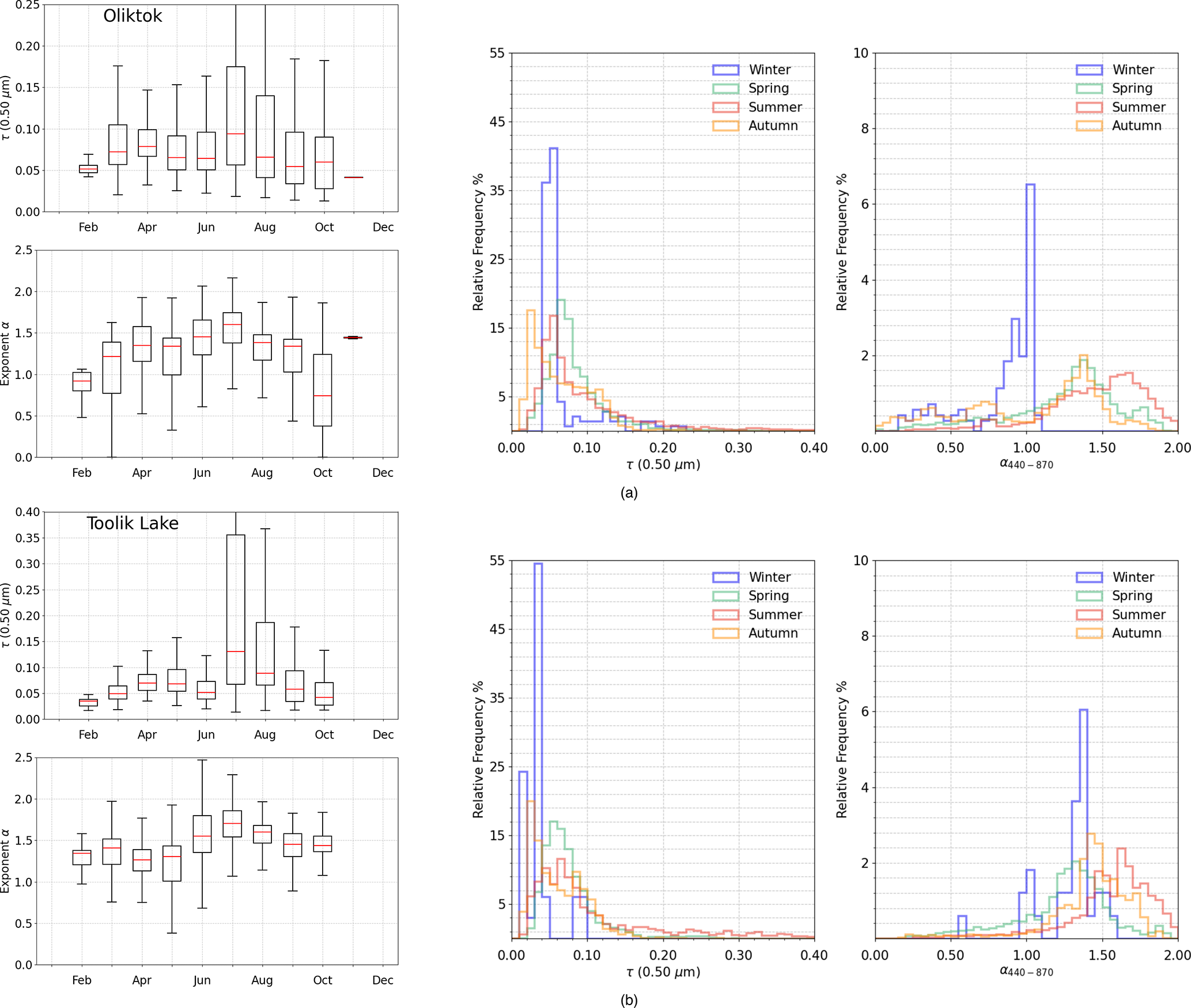 The seasonal AOD distributions at Barrow and Toolik Lake show patterns that are consistent with observations from other Arctic sites. The distributions are shifted toward higher values during spring – and occasionally winter – reflecting the influence of Arctic Haze. In contrast, summer and autumn exhibit lower median AOD values. However, these two seasons show extended distribution tails toward higher values, which explain the higher mean AOD. For the Ångström Exponent α, the seasonal behavior differs. The winter distribution is skewed toward lower values, indicating a larger effective particle size. In contrast, the summer distribution is shifted toward higher α values, consistent with a dominance of fine-mode aerosols. The spring and autumn distributions are relatively similar and represent transitional aerosol conditions.