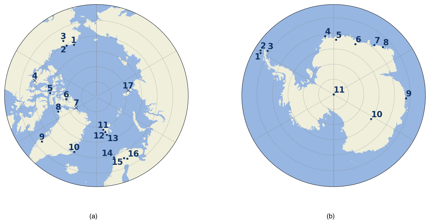 Figure 1(a) Map of the Arctic showing the geographical position of the stations labeled as follows: (1) Barrow, (2) Oliktok, (3) Toolik Lake, (4) Cambridge Bay, (5) Resolute Bay, (6) Eureka (OPAL), (7) Alert, (8) Thule, (9) Kangerlussuaq, (10) Ittoqqortoormiit, (11) Ny-Ålesund, (12) Barentsburg, (13) Hornsund, (14) Andenes, (15) Matorova, (16) Sodankylä, and (17) Cape Baranova. Panel (b) presents a map for the Antarctic stations, with the locations marked as: (1) Juan Carlos I, (2) Escudero, (3) Marambio, (4) Neumayer, (5) Troll/Trollhaugen, (6) Utsteinen, (7) Syowa, (8) Vechernaya Hill, (9) Mirny, (10) DomeC and (11) South Pole. Stations marked with “X” have been studied but not shown in this paper.