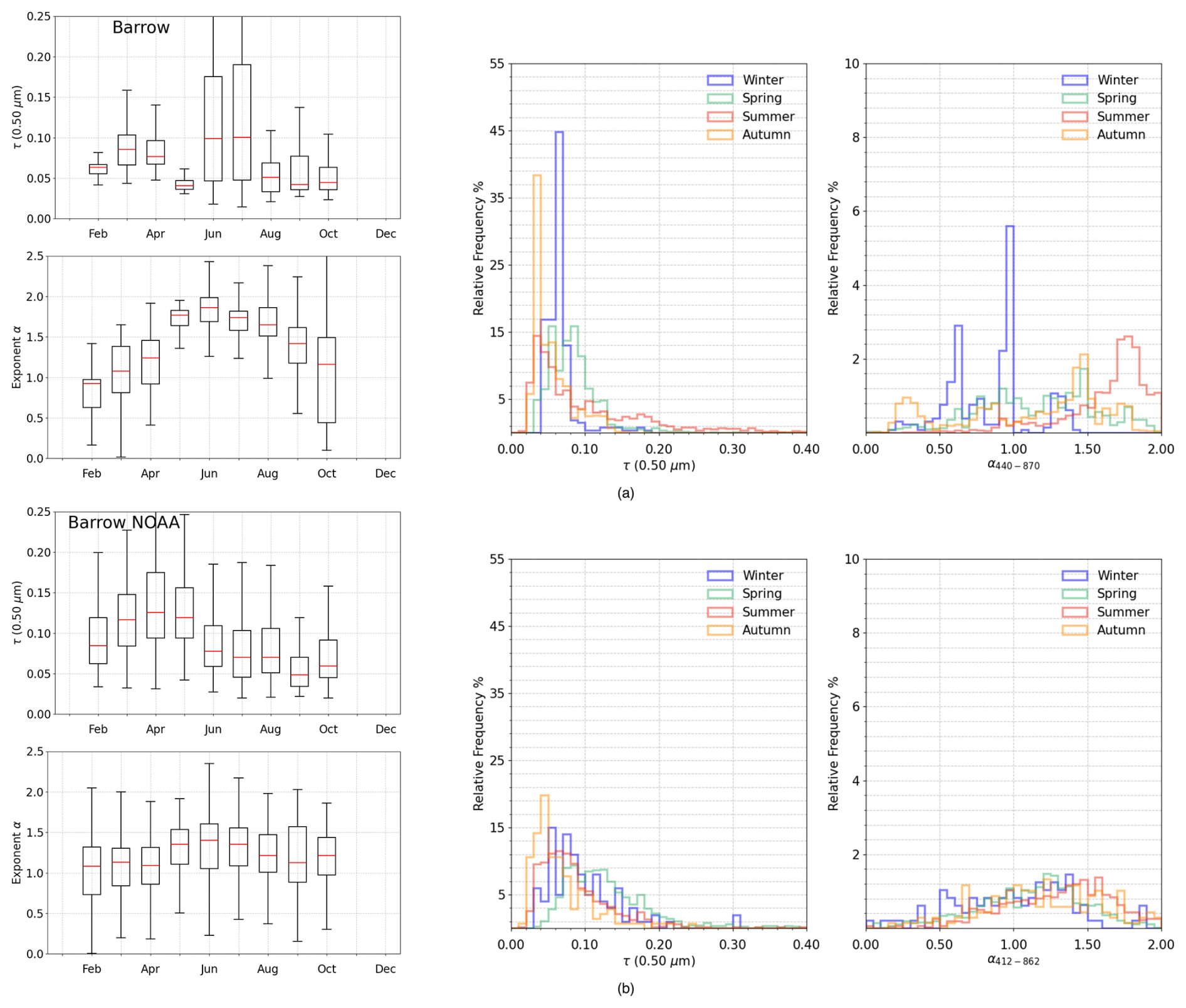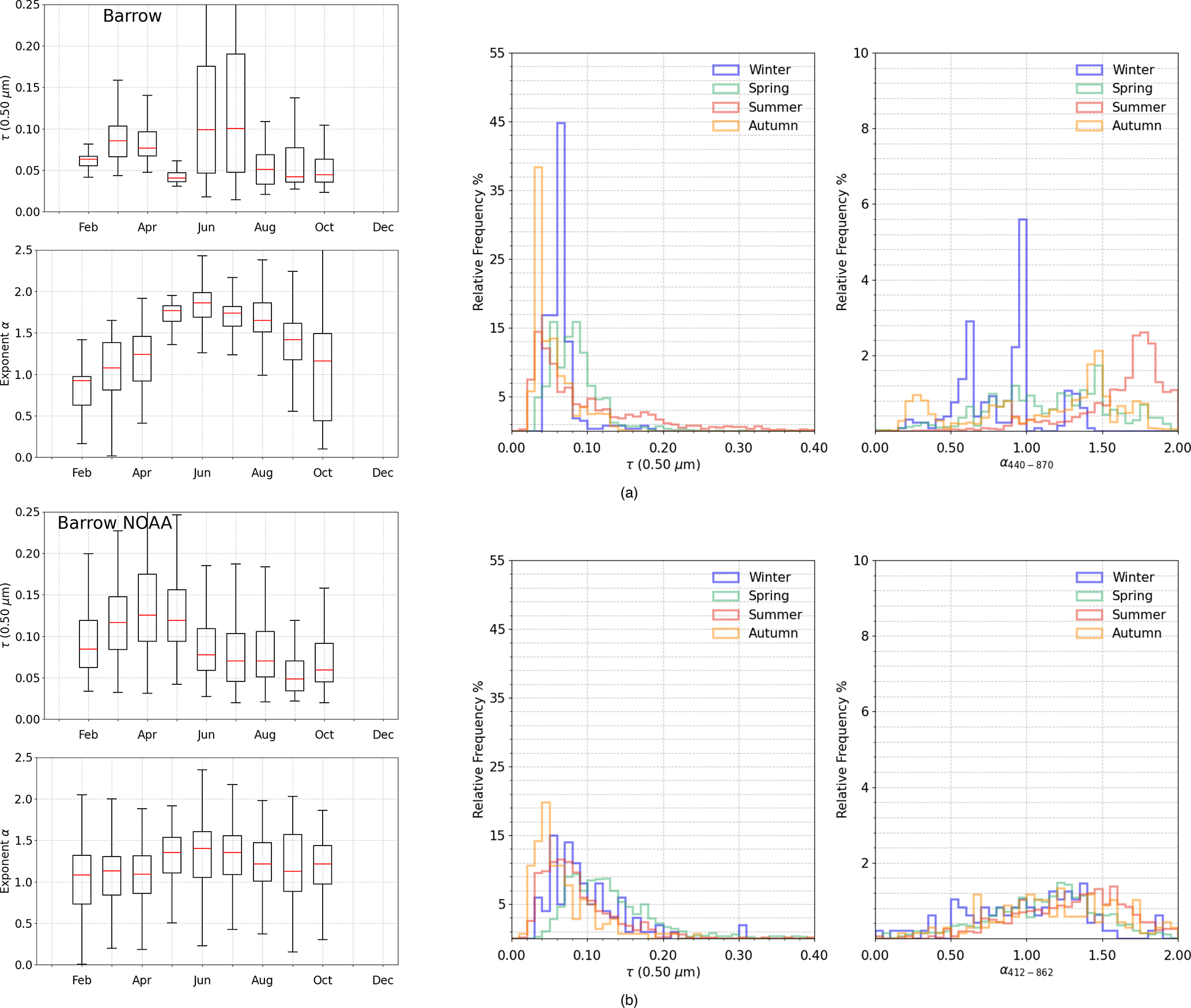 Figure 2Left-hand side: Time-patterns of the monthly mean values and the first and third quartiles of aerosol optical thickness τ(0.500 µm) and the Ångström exponent α. The whiskers extend from the box to the farthest data point within 1.5 times the interquartile range (IQR) from the box. Right-hand side: relative frequency histograms for τ(0.500 µm) and α separately for winter (arctic haze, DJF), spring (MAM), summer (background, JJA), and autumn (SON). These statistics were obtained from multi-year sun-photometer measurements conducted at Barrow by (a) Atmospheric Radiation Measurements, and by (b) National Oceanic and Atmospheric Administration.