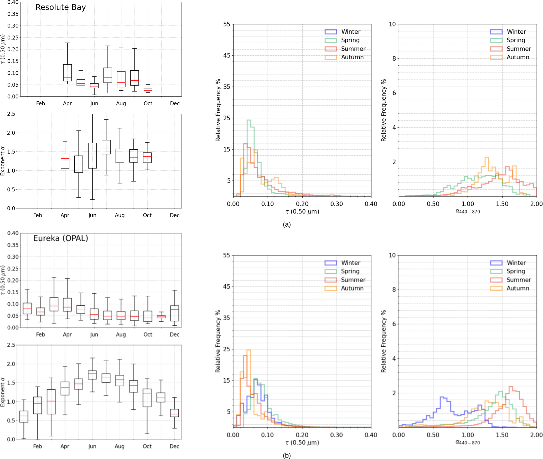 The results from AERONET measurements conducted in the Canadian Arctic at Resolute Bay (July 2004 to December 2023) and Eureka (OPAL) (April 2007 to December 2023) are shown in Fig. 4. At Resolute Bay, a CIMEL CE318 sun-sky photometer measured aerosol optical thickness during the spring-summer period, when the solar airmass was above the acceptance threshold. At Eureka, a sun-sky-lunar photometer (model CE318-T) was installed in April 2016, allowing for additional measurements of τ and exponent α during the polar night.