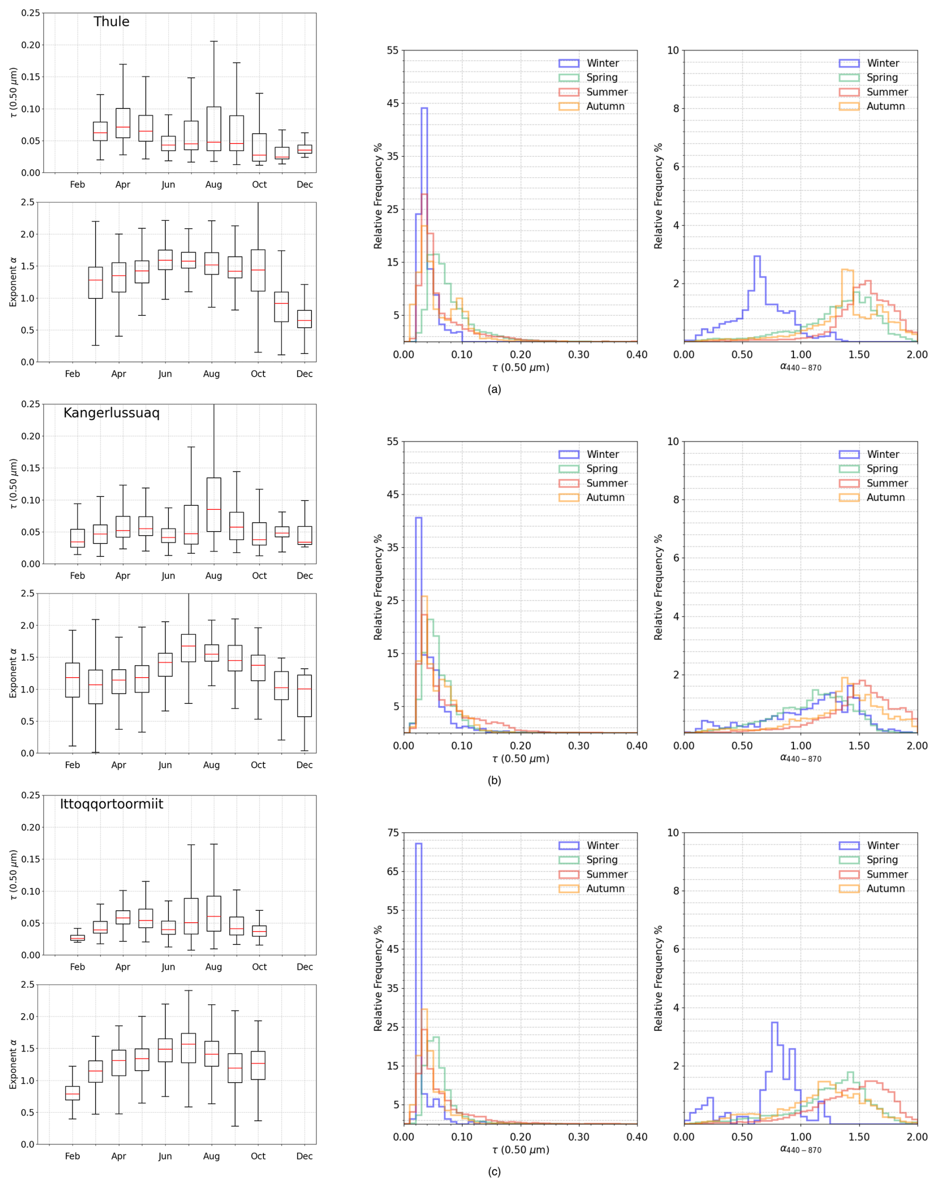 Figure 5 shows the results from multi-year sun-photometer measurements conducted at three locations in Greenland: (i) Thule in central-west coast of Greenland, (ii) Kangerlussuaq on the southwest coast, and (iii) Ittoqqortoormiit on the east coast. All sites are managed by NASA Goddard Space Flight Center (see Table 1 for more details).