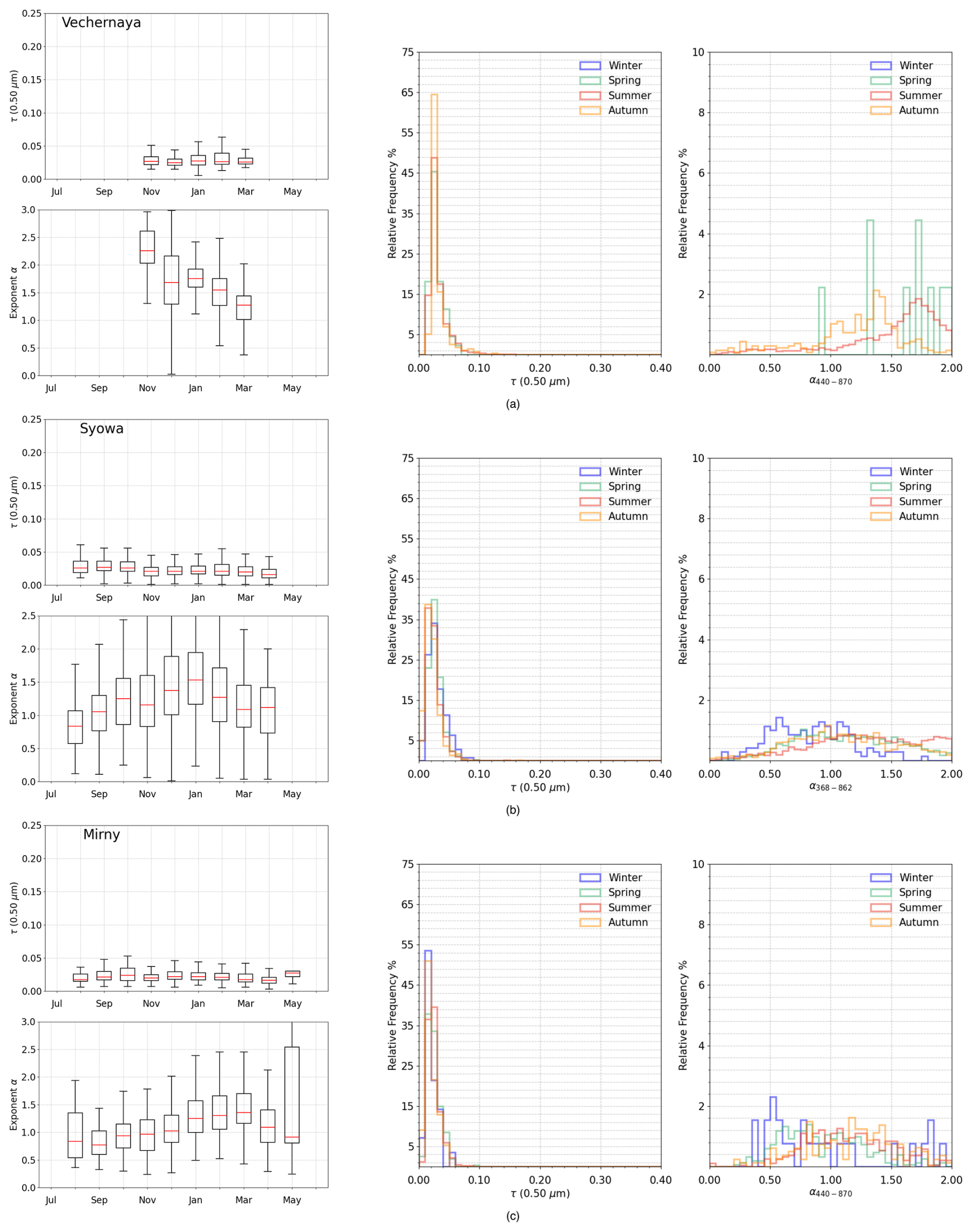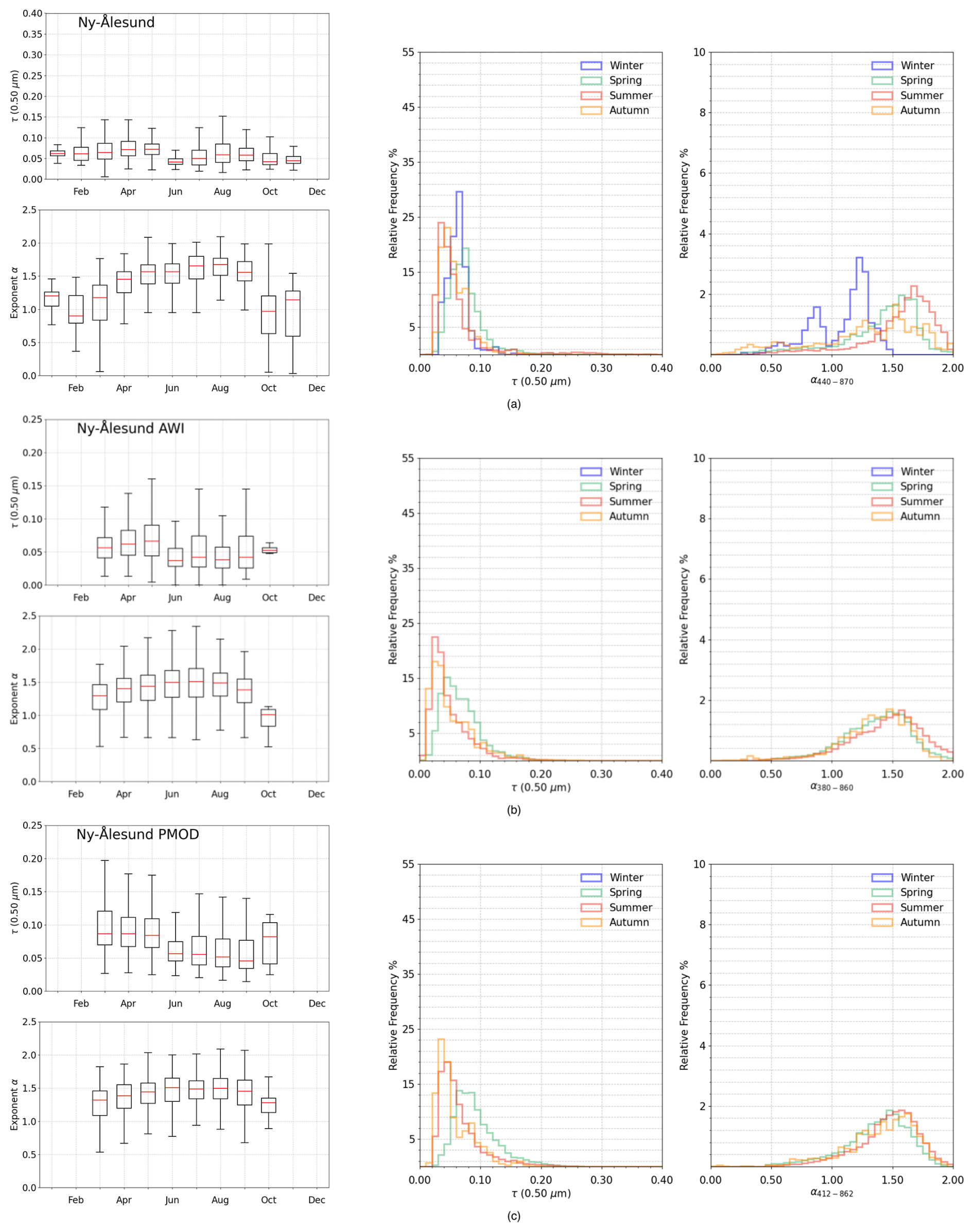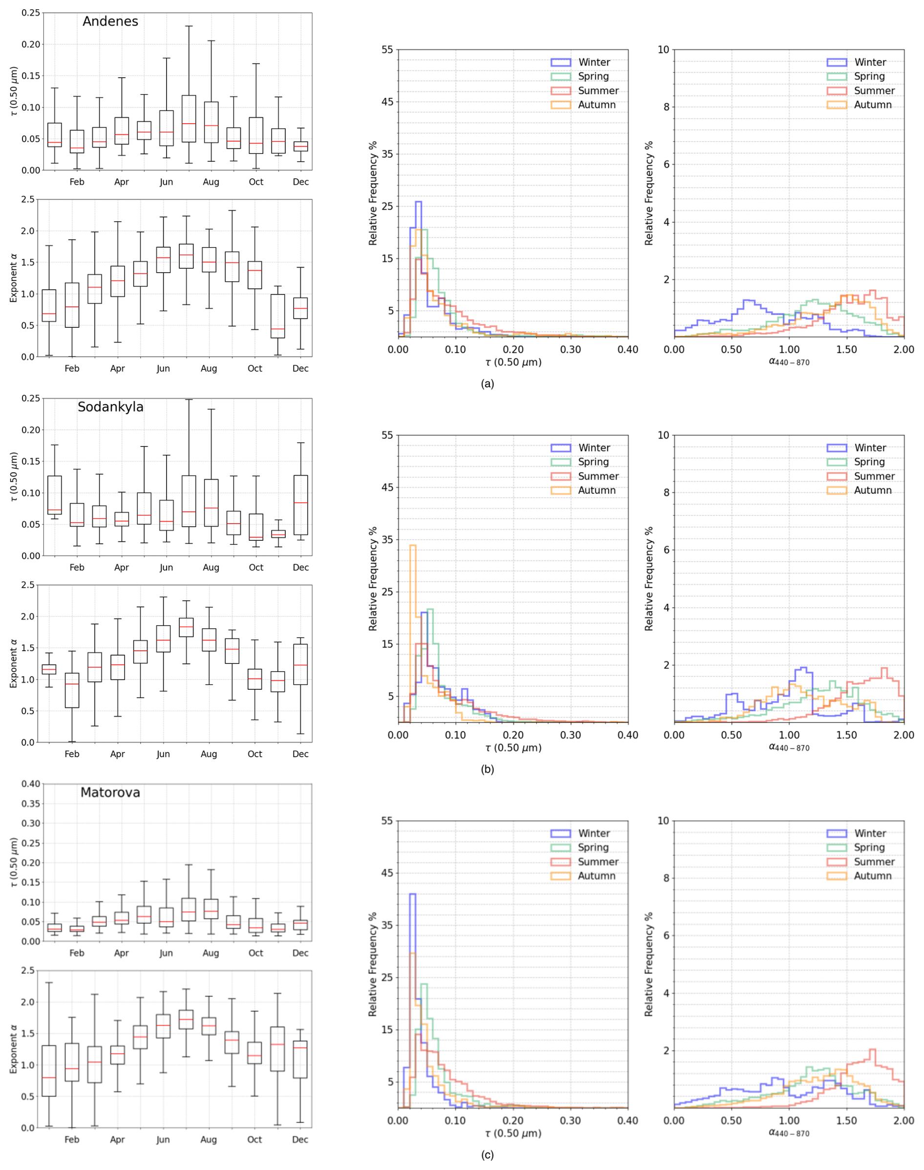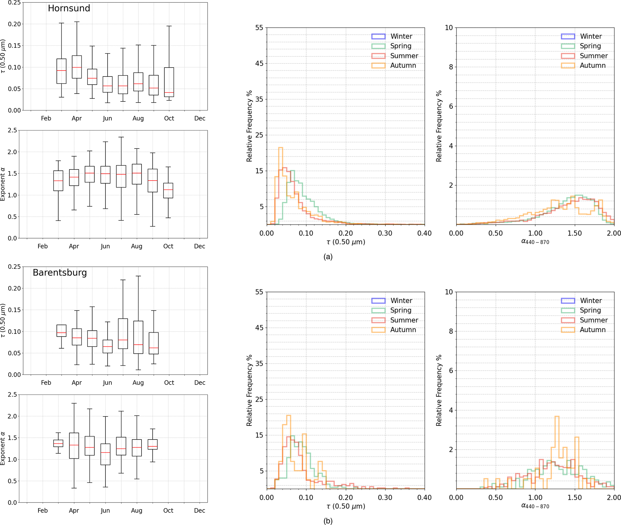We also defined relative frequency histograms for both parameters during the following seasons: winter (December to February), when intrusions of polluted particles into the Arctic atmosphere are more frequent; spring (March to May); summer (June to August), to characterize background aerosols; and autumn (September to November).