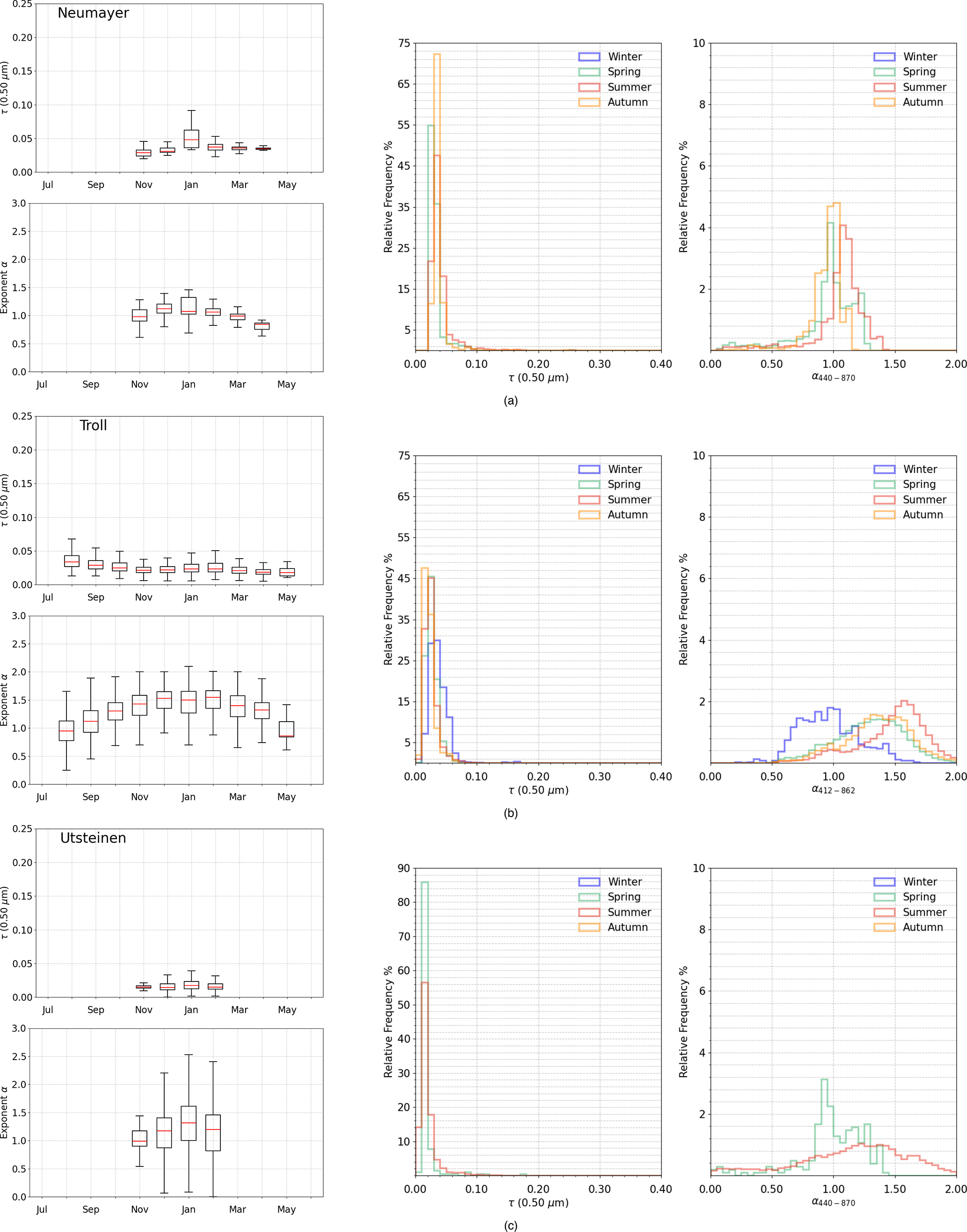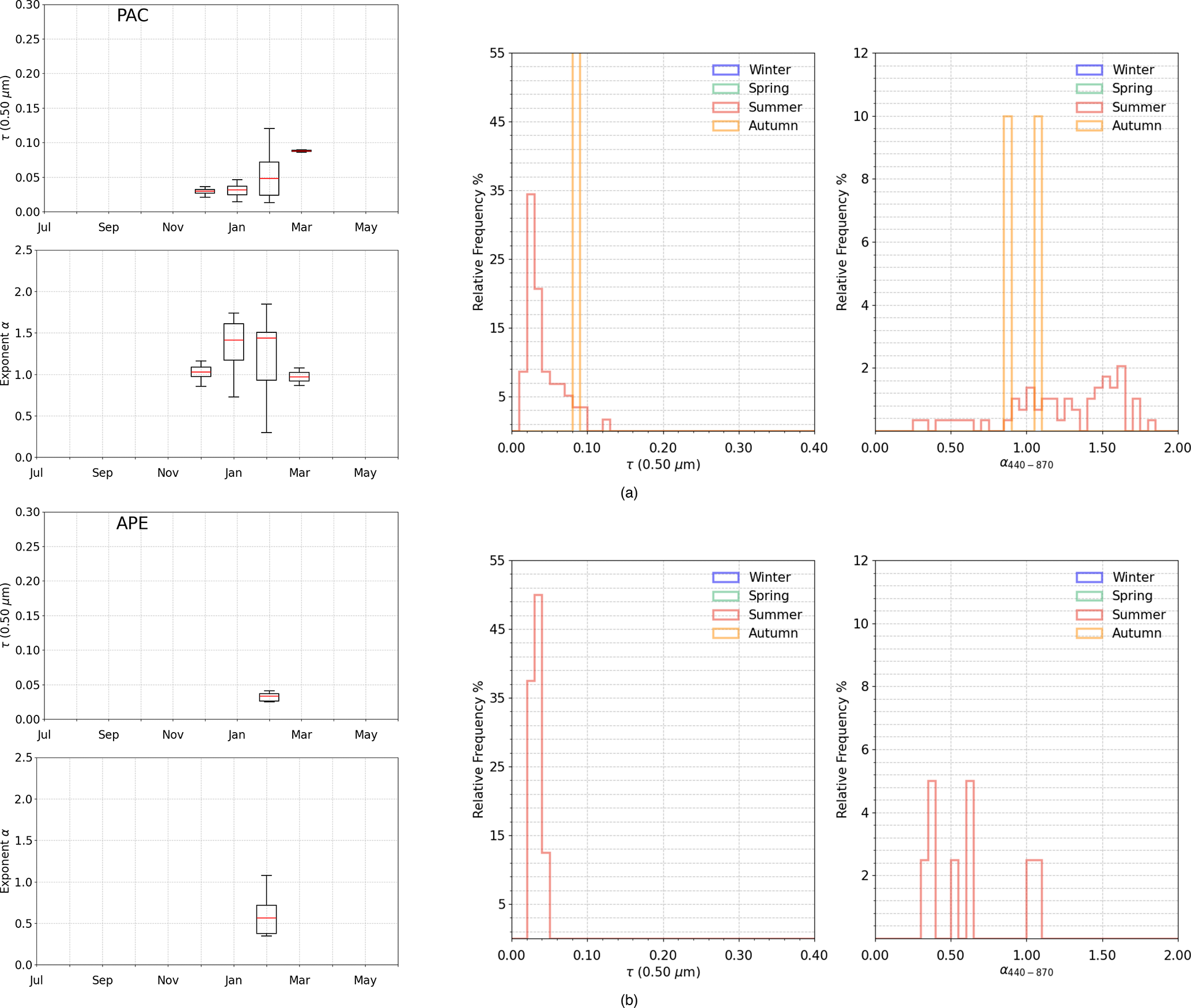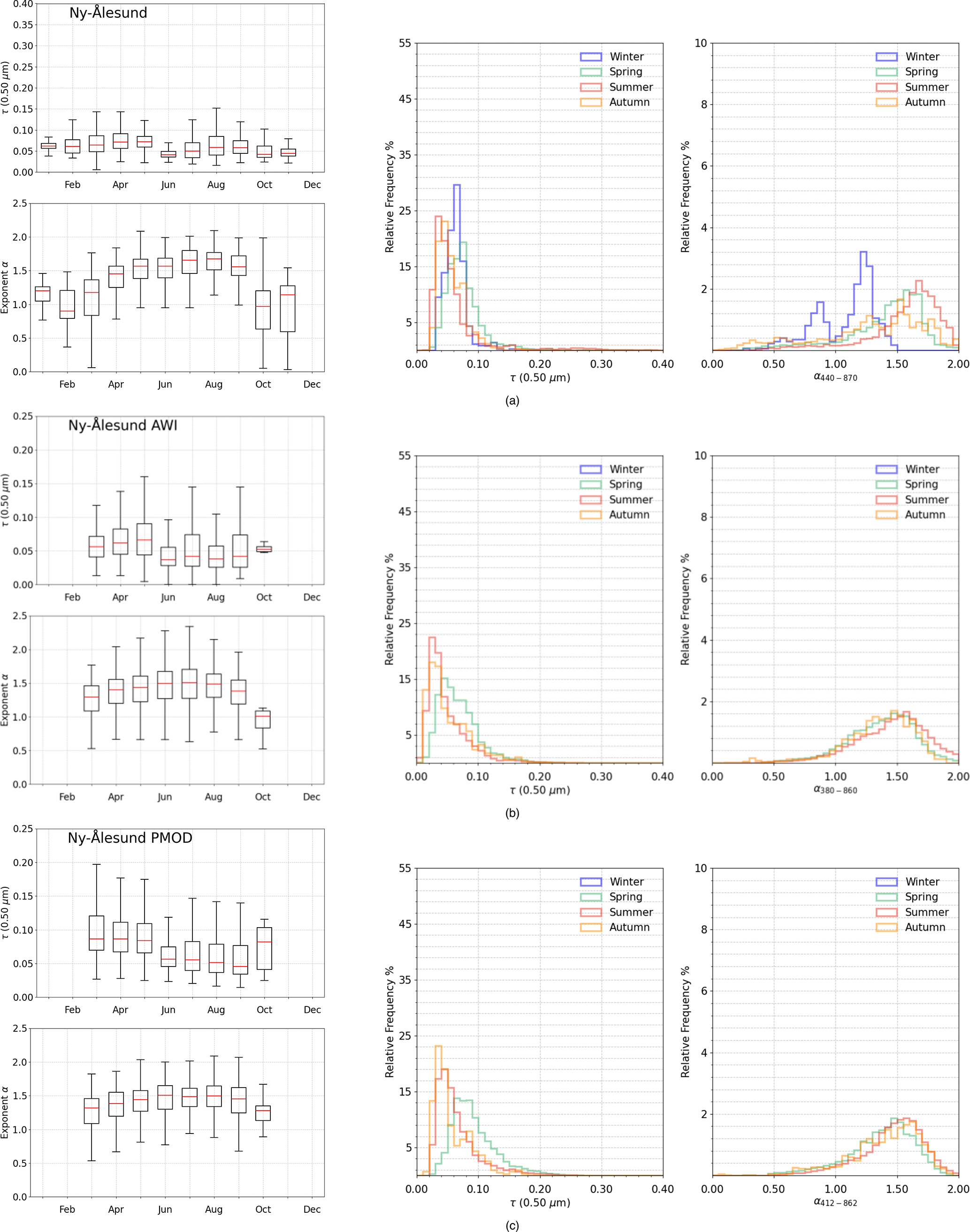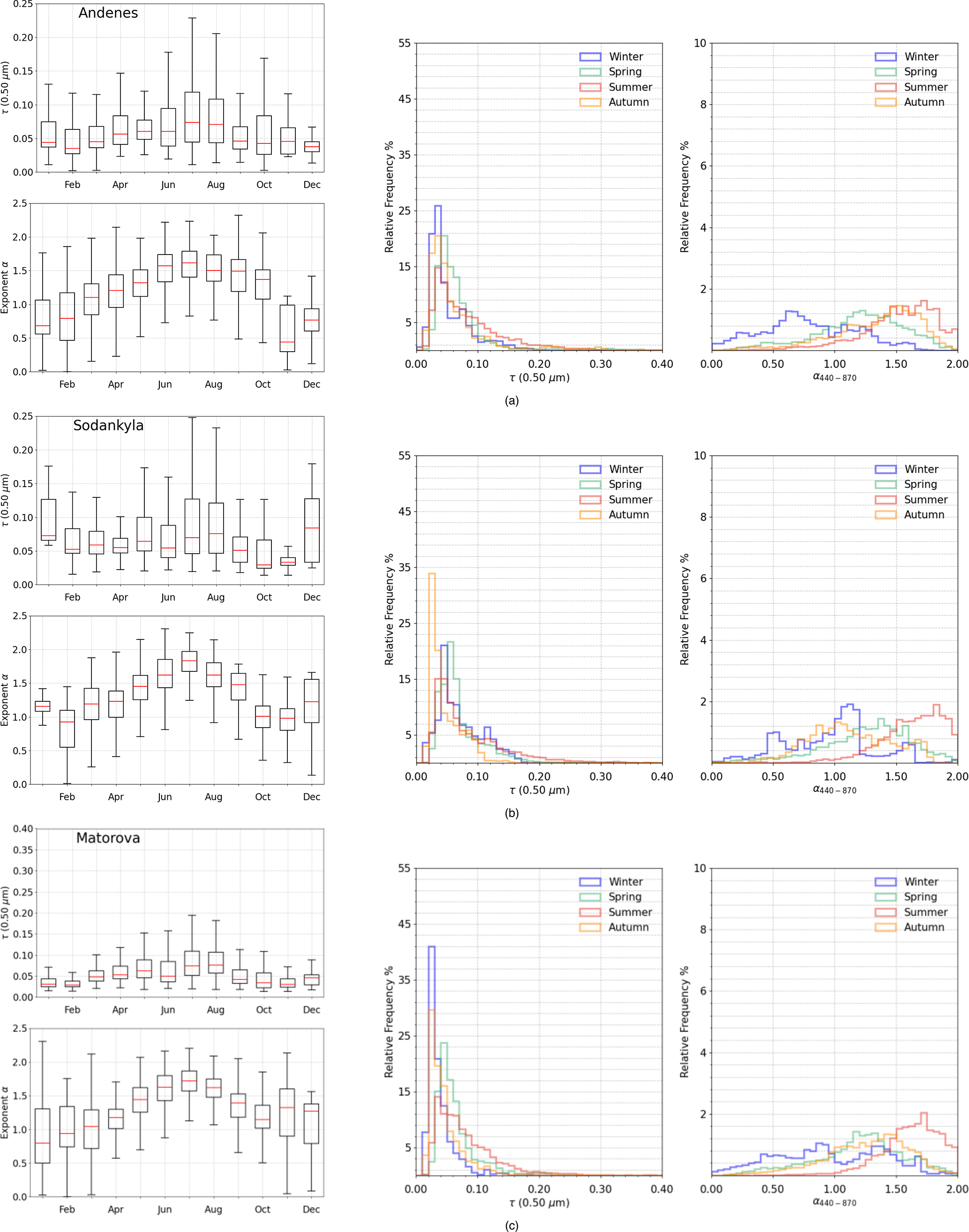 We also defined relative frequency histograms for both parameters during the following seasons: winter (December to February), when intrusions of polluted particles into the Arctic atmosphere are more frequent; spring (March to May); summer (June to August), to characterize background aerosols; and autumn (September to November).