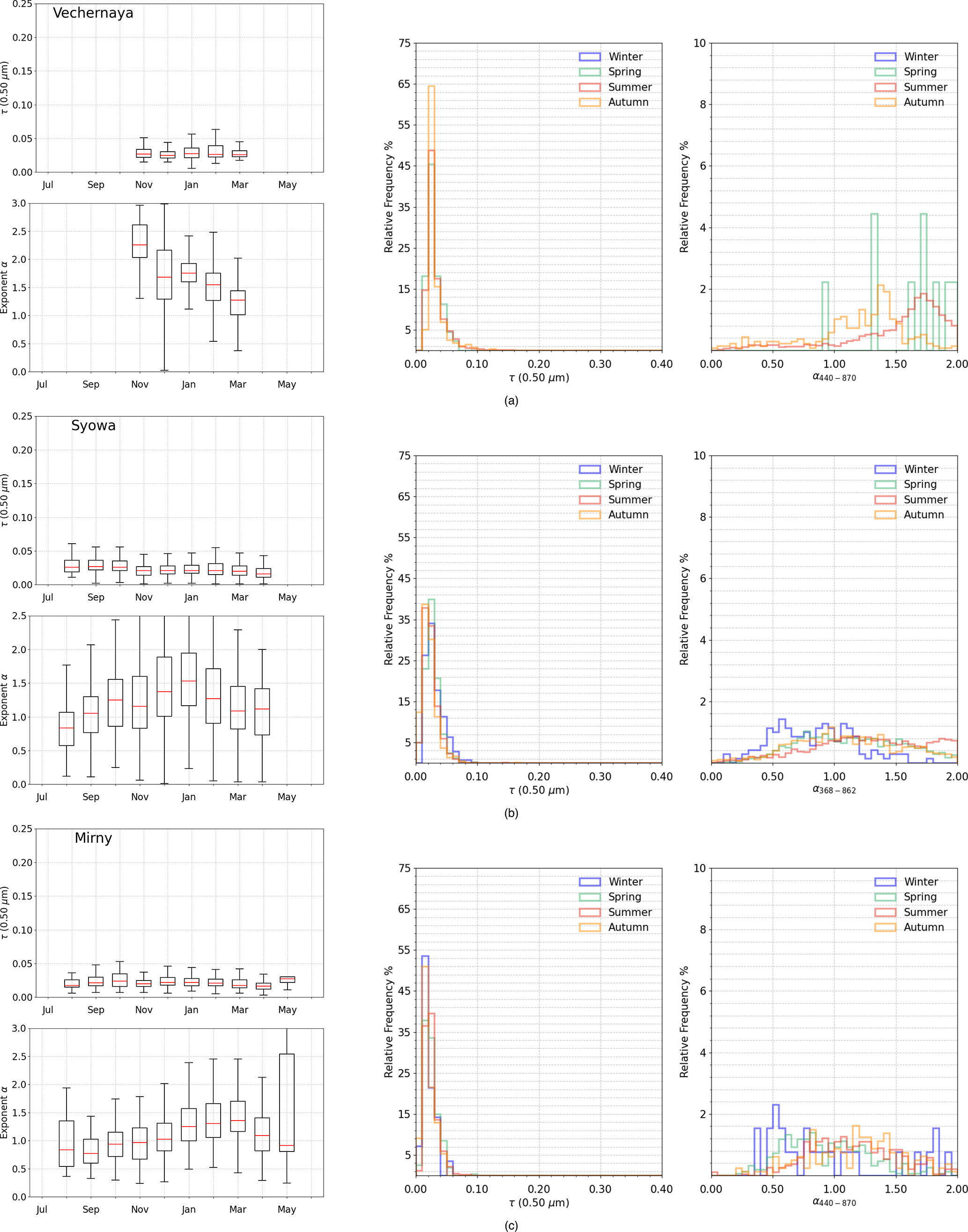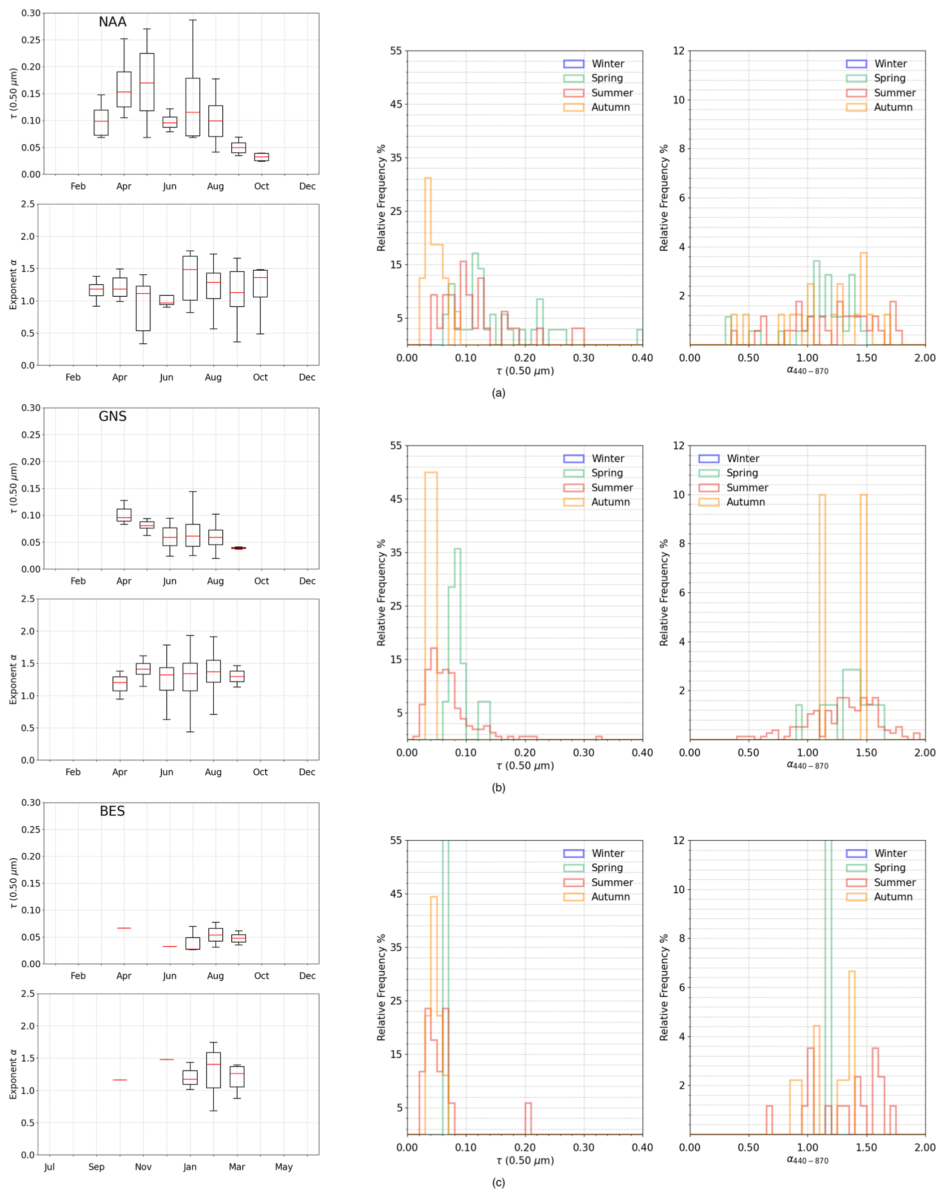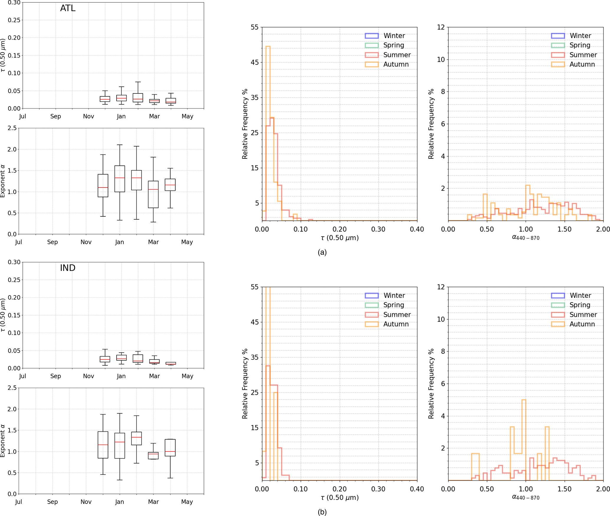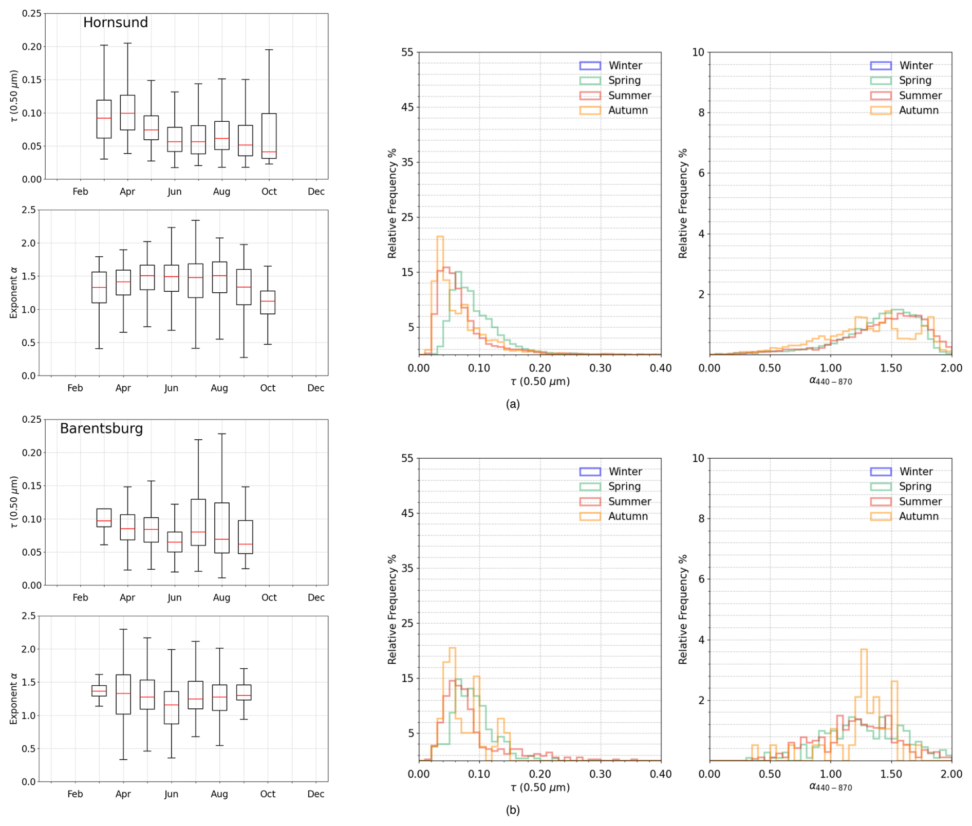 We also defined relative frequency histograms for both parameters during the following seasons: winter (December to February), when intrusions of polluted particles into the Arctic atmosphere are more frequent; spring (March to May); summer (June to August), to characterize background aerosols; and autumn (September to November).