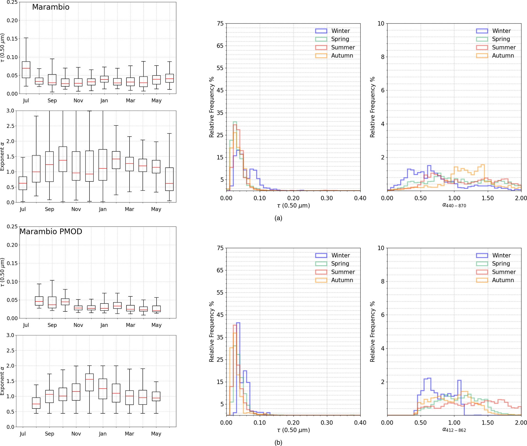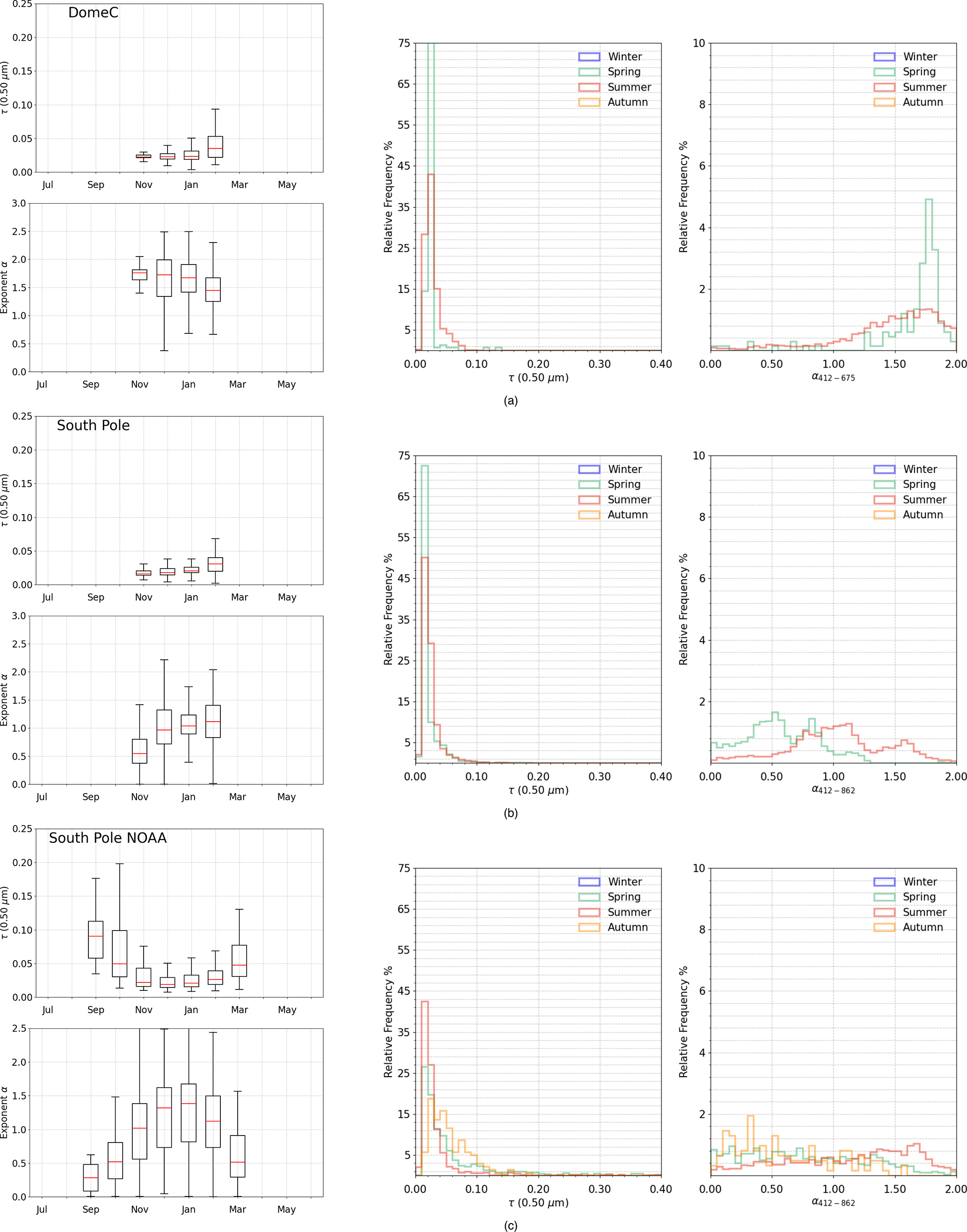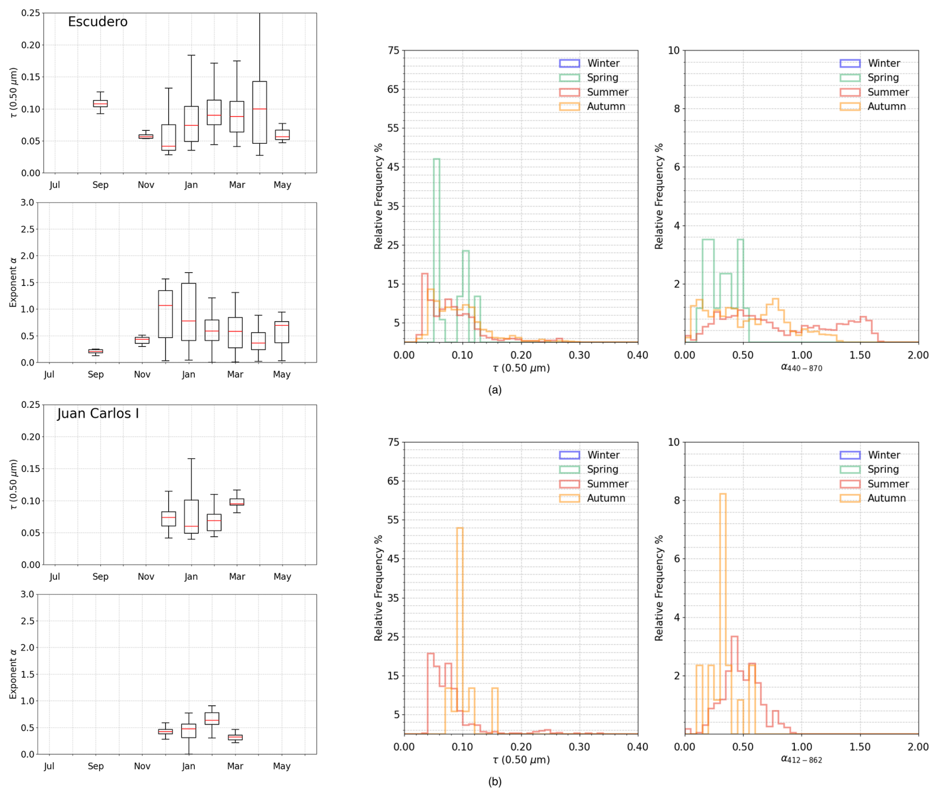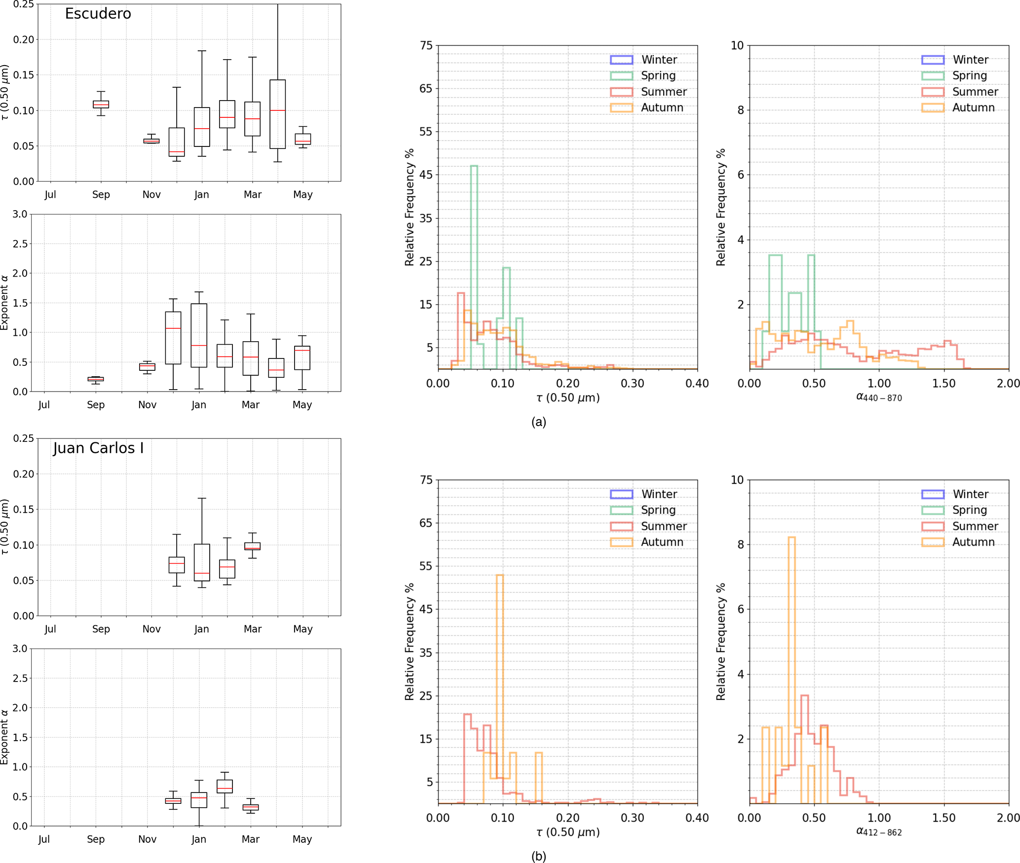 We also defined relative frequency histograms for both parameters during the following seasons: winter (December to February), when intrusions of polluted particles into the Arctic atmosphere are more frequent; spring (March to May); summer (June to August), to characterize background aerosols; and autumn (September to November).