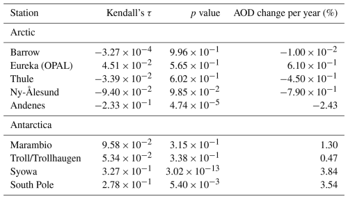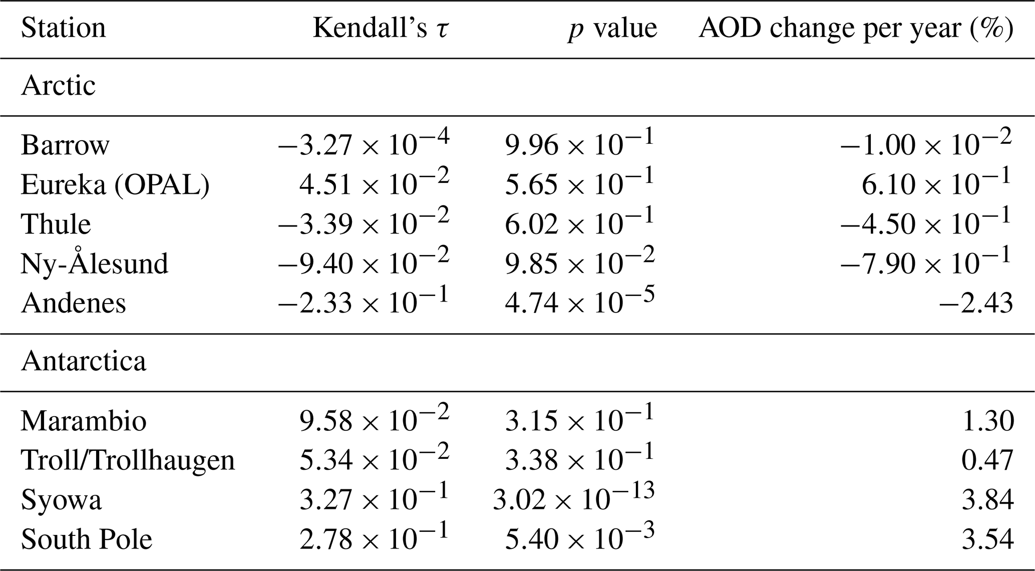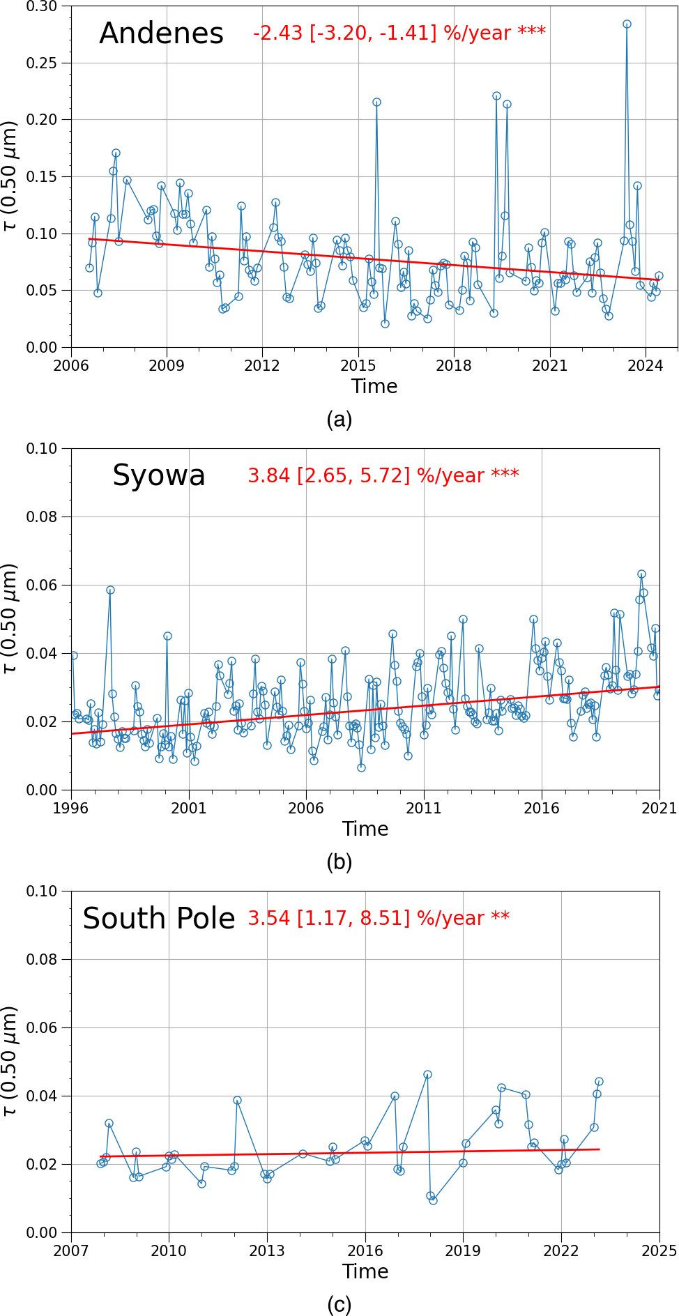 Trend analyses using the Mann-Kendall test and Theil-Sen regression indicate a significant negative trend in τ at Andenes (−2.43 % per year), likely driven by reduced anthropogenic emissions. Antarctic stations such as Syowa and South Pole show positive trends (+3.84 % and +3.54 % per year), though these are subject to uncertainties from data limitations and instrument changes.