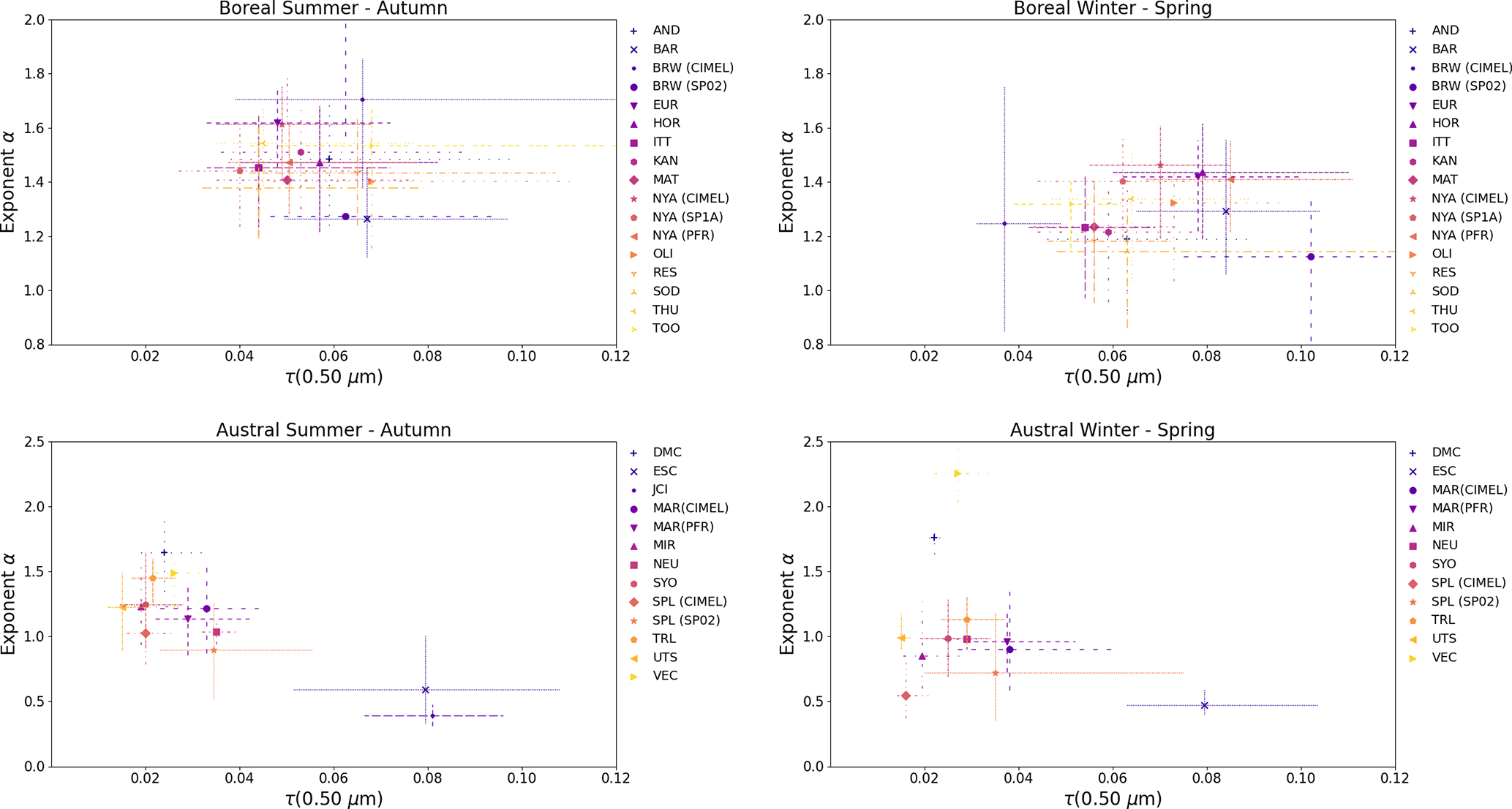 To conduct an in-depth analysis of polar aerosol optical characteristics, sun- and moon-photometer measurements of τ across various spectral channels in the visible and near-infrared can be examined to evaluate the Ångström exponent α, as described by Eq. (4).