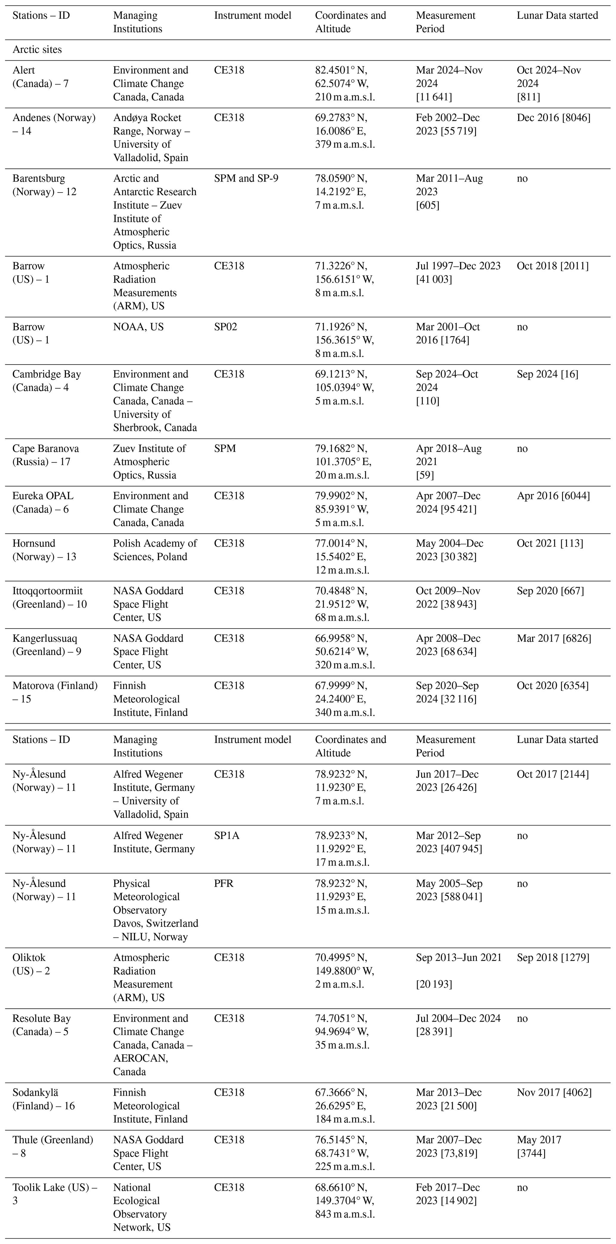 Table 1List of Arctic stations using different models of photometer. For each station, the coordinates and altitude are specified, along with the measurement period for solar photometry and the installation period for the lunar model. The number of measurements for both the solar and lunar periods is provided in parentheses.