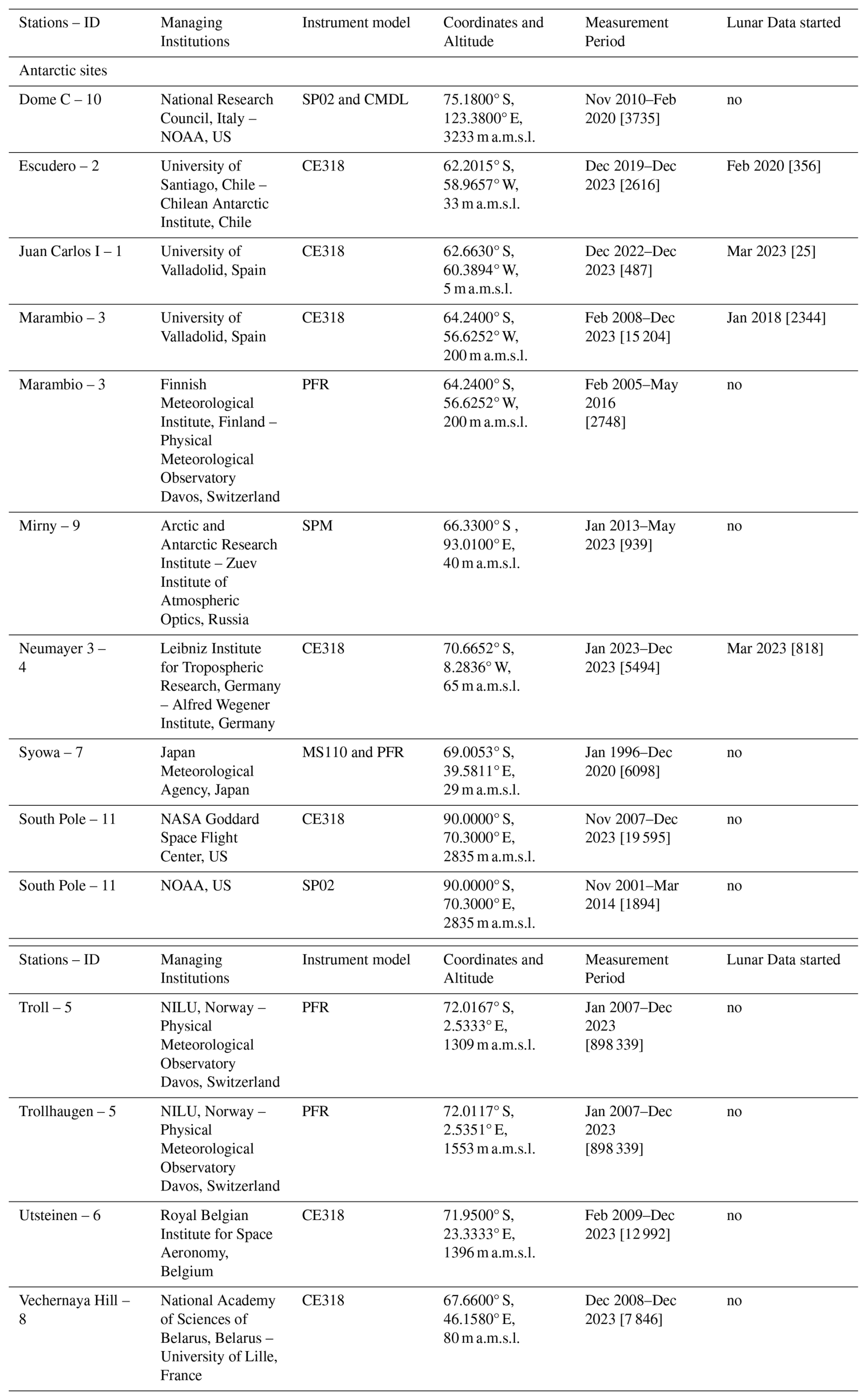 The aim of this paper is to update the aerosol climatologies at both poles, developing the work published by Tomasi et al. (2015). This study was limited by the technology available at the time, relying solely on the solar photometry technique. This posed a significant limitation for scientists working in polar regions, where the Sun is absent for several months during the polar night. For example, at the Arctic station of Ny-Ålesund (Svalbard, Norway), the Sun remains below 5° of elevation from 10 October to 4 March, severely restricting the period available for conventional photometric measurements. To overcome this challenge, Lidar instruments can be used, as they provide aerosol extinction profiles even at night, which can then be converted to optical depth for comparison with photometric data. However, there are too few Lidar systems in polar regions to provide a comprehensive image of these environments. The lunar photometry technique, which has developed over the last decade, has proven to be a suitable technique in polar areas, where τ values are often below 0.05 (Mazzola et al., 2024). To address this issue and fill historical gaps in τ climatology, it has been proposed to use solar and lunar photometry techniques in synergy. AERONET stations at both poles with measurements up to December 2024, have been selected for this work (AERONET: https://aeronet.gsfc.nasa.gov/, last access: 15 May 2025).