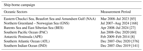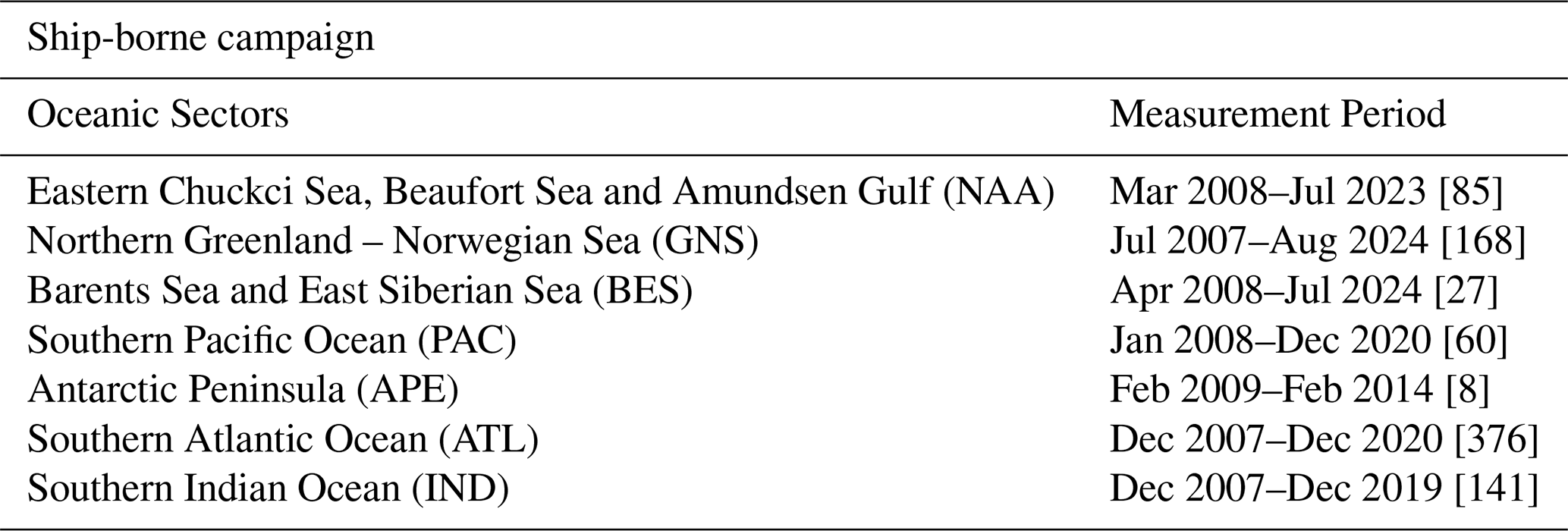 We focused primarily on AERONET sites in both the Arctic and Antarctica, as this network provides highly accurate AOD measurements (accuracy of 0.01 for the visible and NIR wavelengths at optical airmass of 1) and has the widest coverage at the poles. The high latitudes of these sites result in large airmass values, typically in the range of 2 to 7. This leads to a reduction in AOD calibration uncertainty by a factor of , where m is the airmass (Eck et al., 1999). In 2018, the latest AERONET Version 3 (V3) algorithm was published, featuring a fully automatic cloud screening procedure and instrument anomaly controls (Giles et al., 2019). AERONET includes a component dedicated to ship-borne AOD measurements using the manual sun photometer Microtops II. Since 2004, this instrument has been routinely deployed on research vessels to monitor aerosol properties over the oceans. The Maritime Aerosol Network (MAN) enables the study and evaluation of aerosol properties across various oceanic regions, including polar sectors.