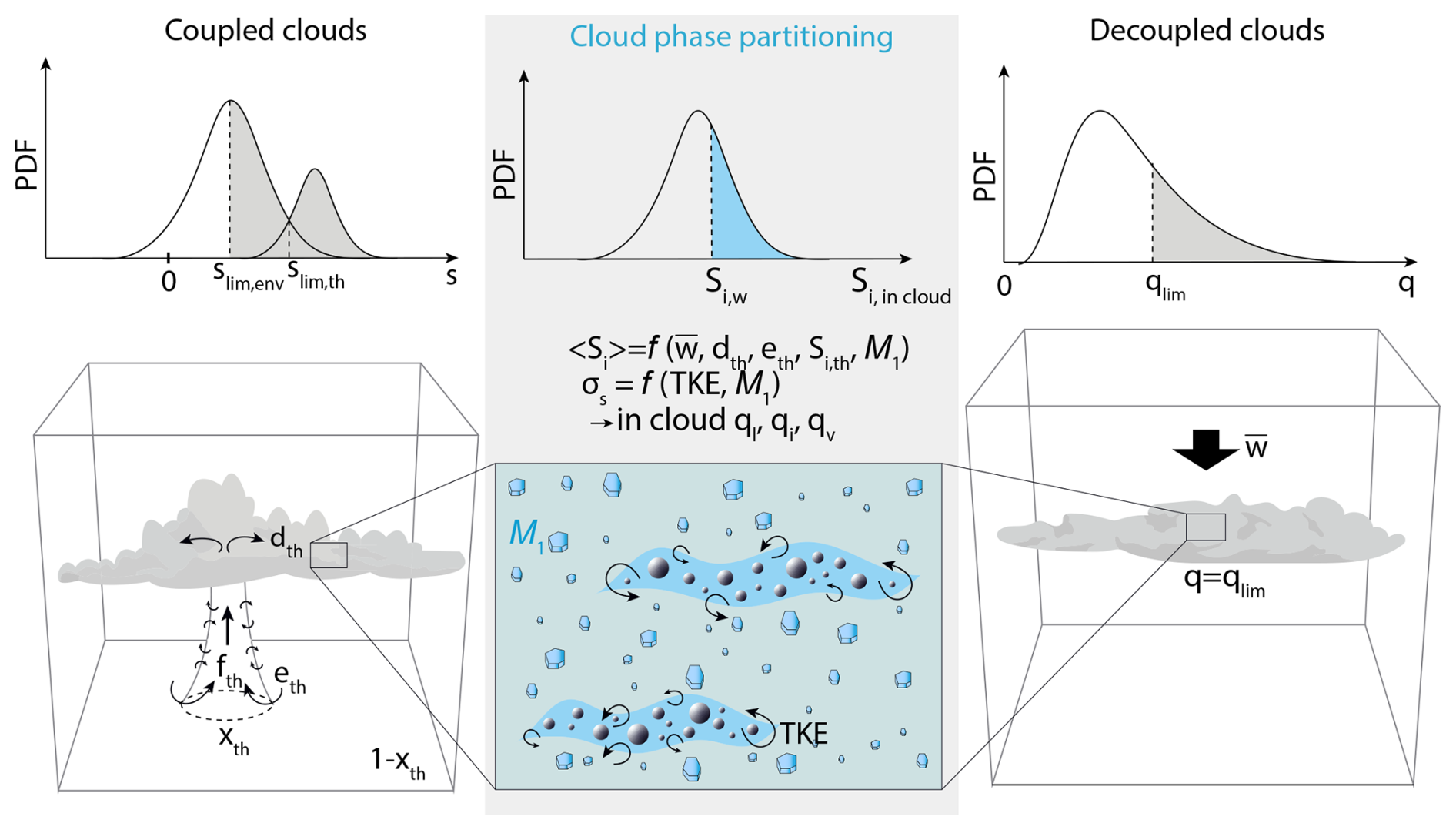Figure 1 summarizes with schematics how the adapted LMDZ cloud scheme works when the new parameterization for phase partitioning is activated, considering separately surface-coupled – that is, when shallow convection is active – and surface-decoupled clouds.