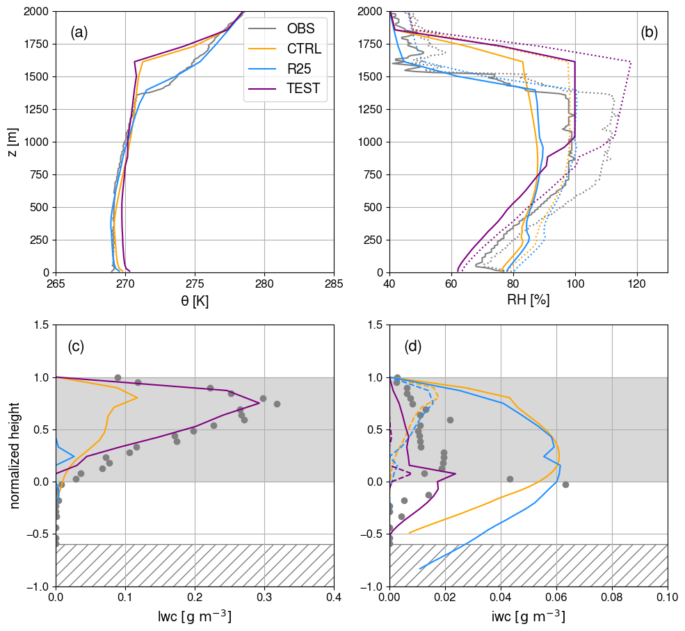Figure 2M-PACE vertical profiles of potential temperature (a), relative humidity with respect to liquid ((b), solid lines) and ice ((b), dotted lines), liquid water content (c) and ice water content including (resp. excluding) snow precipitation in solid (resp. dashed) lines (d). CTRL, R25 and TEST simulations are shown in orange, blue and purple respectively and simulation profiles are averaged over the well-developed phase of the clouds, namely between 01:00 and 05:00 UTC, 10 October 2024. In panels (a) and (b), observations (in grey) correspond to the radiosonde launched at Utqiagvik, Alaska at 17:00 UTC, 9 October. In panels (c) and (d), the vertical axis used is the normalized height – where −1 is the surface, 0 is cloud base, and 1 is cloud top – for consistency with Klein et al. (2009) and grey shading indicates the location of the cloud. Observations (grey dots) correspond to airborne measurements that do not extend below −0.6 in normalized height, hence the hashed area in panel (c) and (d). Note that in LMDZ, the relative humidity corresponds to a diagnostic variable computed as the ratio of the mean specific humidity in the mesh to the saturation specific humidity at the mean temperature in the mesh, the relative humidity with respect to liquid being capped at 100 % as cloud liquid water forms through adjustment process.
