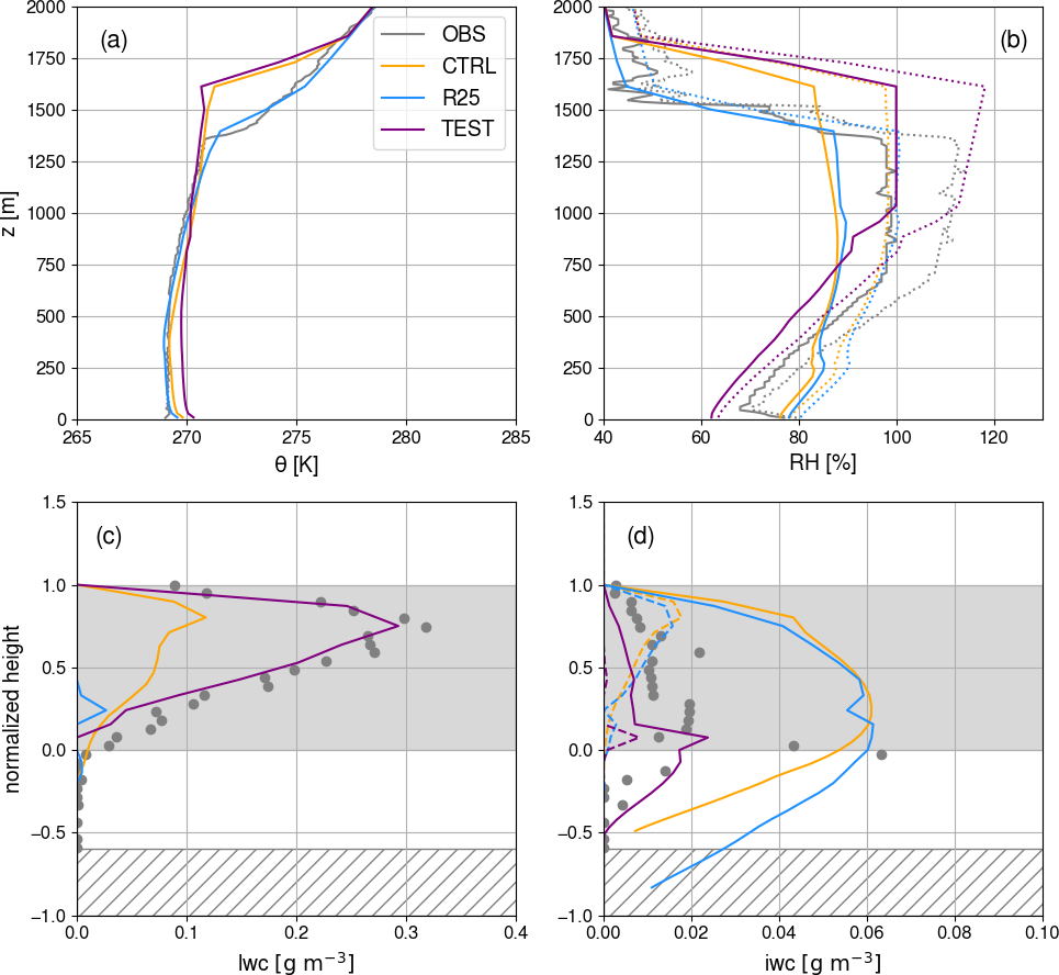 The CTRL simulation (orange curves) reproduces a cloud of mixed-phase composition, nonetheless with a strong underestimation of the LWC (Fig. 2c) and an overestimation of the IWC (Fig. 2d). As the cloud formation in the CTRL configuration corresponds to a saturation adjustment process with respect to the ice phase, the model unrealistically simulates a cloud layer close to saturation with respect to ice (Fig. 2b). The profile of potential temperature reveals an increase in boundary layer height with respect to the initial conditions of the simulation that correspond to the observed potential temperature and humidity profiles (Fig. 2a).
